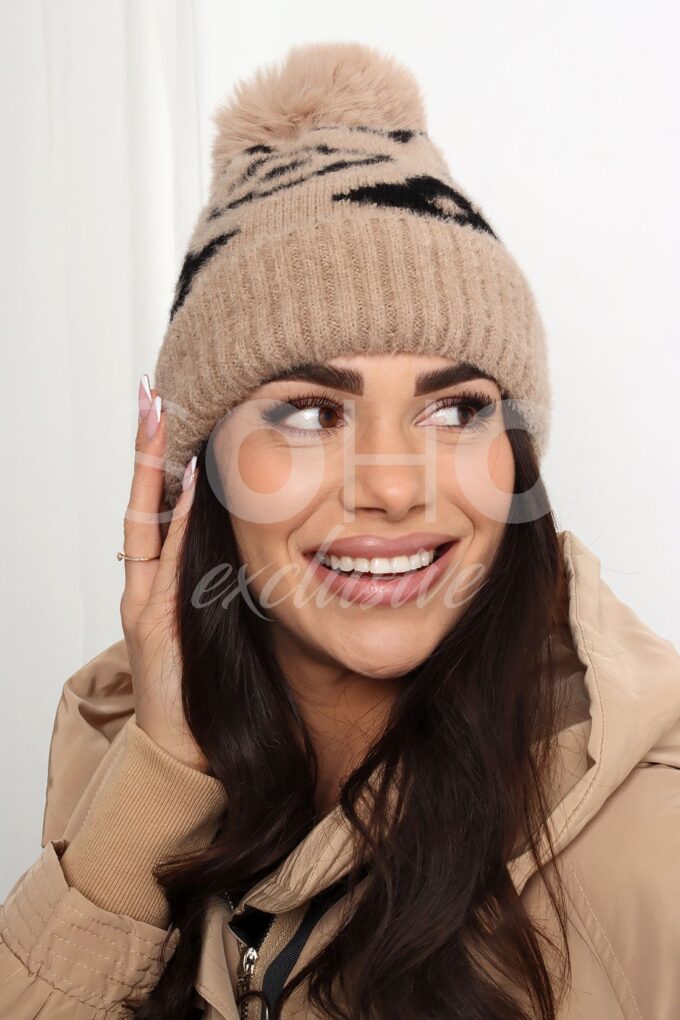 Czapka ciepła zimowa polski wygodna gruba kobieca karmelowa z białym 2503