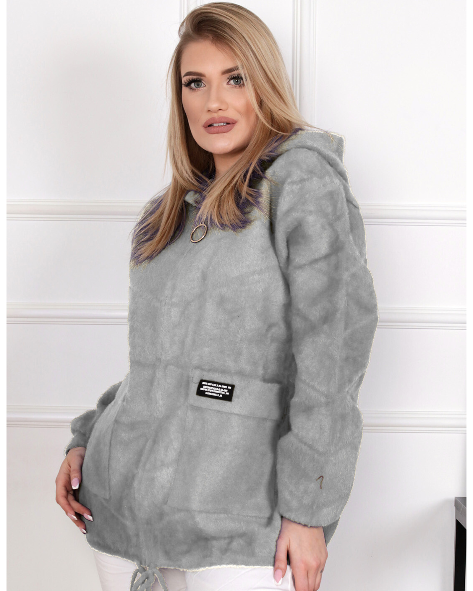 Alpaka damska płaszcz kurtka sweter ciepła krótka kaptur suwak wygodna szara 2142