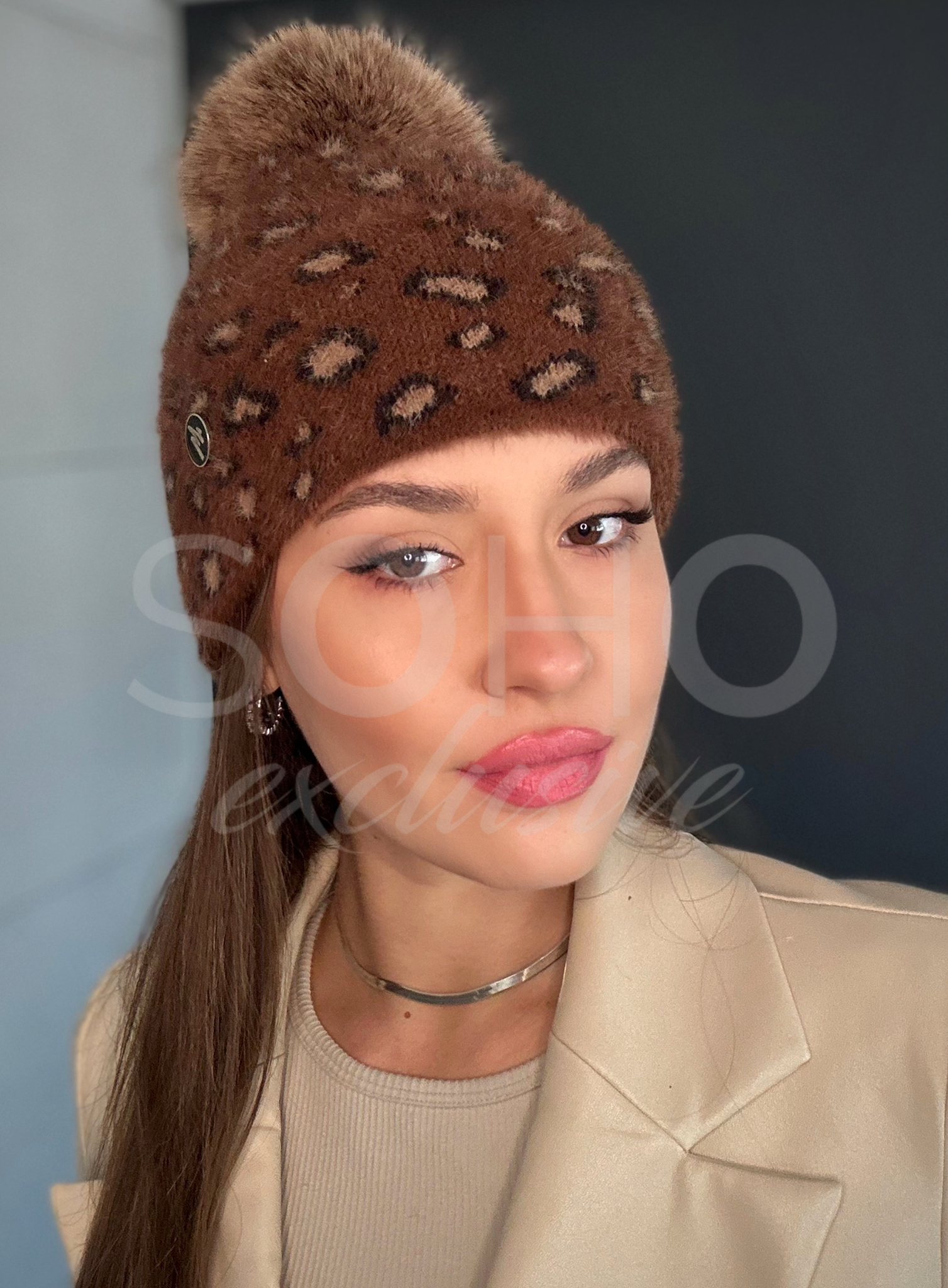 Czapka wywijana, z pięknym pomponem oraz subtelnym logowaniem.