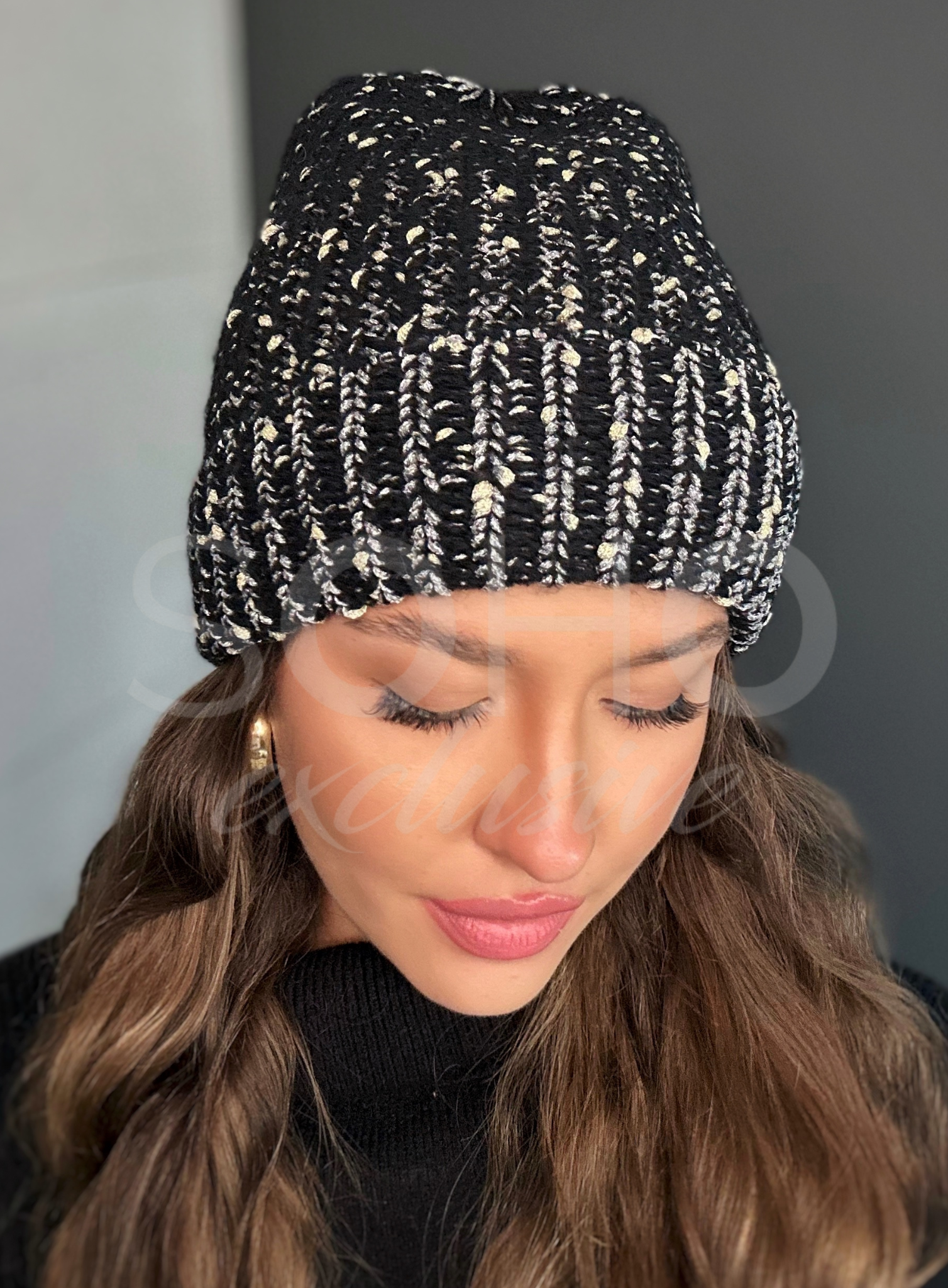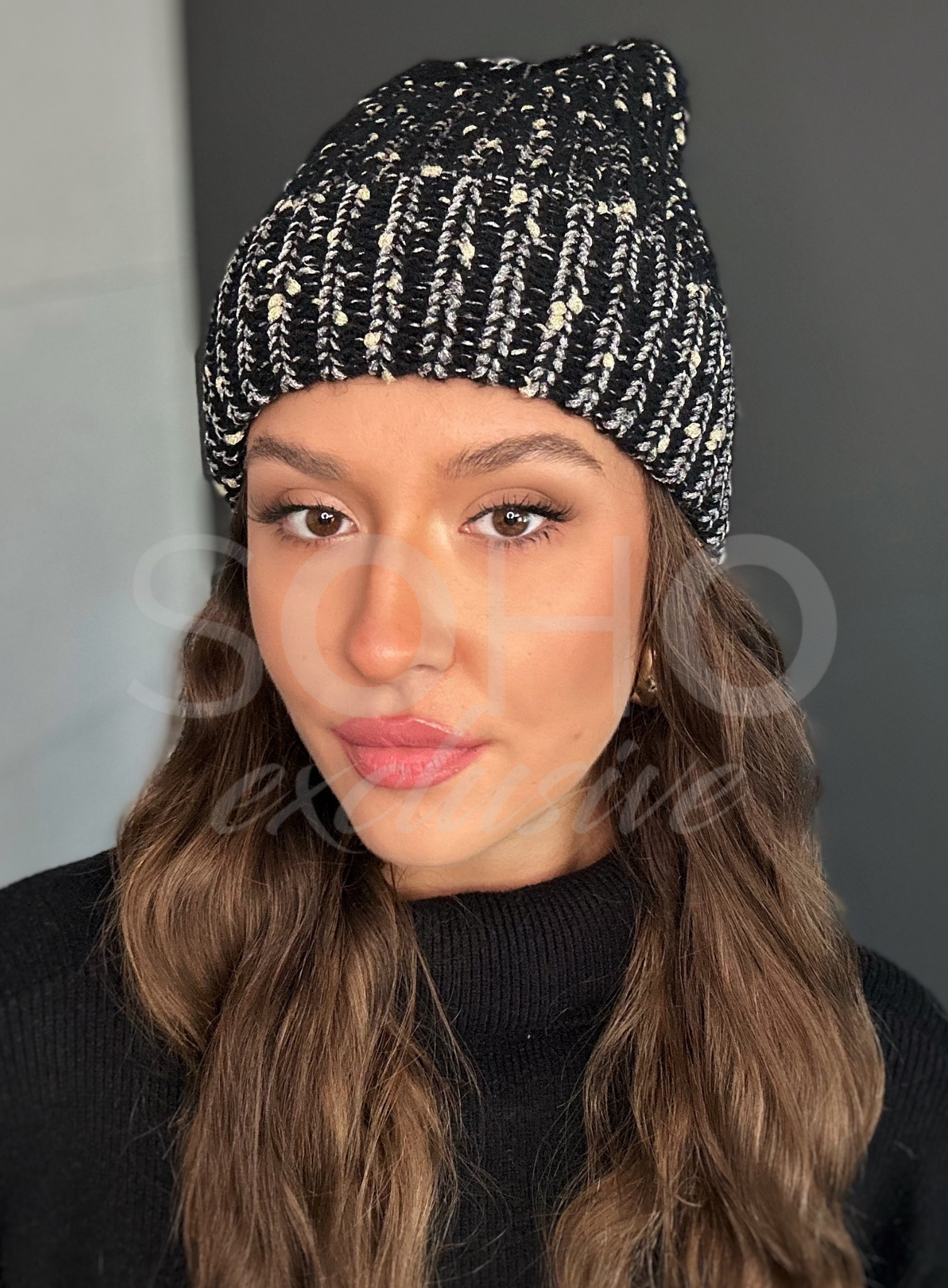 Czapka typu beanie/krasnal, wywijana, delikatnie opadająca.