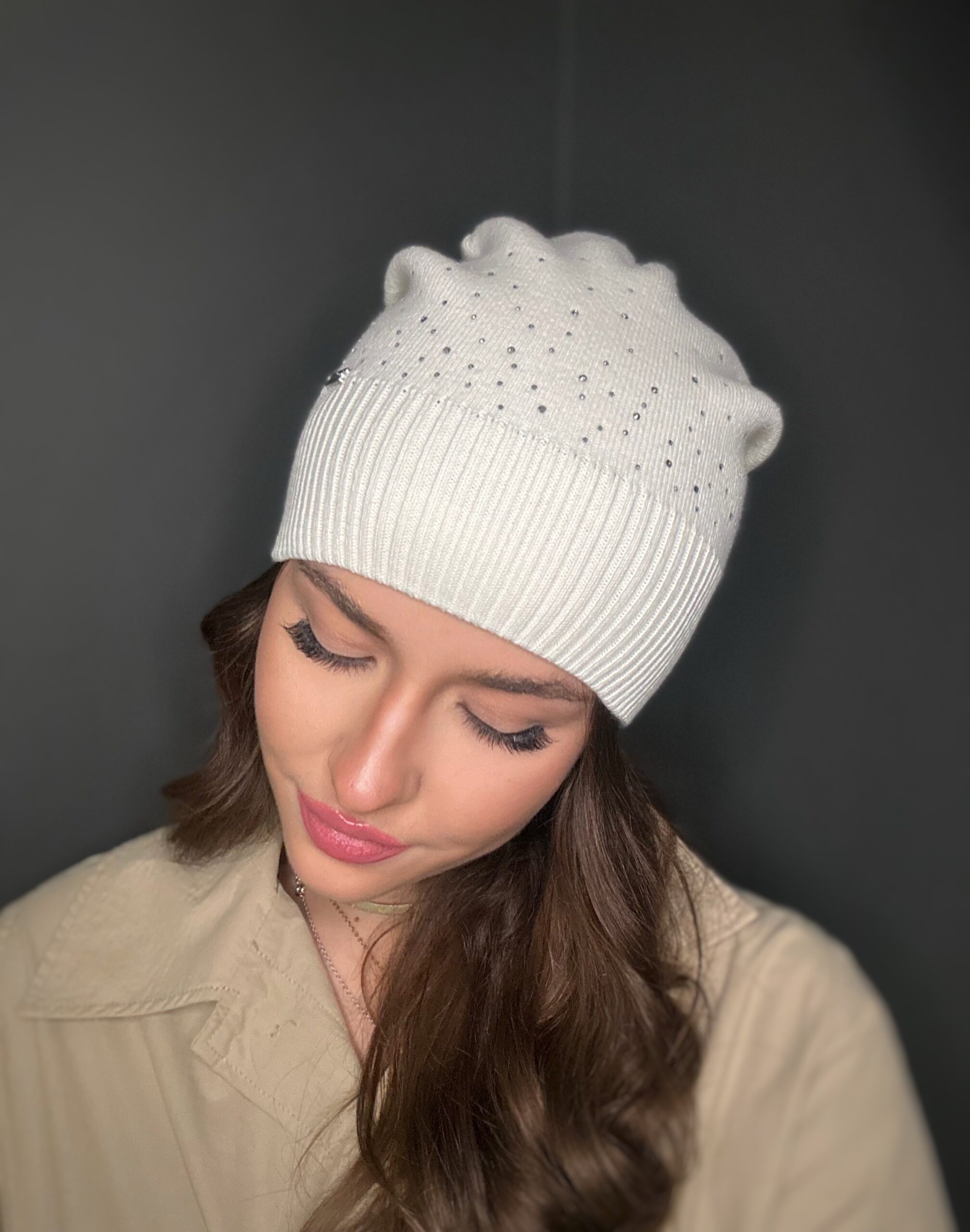 Czapka niewywijana, delikatnie opadająca, z ciekawym szyciem z tyłu, delikatnym ściągaczem z przodu. logowaną metką oraz subtelnymi zdobieniami.