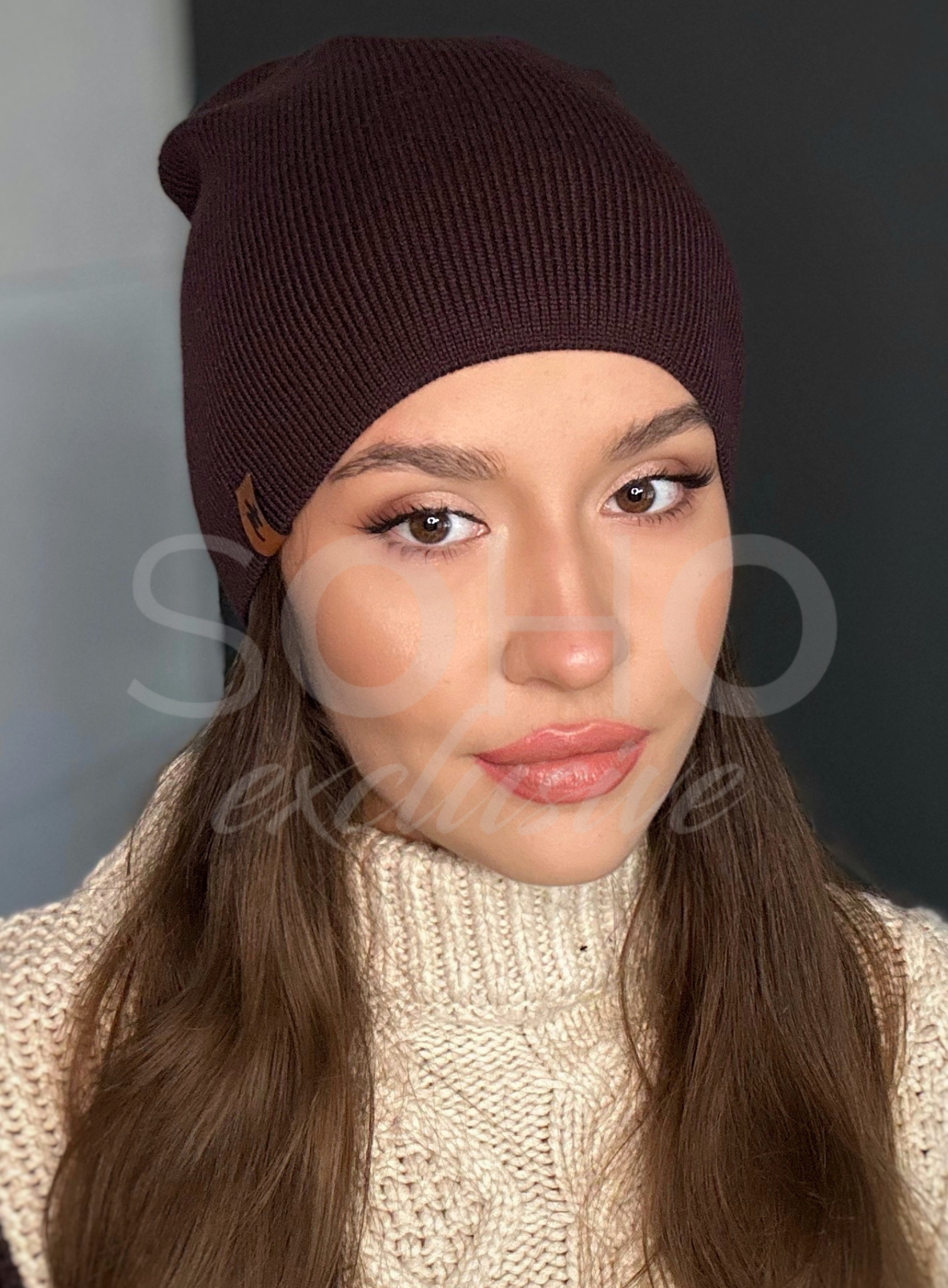 Czapka typu beanie/krasnal, delikatnie opadająca, z subtelnym logowaniem.