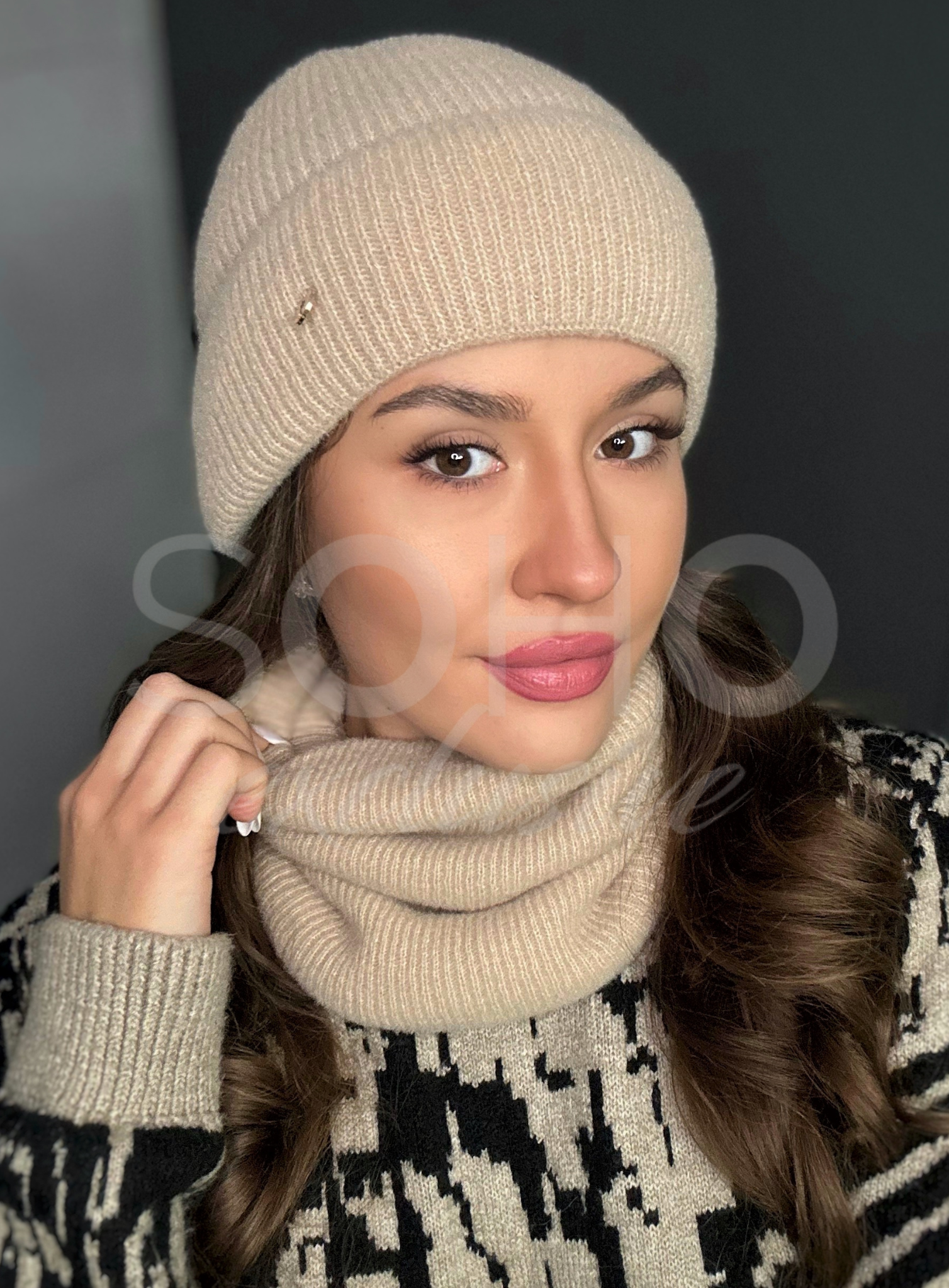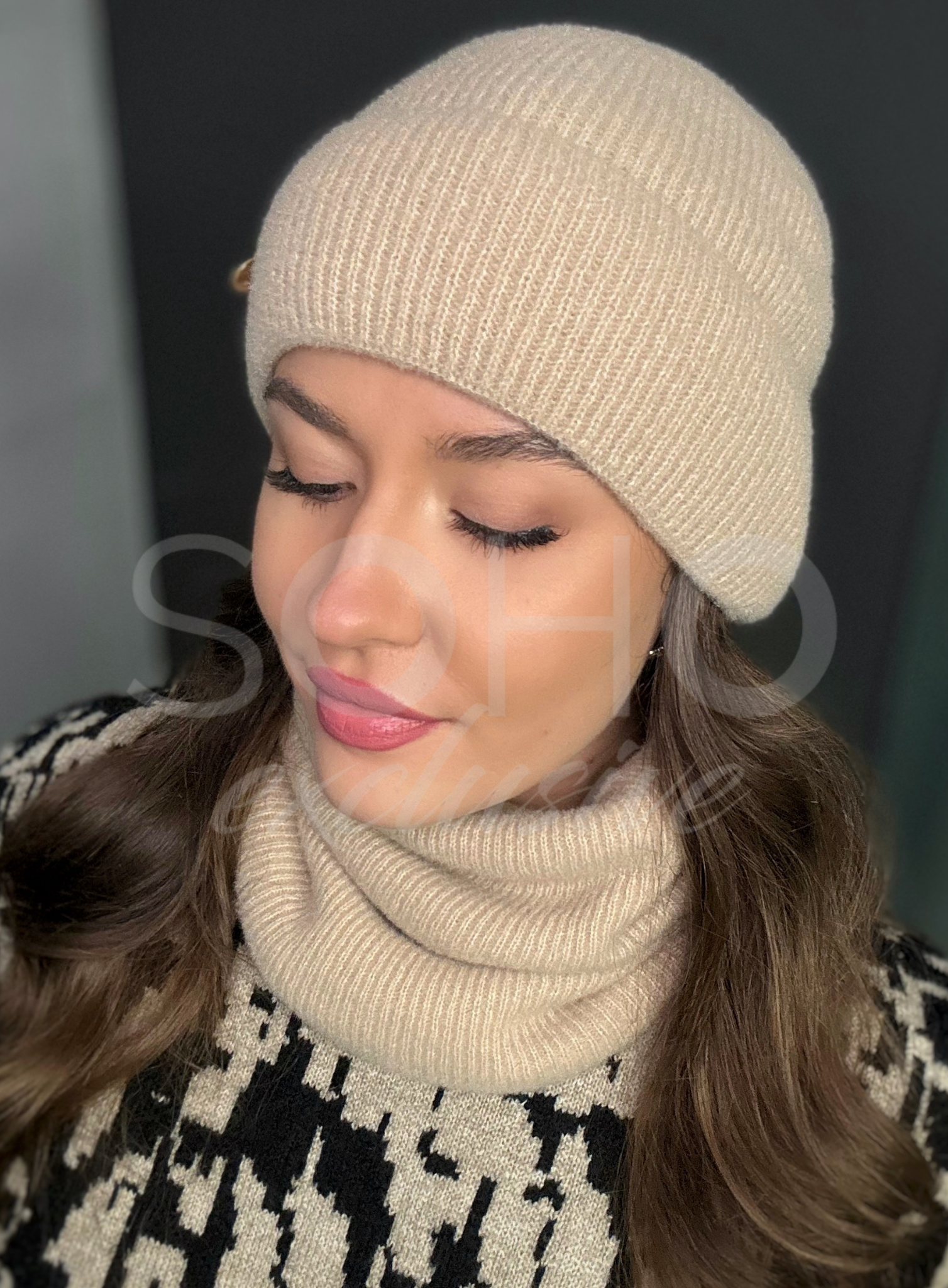 Czapka typu beanie/krasnal, delikatnie opadająca, wywijana, z subtelnym logowaniem.