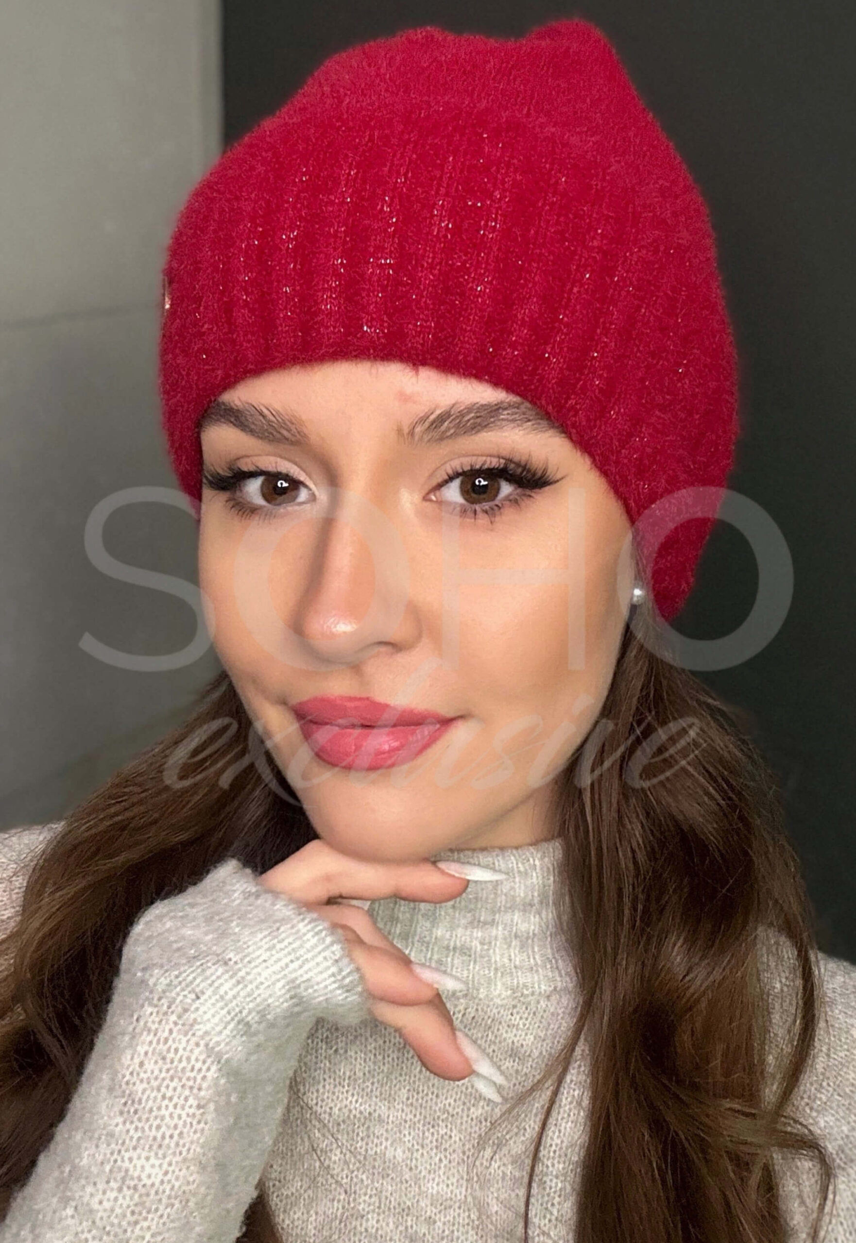 Czapka typu beanie/krasnal, delikatnie opadająca, wywijana, z pięknie połyskującą nitką.
