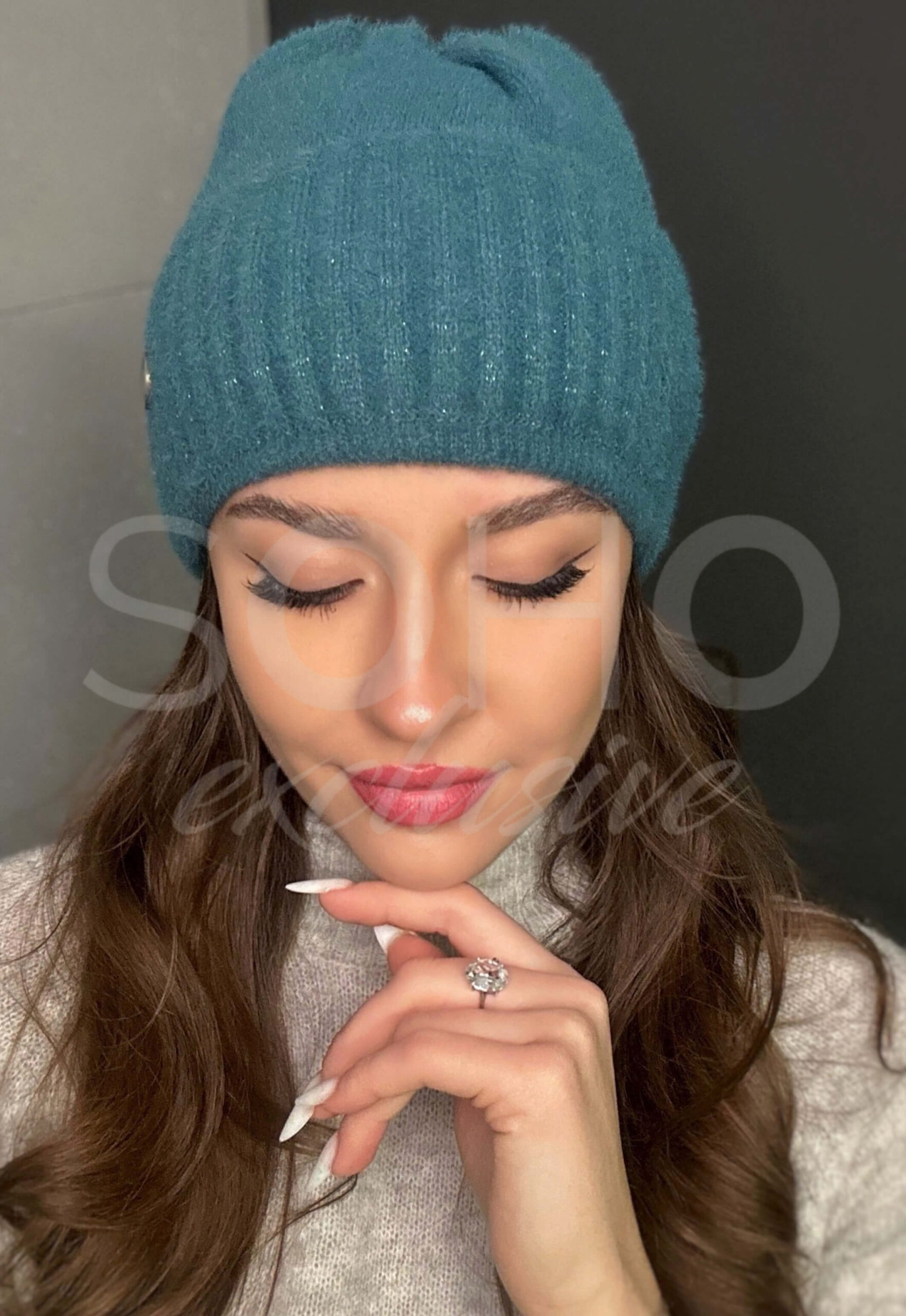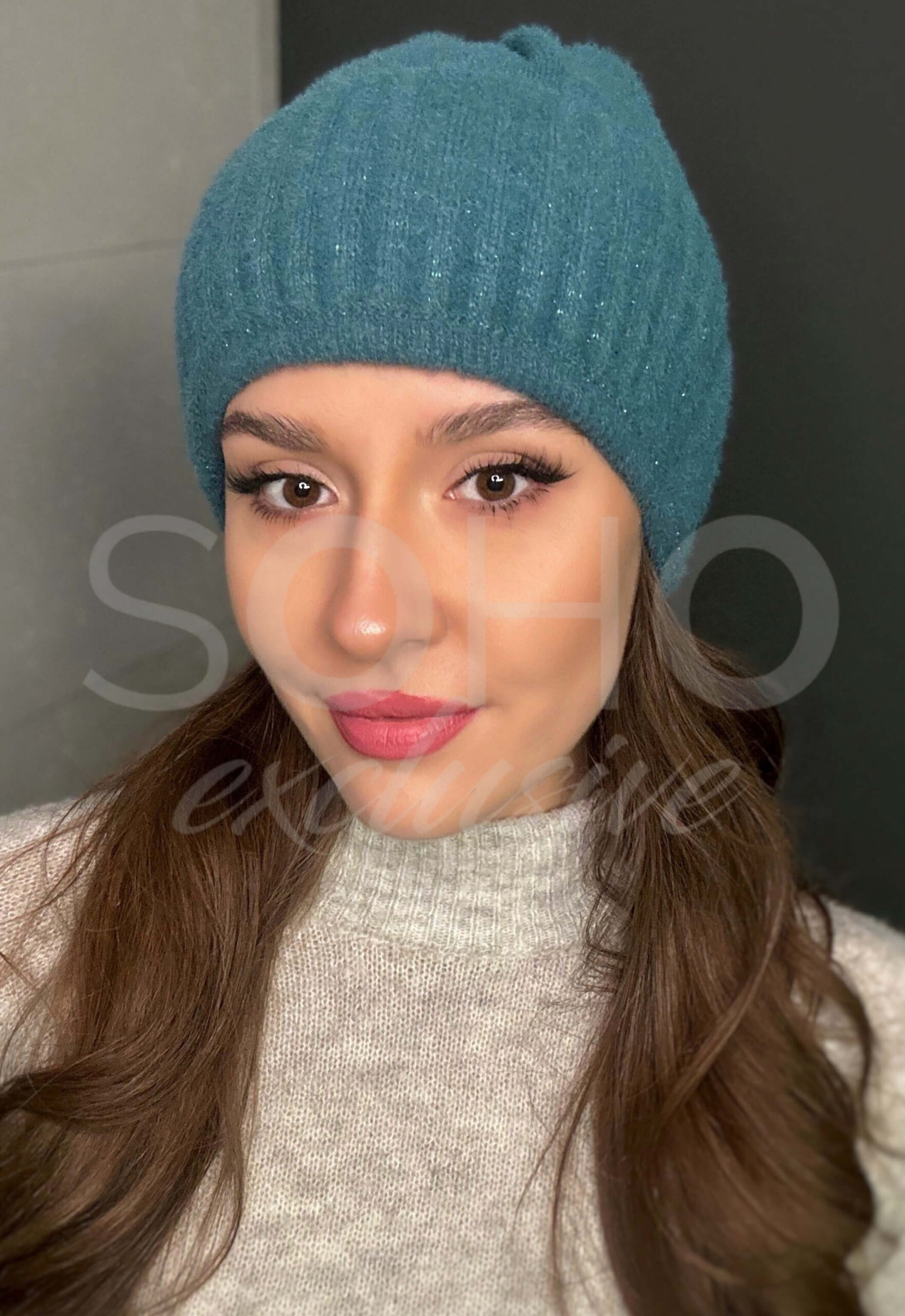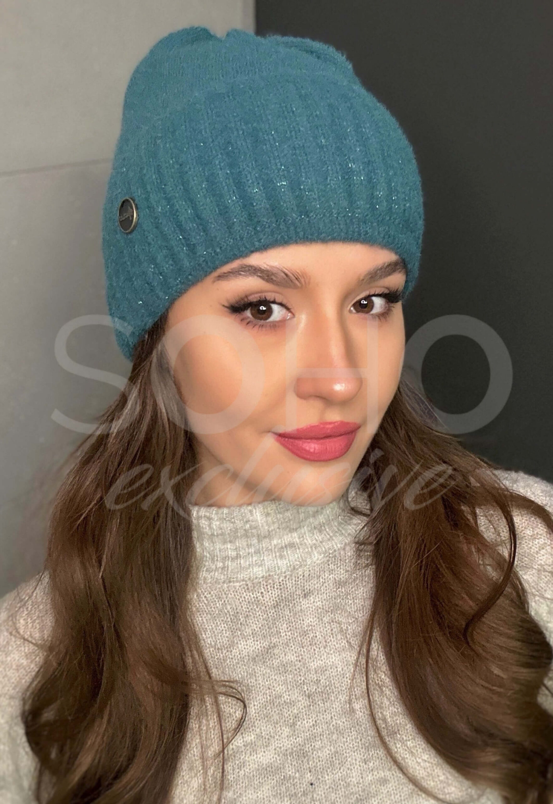 Czapka typu beanie/krasnal, delikatnie opadająca, wywijana, z pięknie połyskującą nitką.