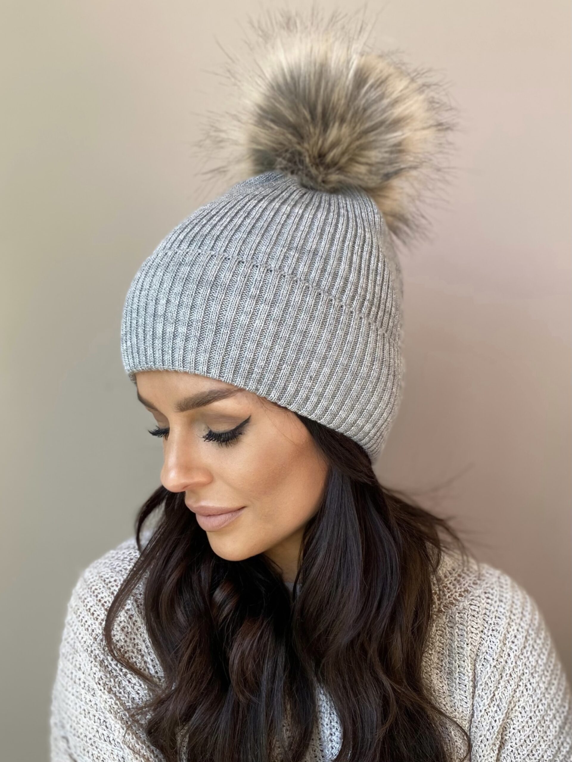 Czapka typu beanie/krasnal, delikatnie opadająca, wywijana, z duuużym pomponem.