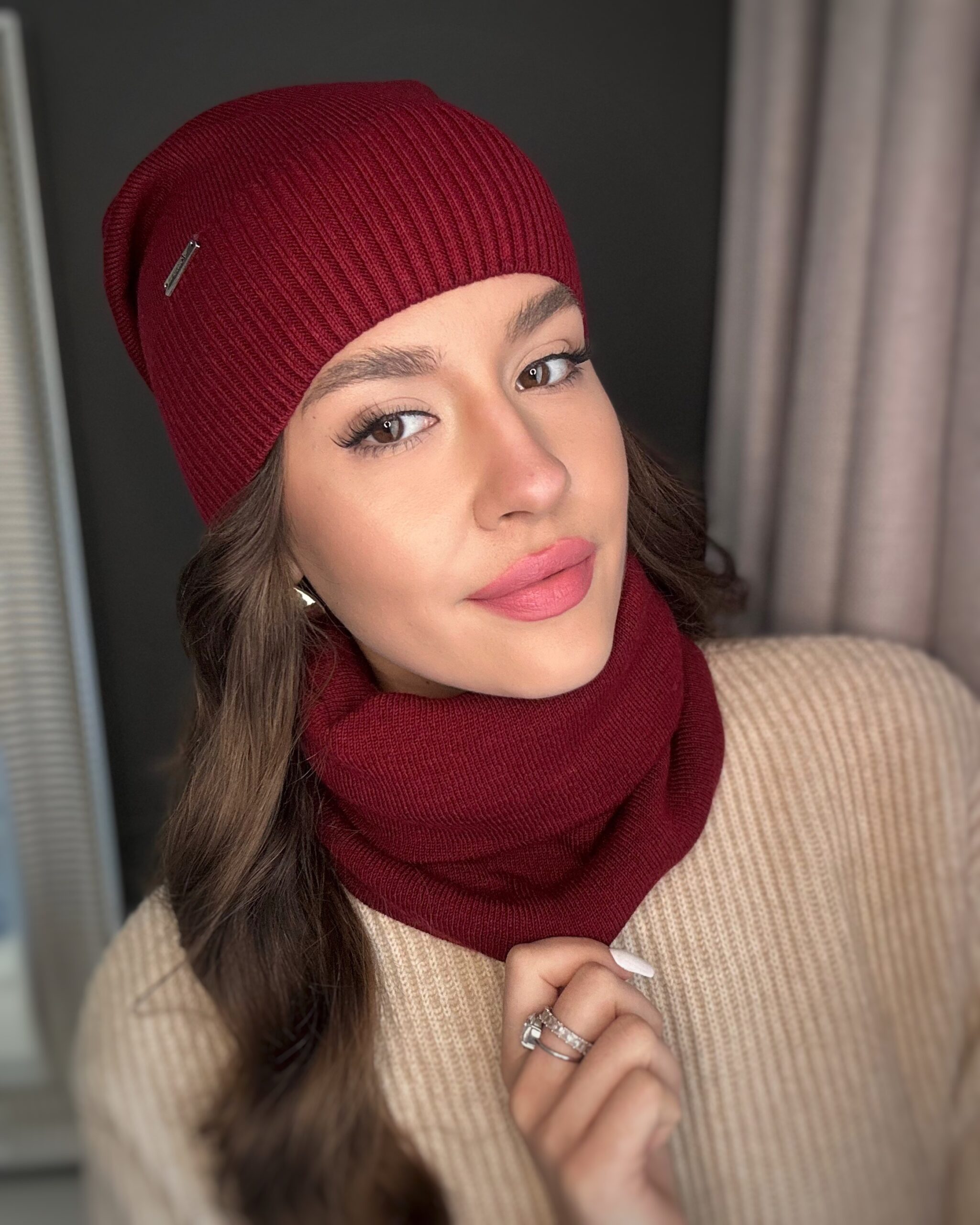 Komin wykonany z podwójnego, uciągliwego, przyjemnego materiału, z ciekawą naszywką.