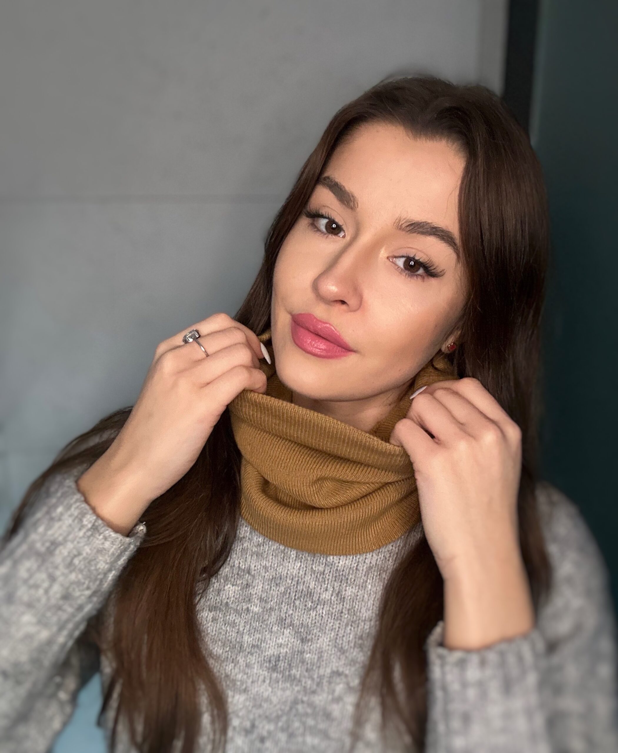 Komin wykonany z podwójnego, uciągliwego, przyjemnego materiału, z ciekawą naszywką.