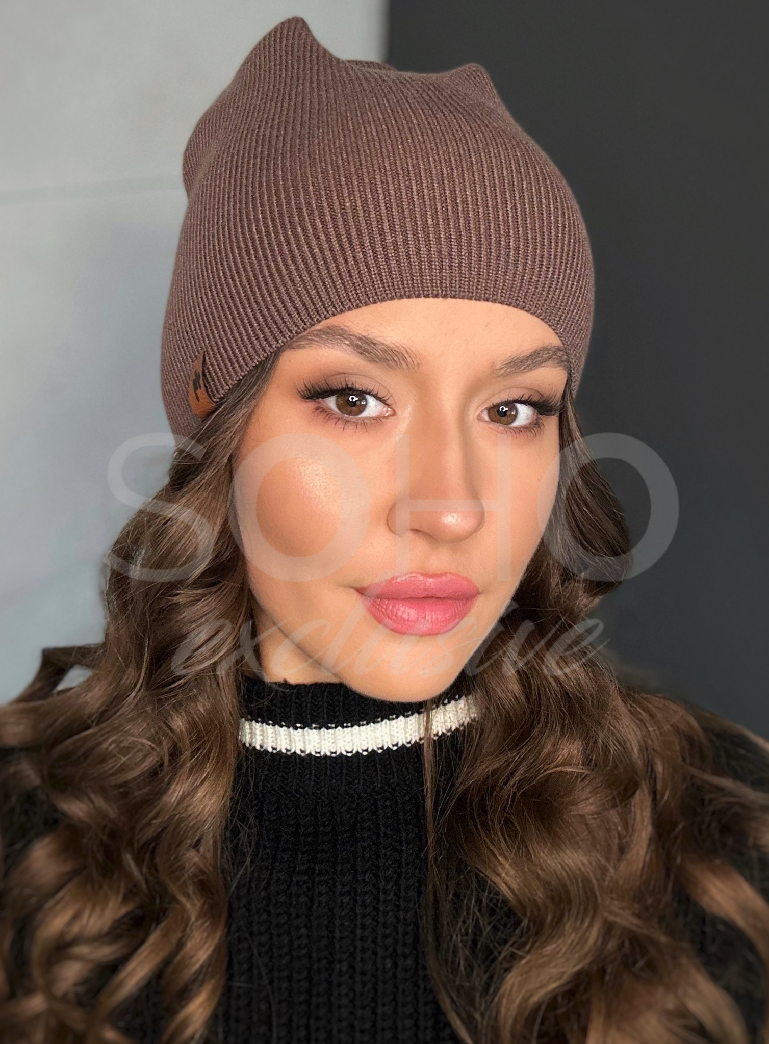 Czapka typu beanie/krasnal, delikatnie opadająca, z subtelnym logowaniem.