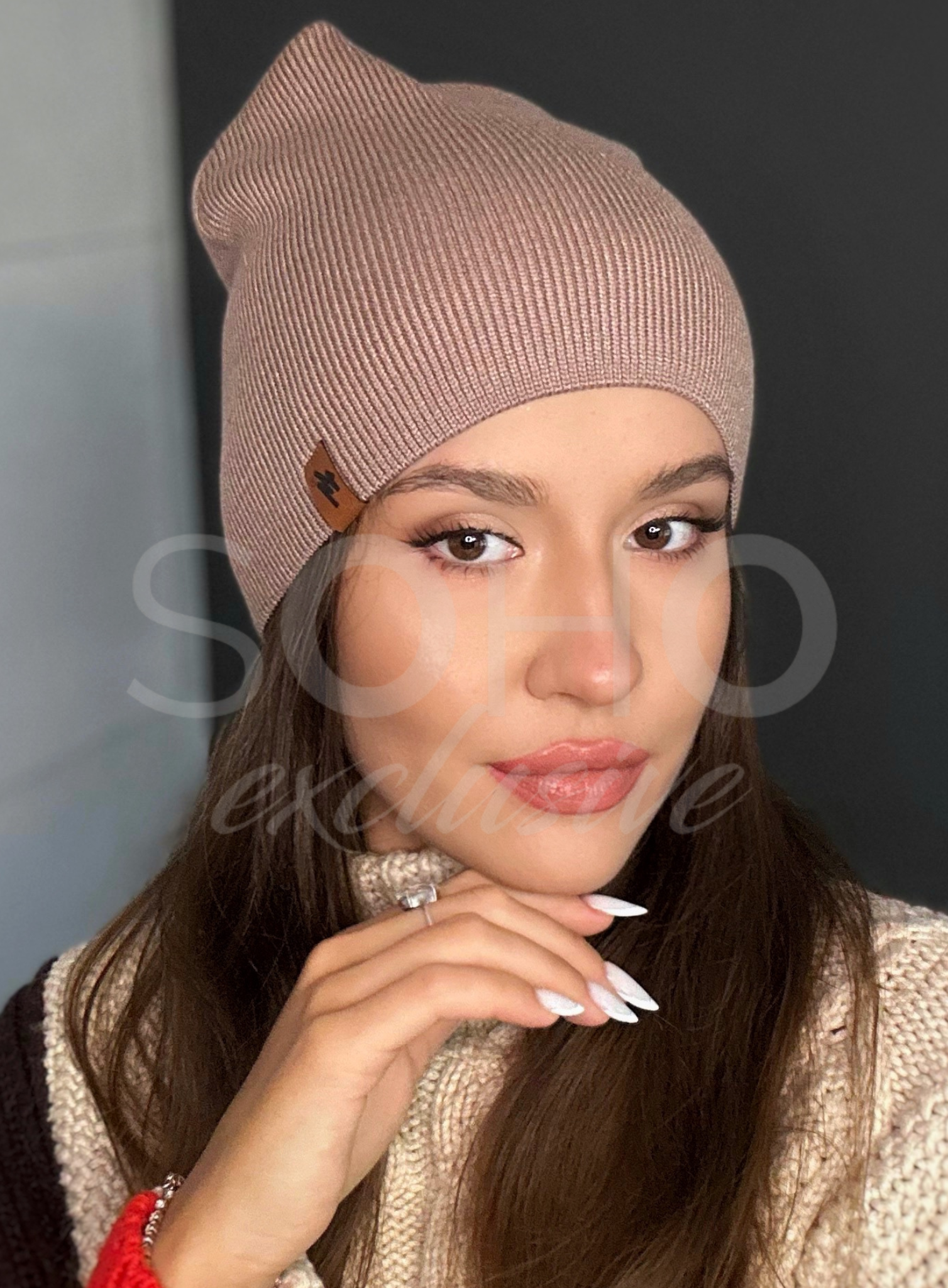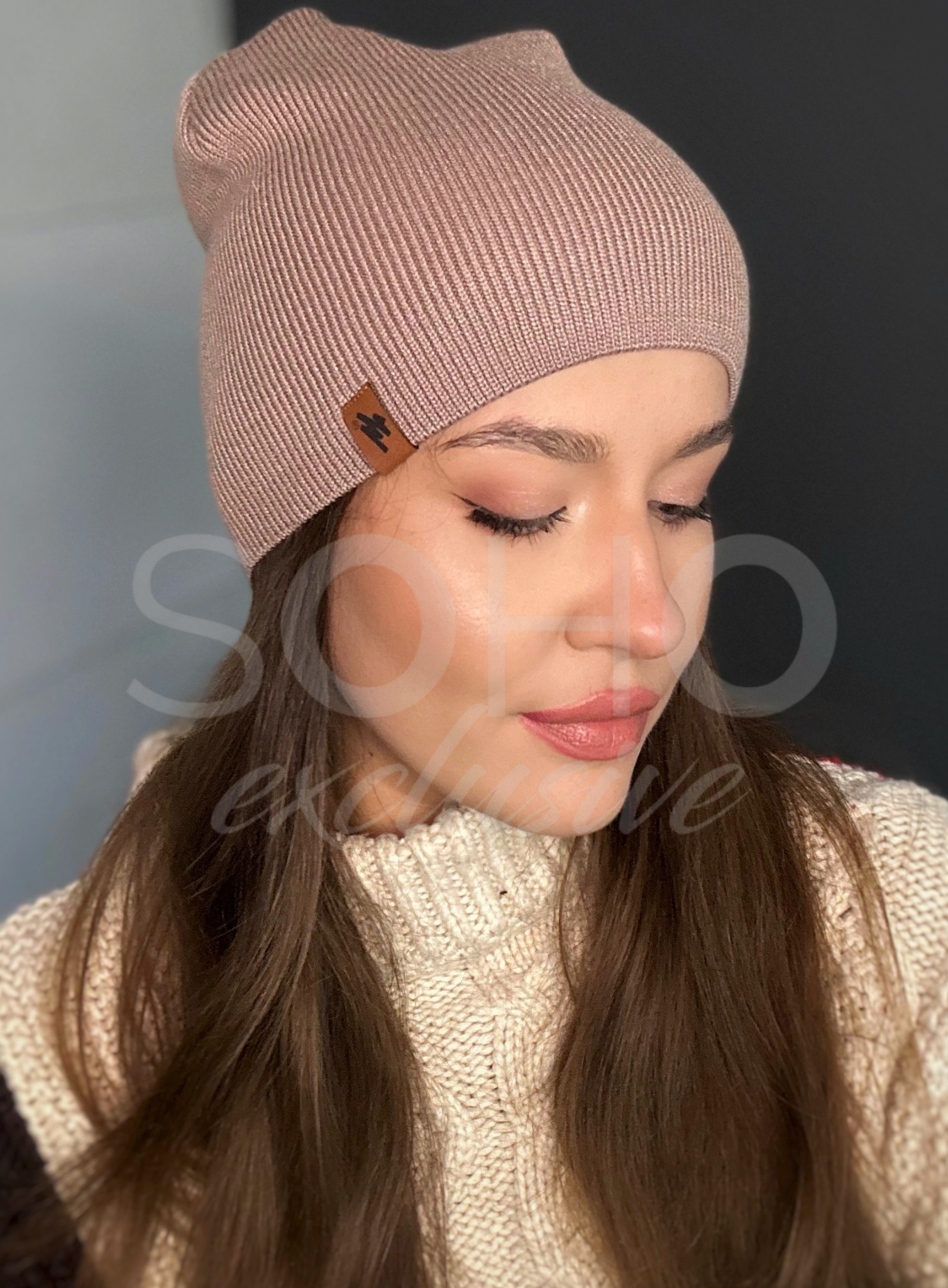 Czapka typu beanie/krasnal, delikatnie opadająca, z subtelnym logowaniem.