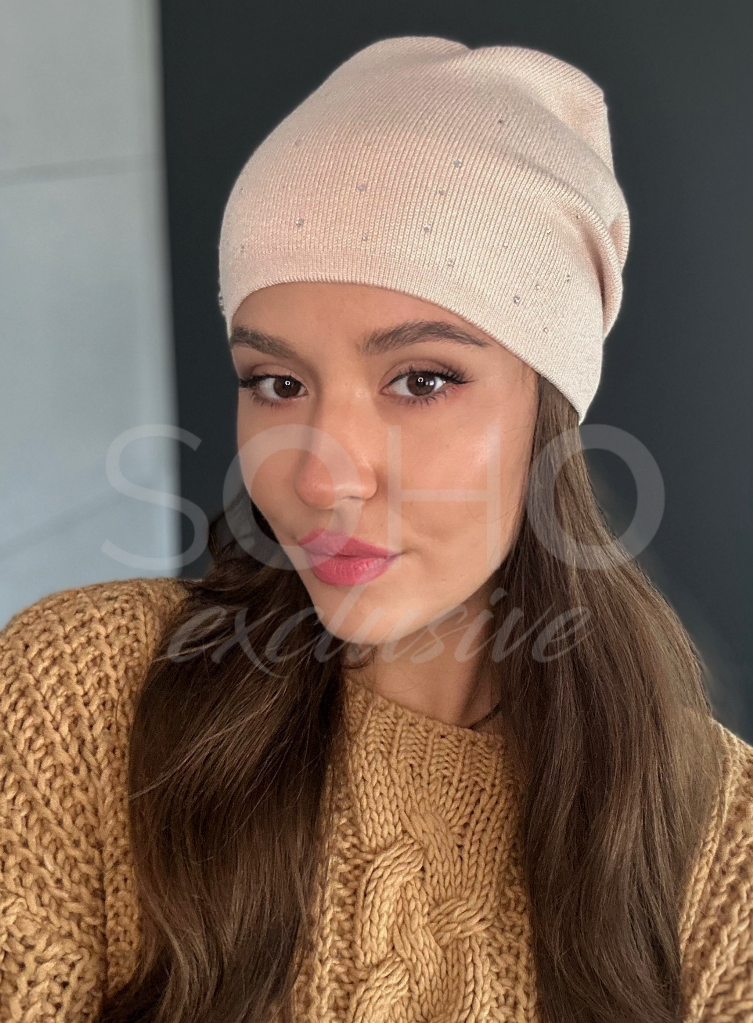 Czapka typu beanie/krasnal, delikatnie opadająca, z zakładkami, z subtelnym zdobieniem i przepięknym logowaniem.
