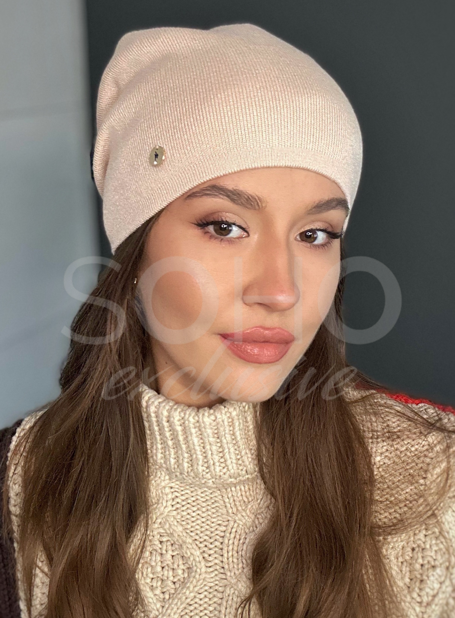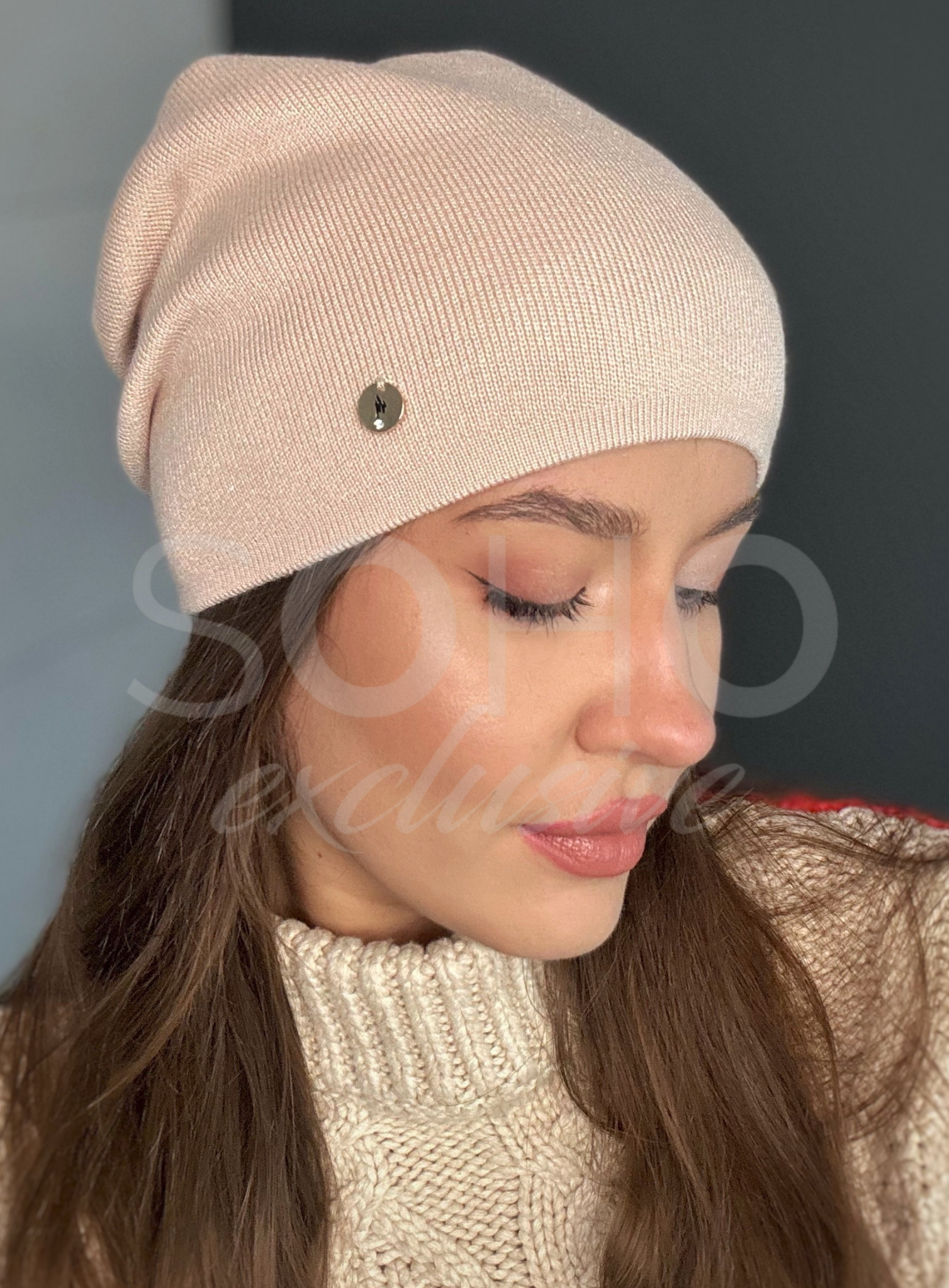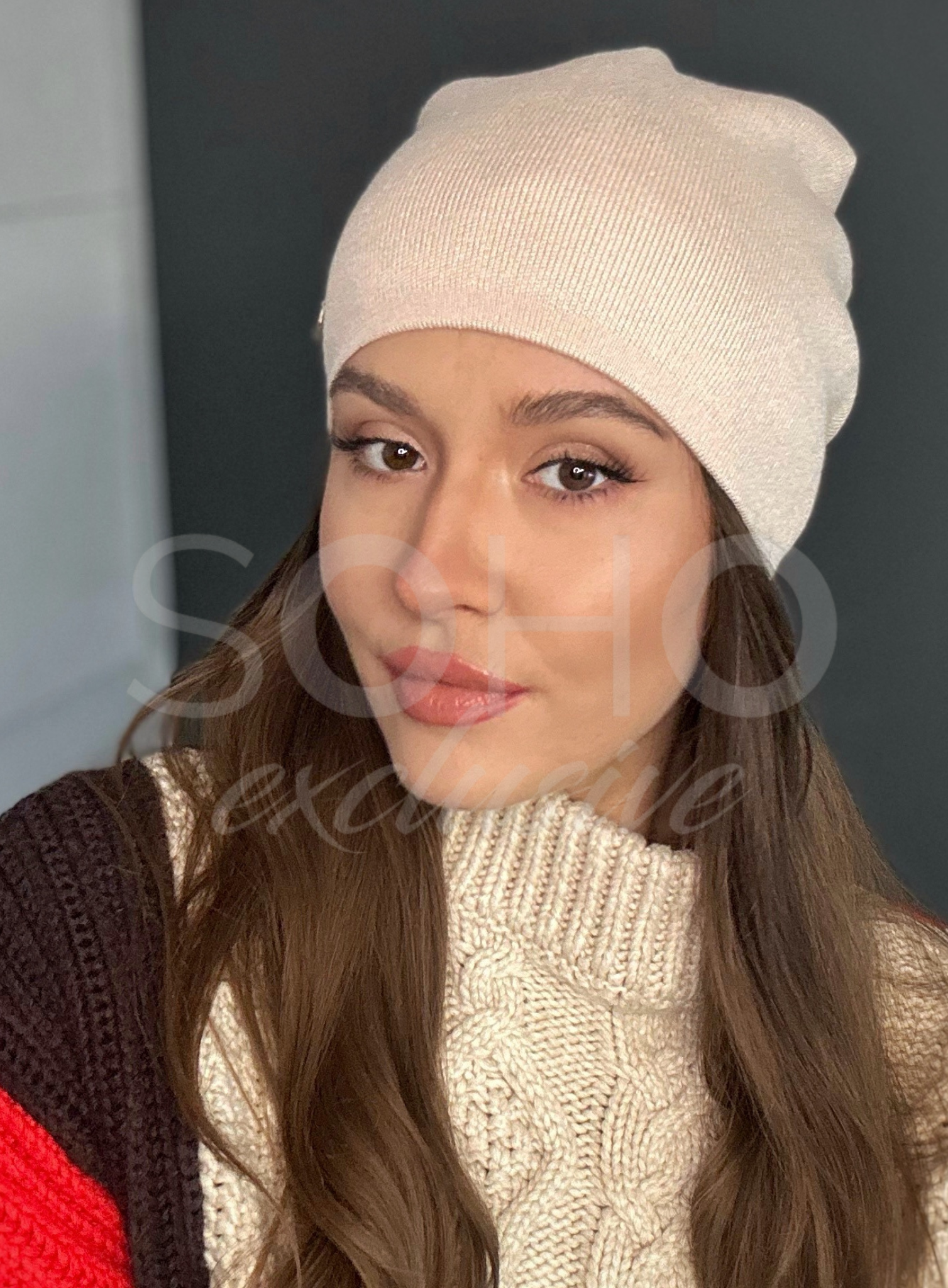 Czapka typu beanie/krasnal, delikatnie opadająca, z zakładkami, z subtelnym zdobieniem i przepięknym logowaniem.