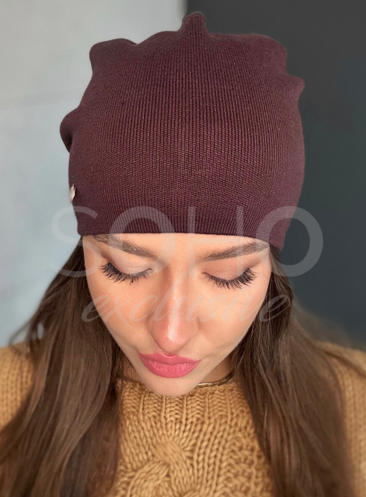 Czapka typu beanie/krasnal, delikatnie opadająca, z zakładkami, z subtelnym zdobieniem i przepięknym logowaniem.