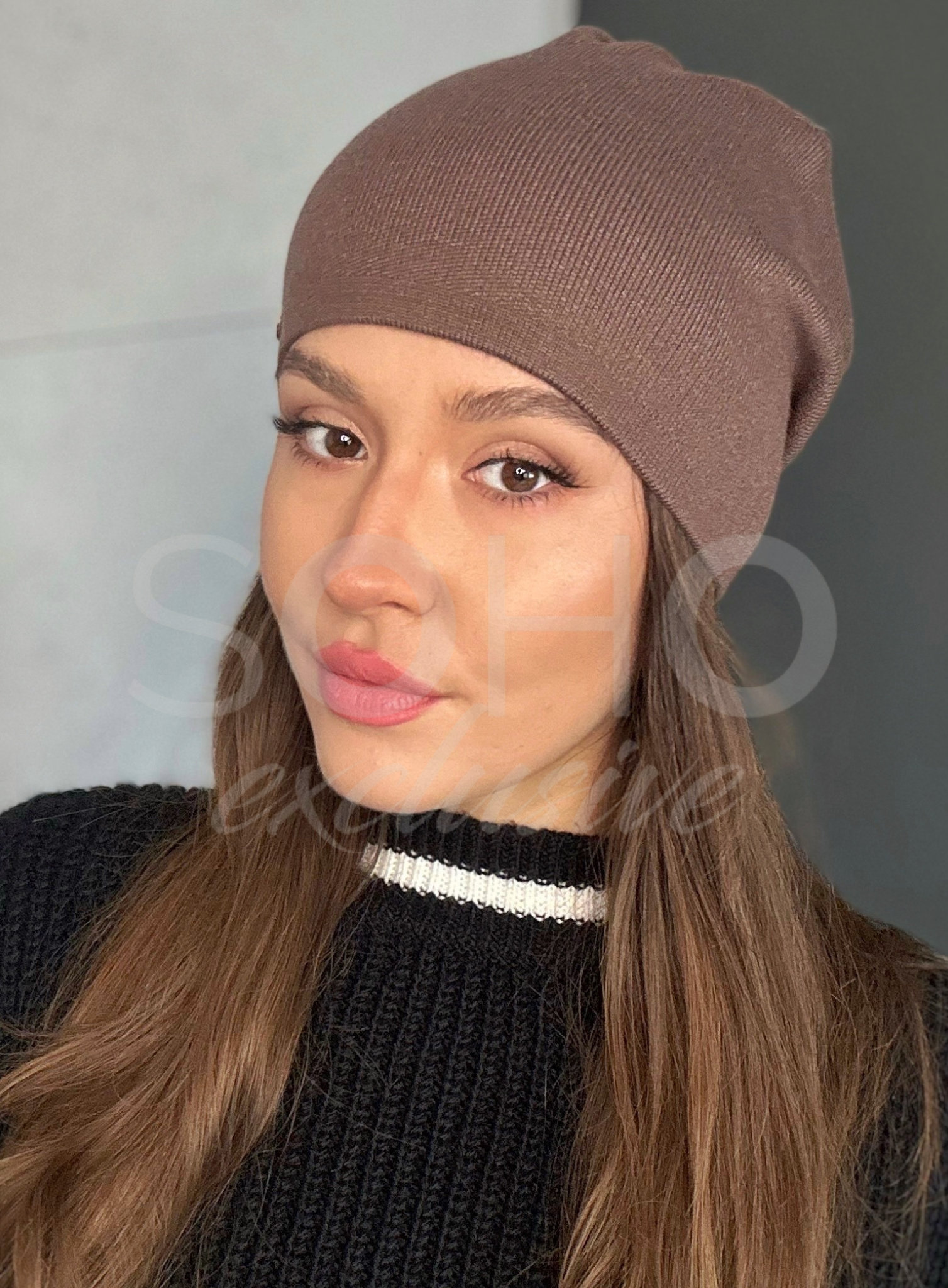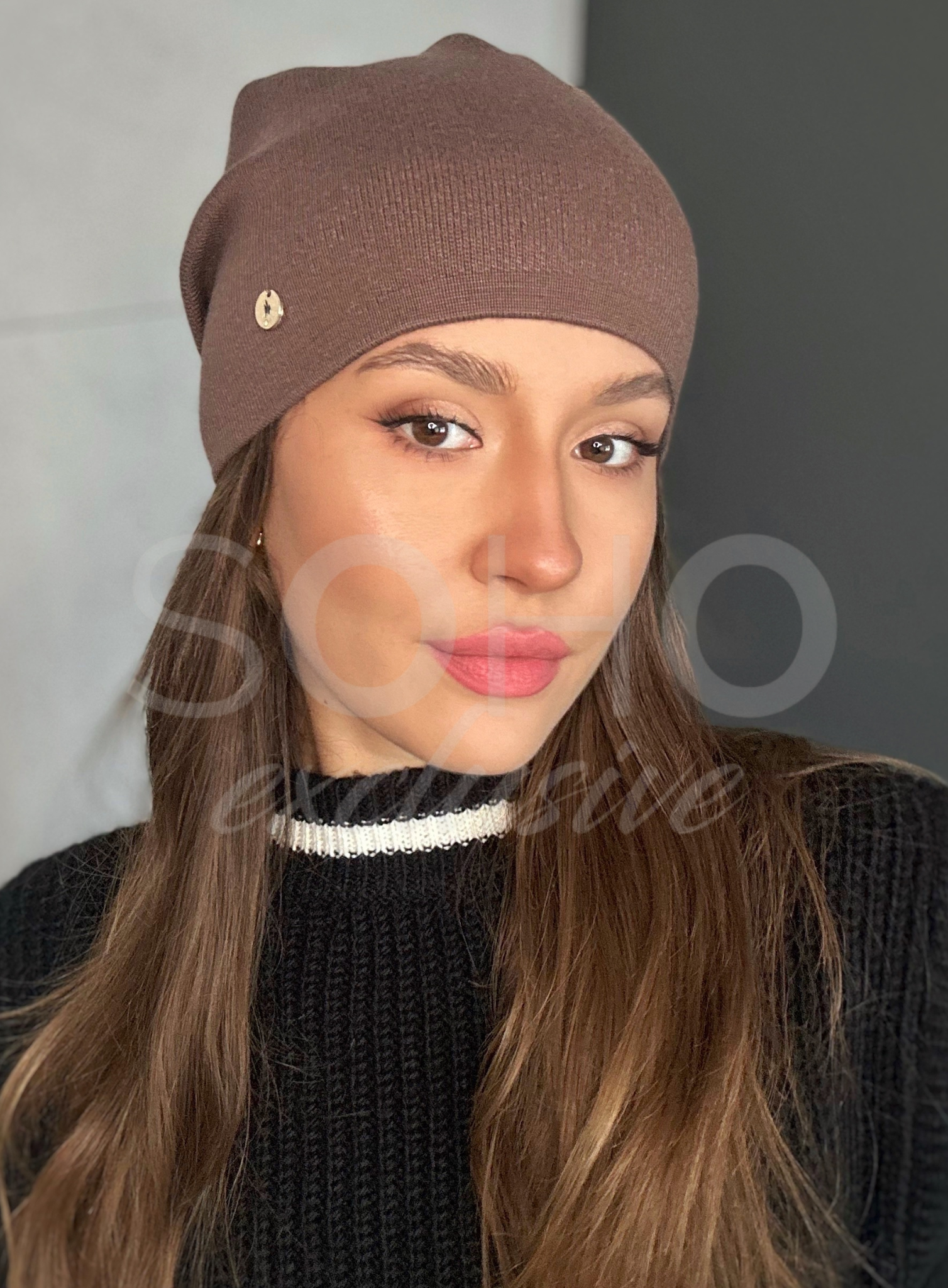 Czapka typu beanie/krasnal, delikatnie opadająca, z zakładkami, z subtelnym zdobieniem i przepięknym logowaniem.