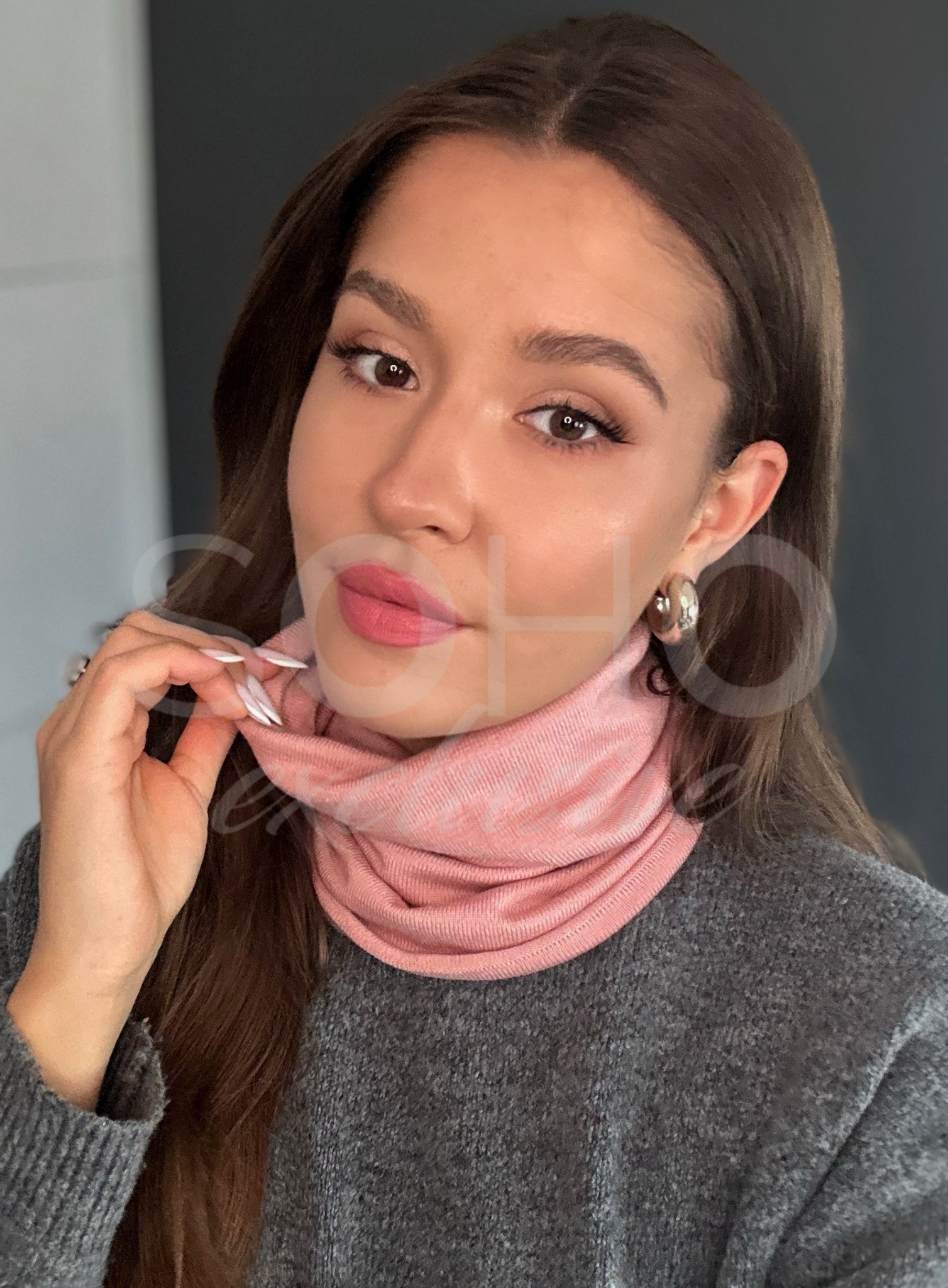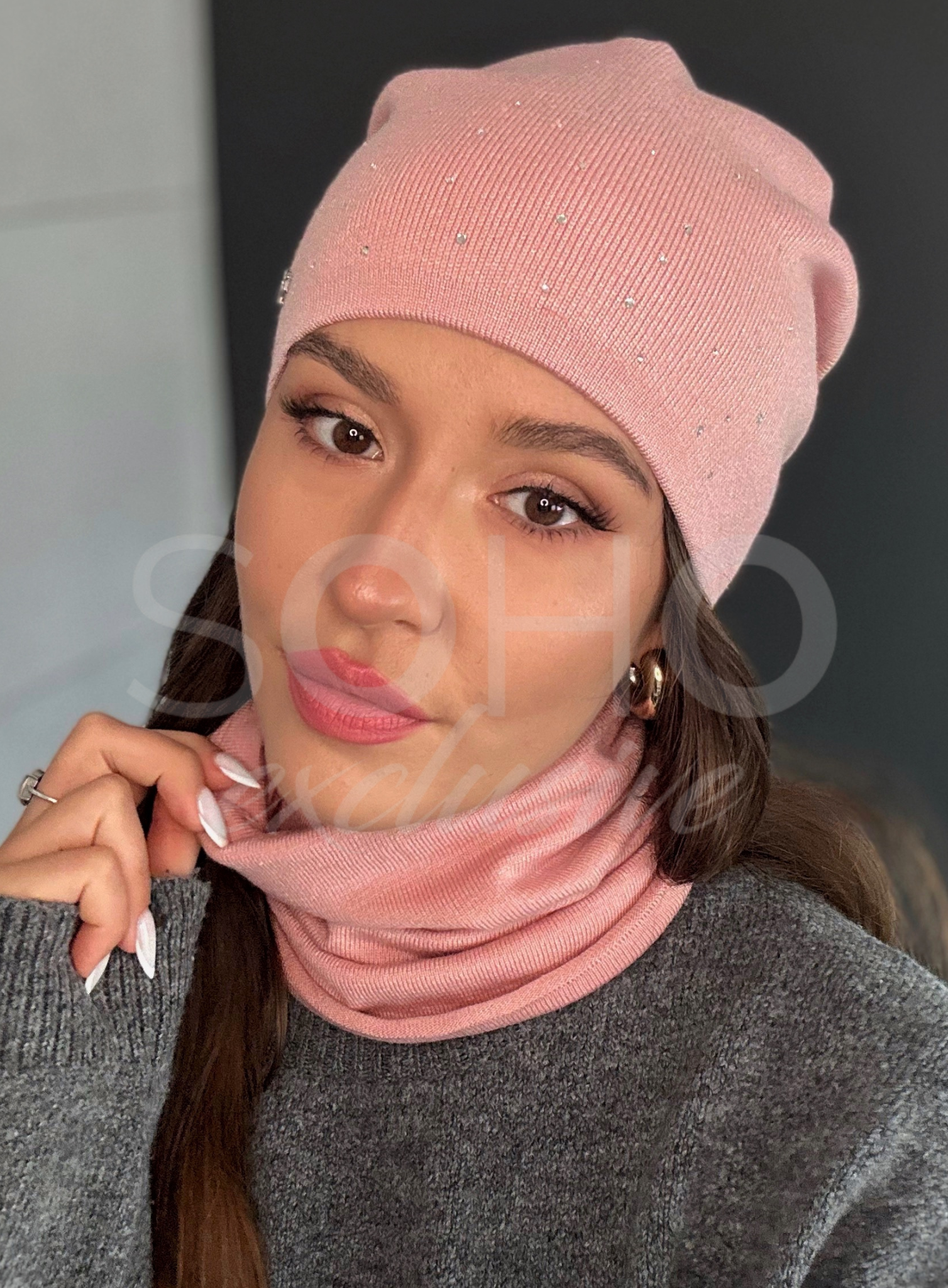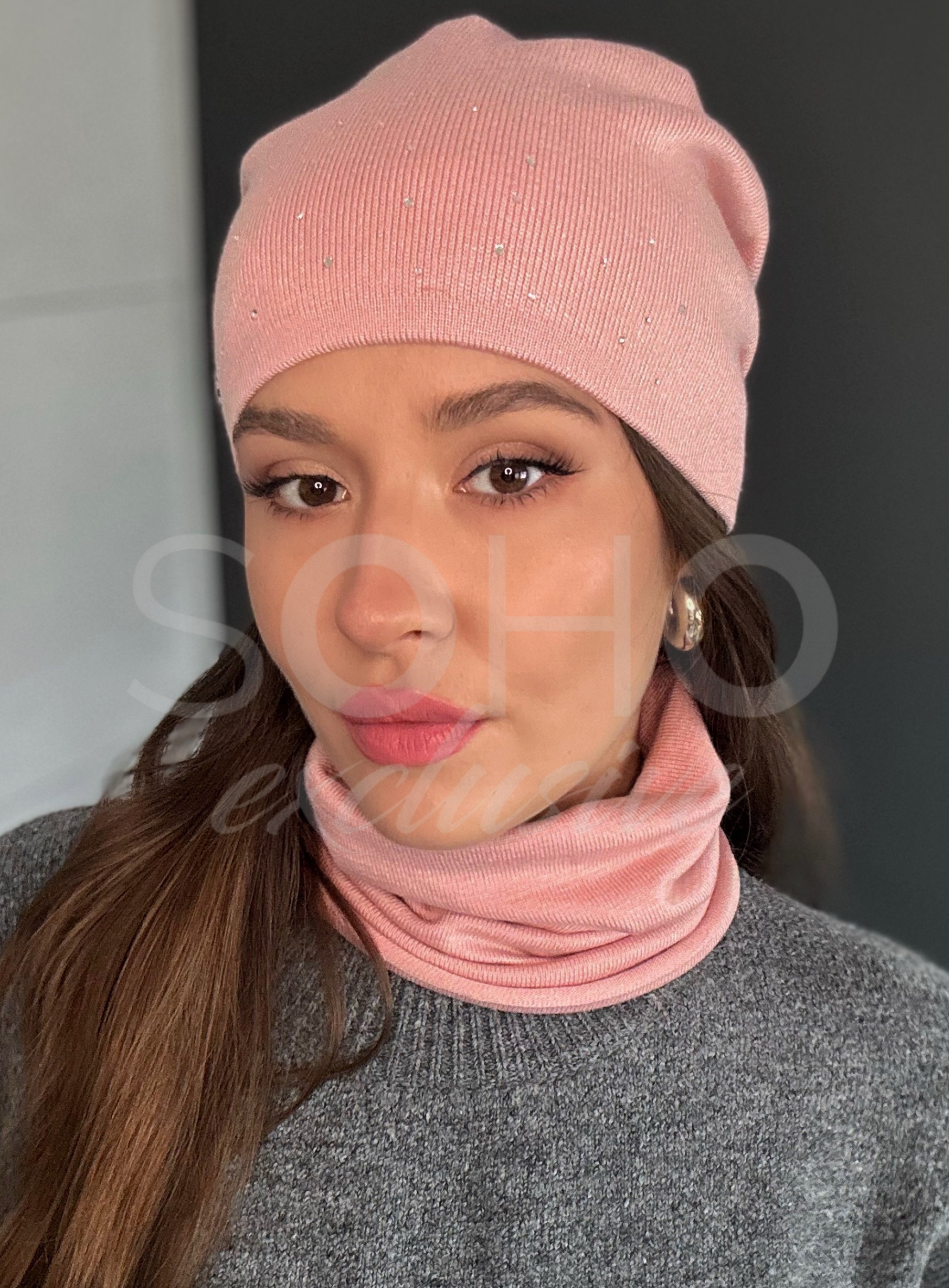 Komplet czapka beanie komin golf tuba jesień zima wiosna wiskozowy pudrowy różowy 3029