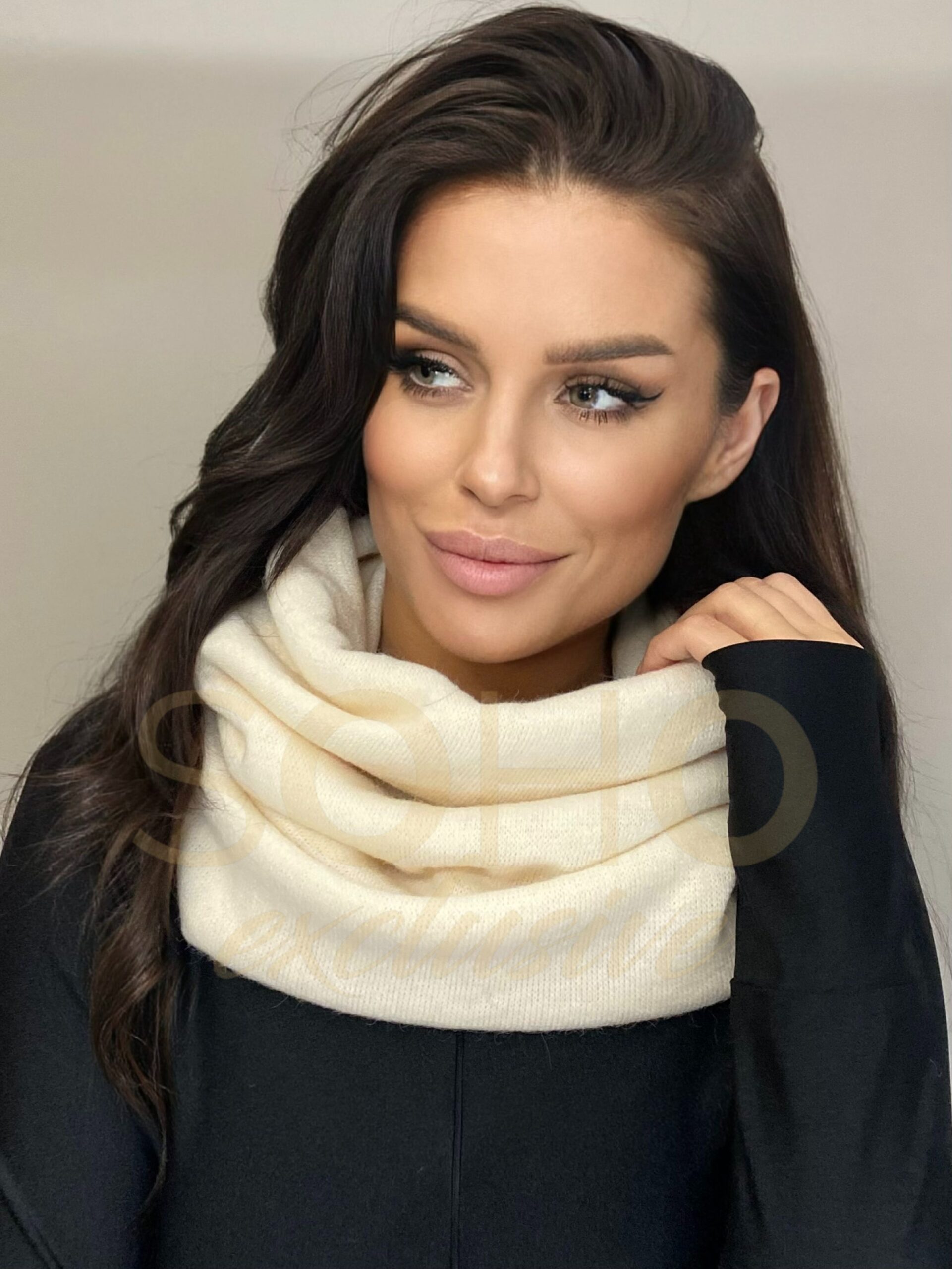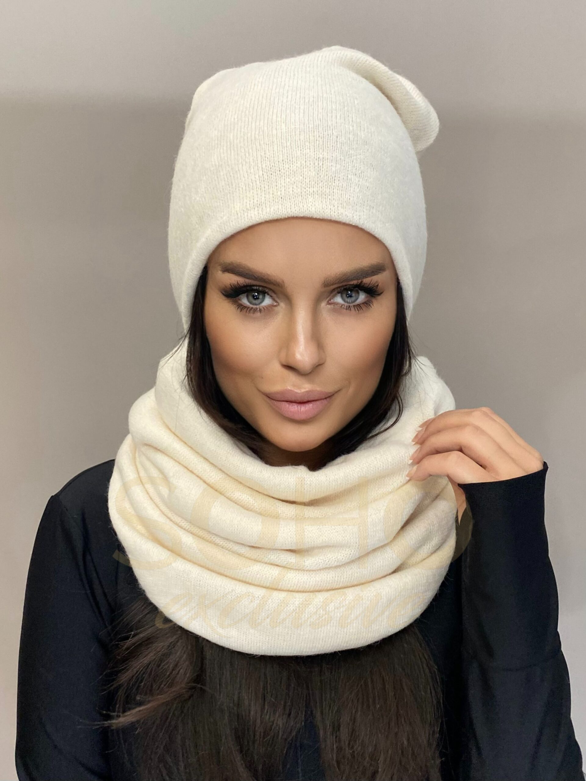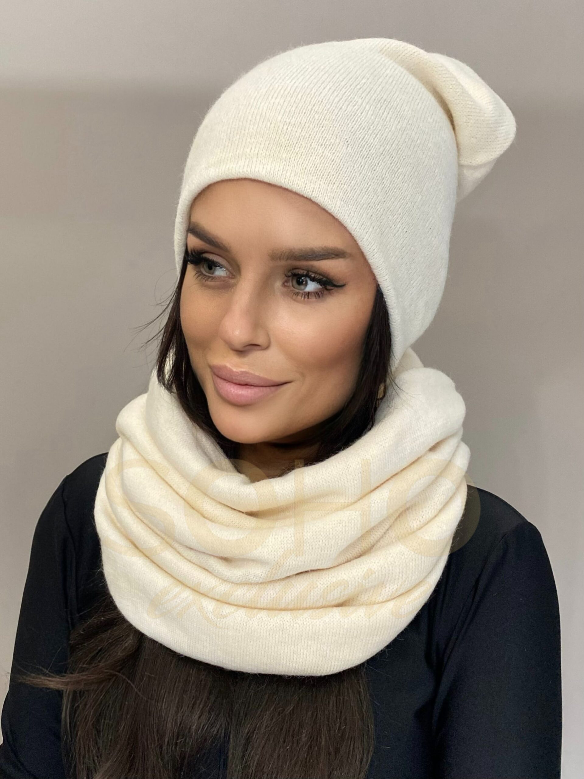 Komplet damski ciepły wygodny modny kobiecy zimowy czapka + komin ecru 2468