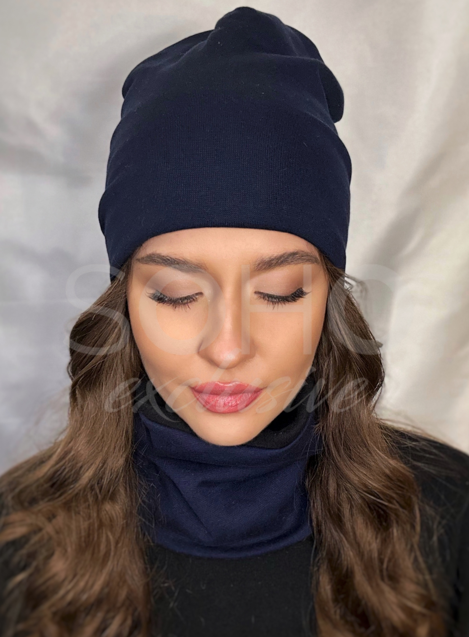 Komplet damski ciepły wygodny zimowy na zimę z polarem czapka + komin granatowy 3039