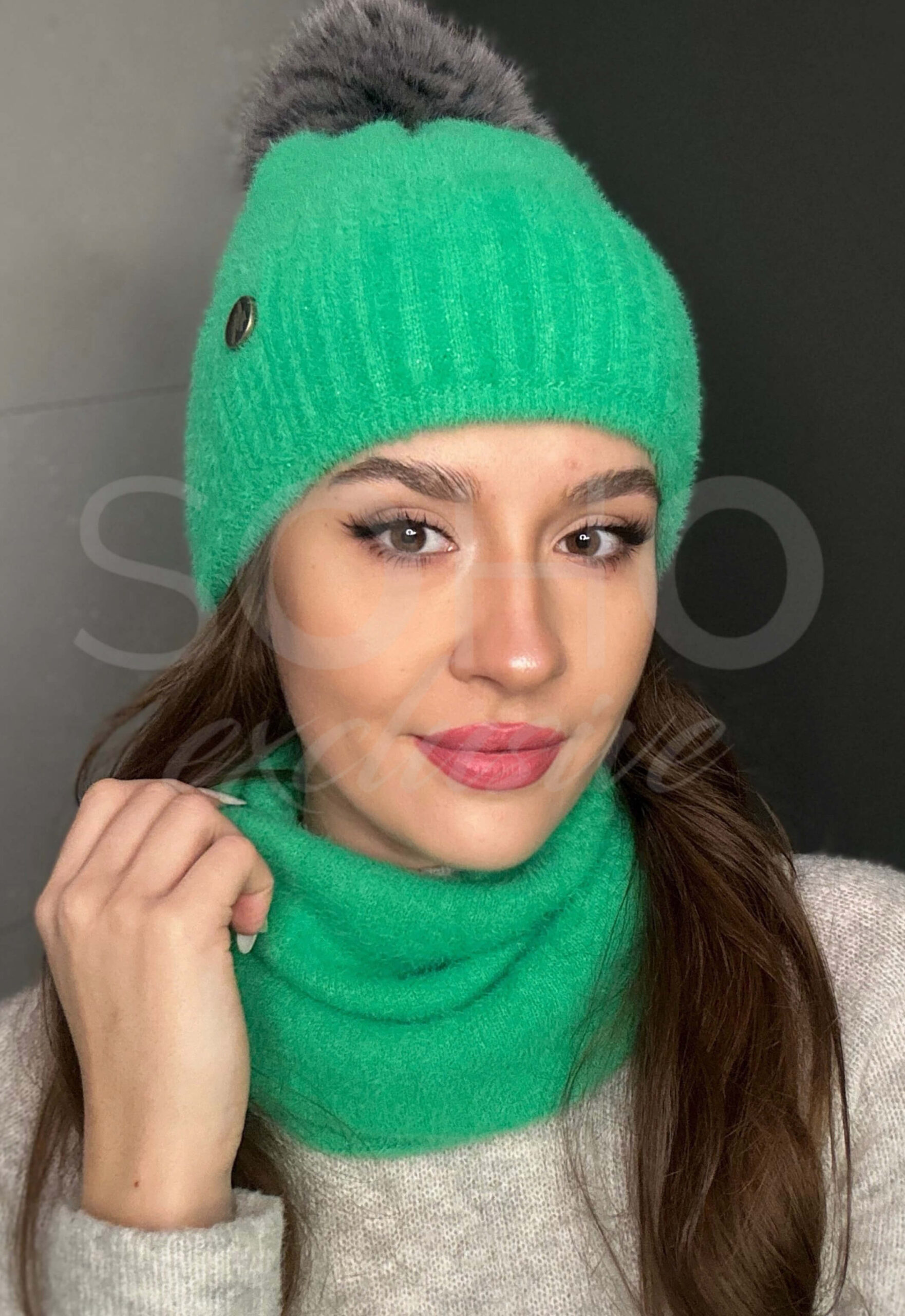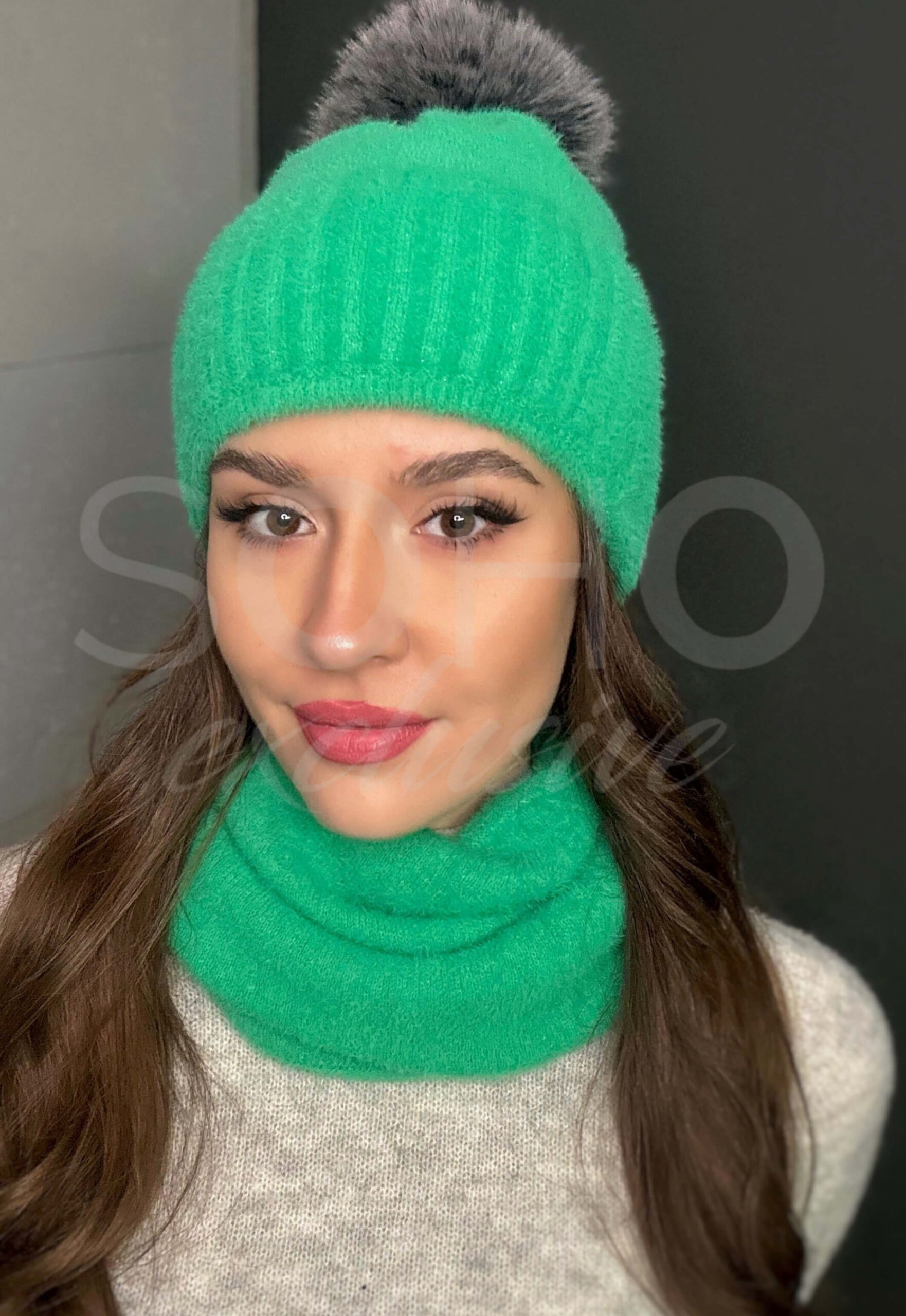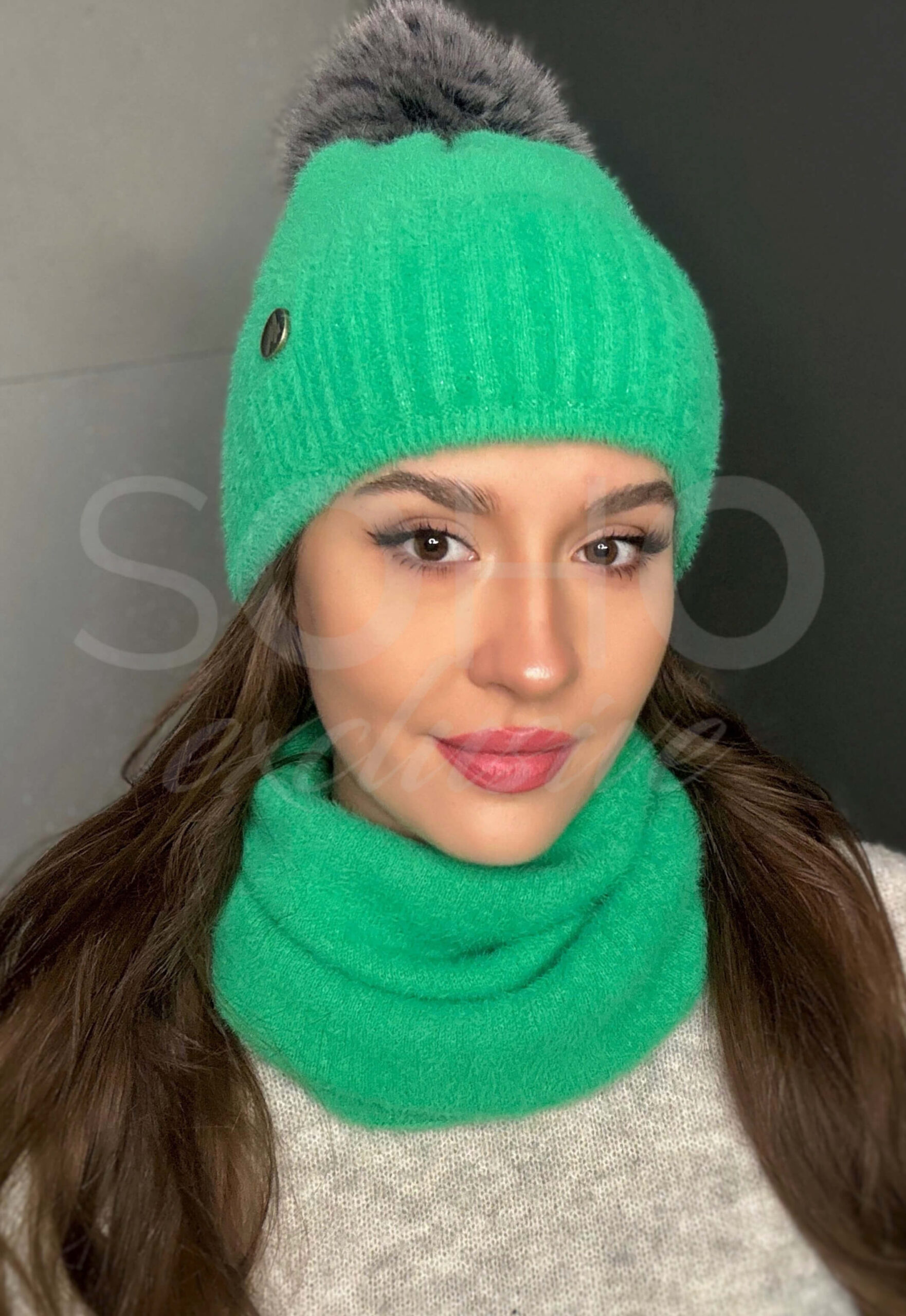 Komplet damski czapka beanie komin golf tuba duży zestaw ciepły sport żywy zielony 2818