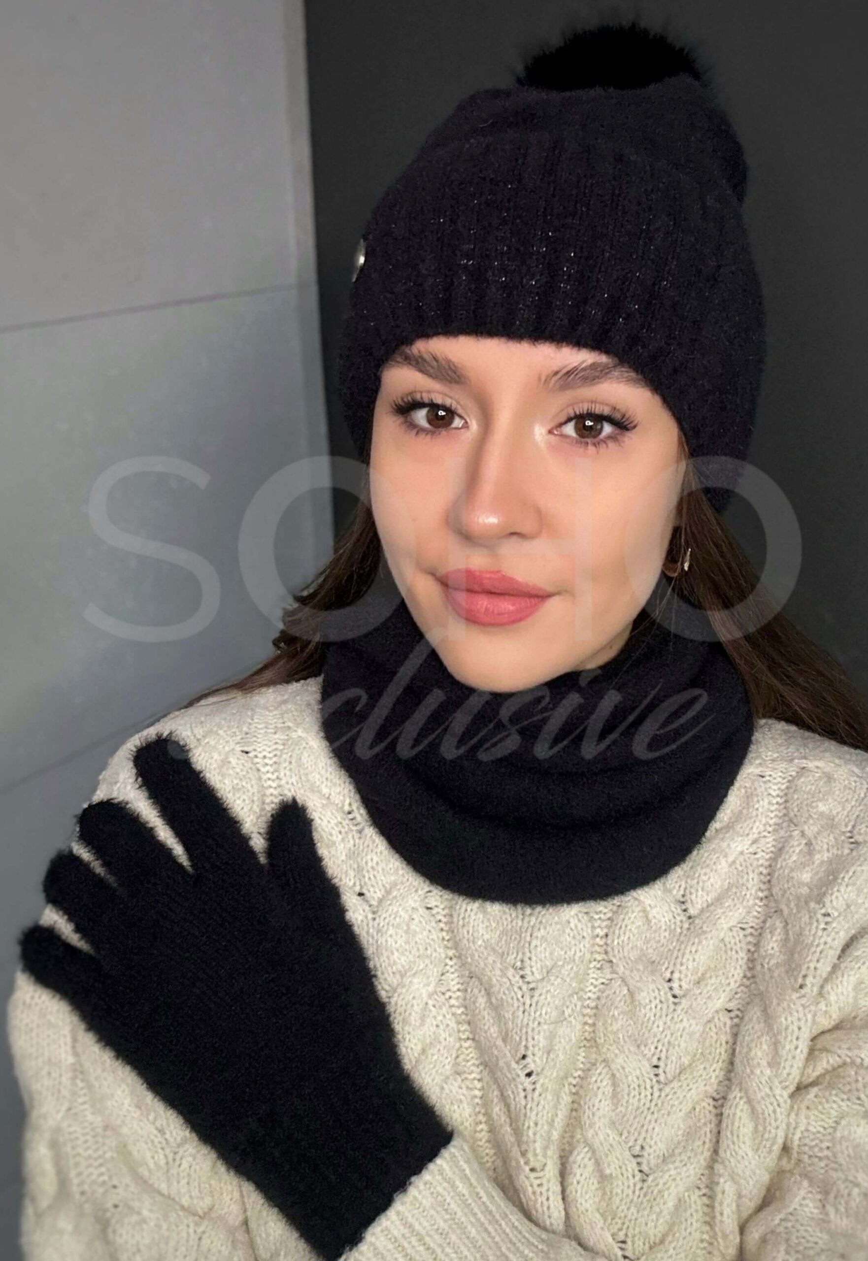 Komplet damski czapka komin golf rękawiczki zestaw ciepły alpaka czarny 3068