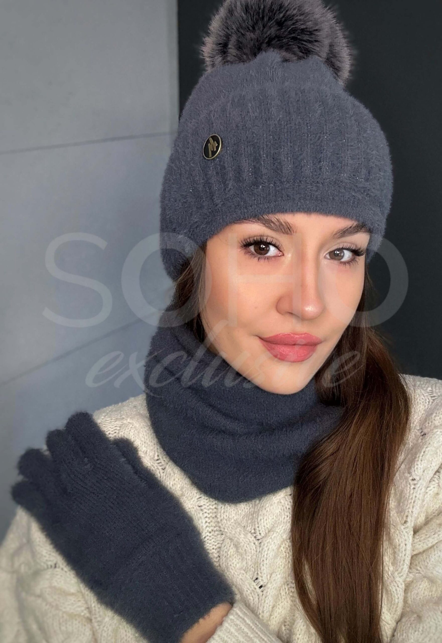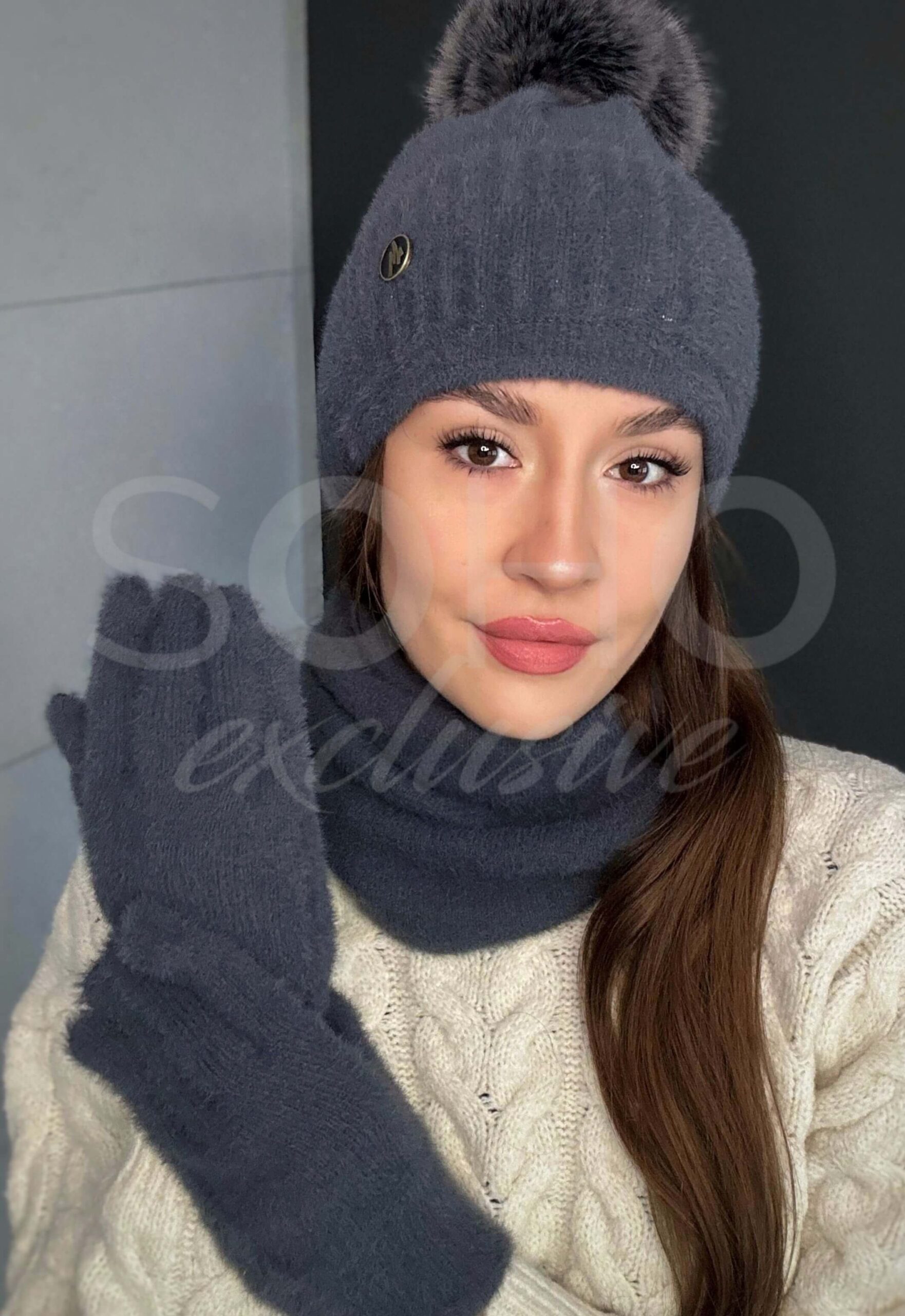Komplet damski czapka komin golf rękawiczki zestaw ciepły alpaka grafitowy 3068