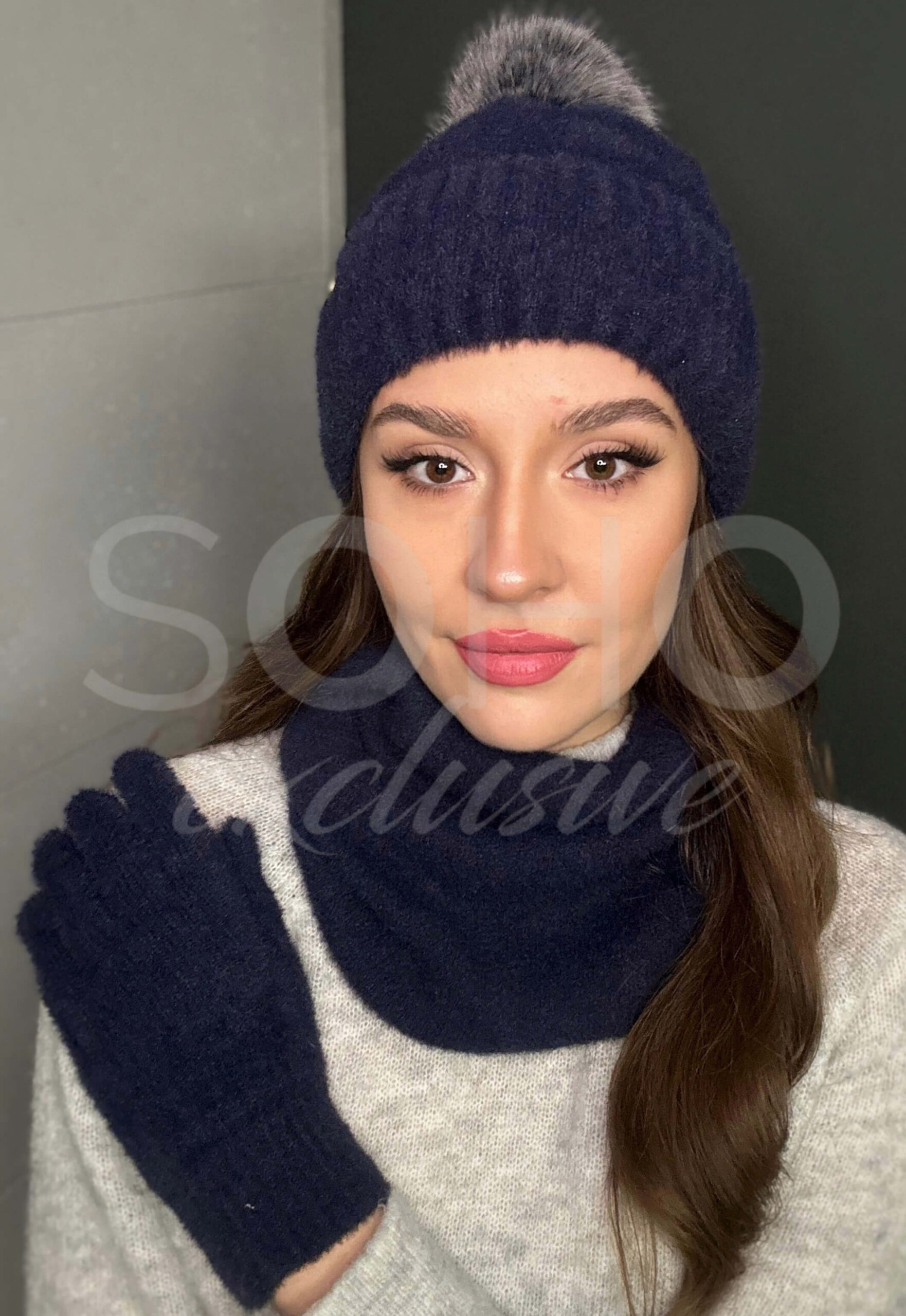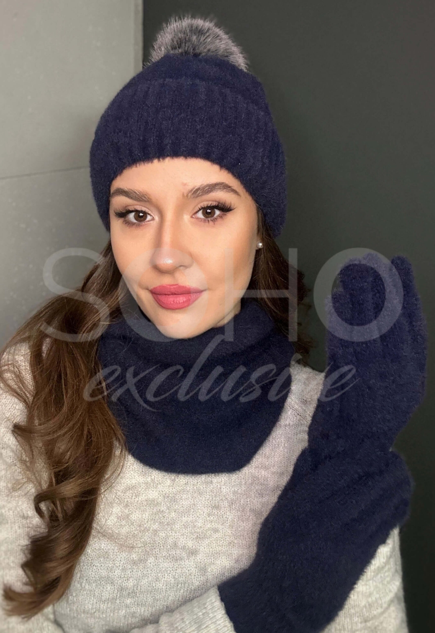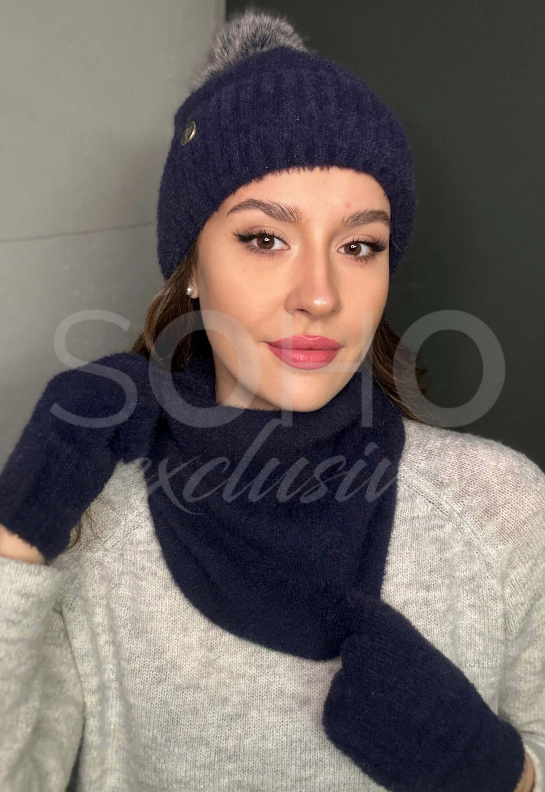 Komplet damski czapka komin golf rękawiczki zestaw ciepły alpaka granatowy 3068