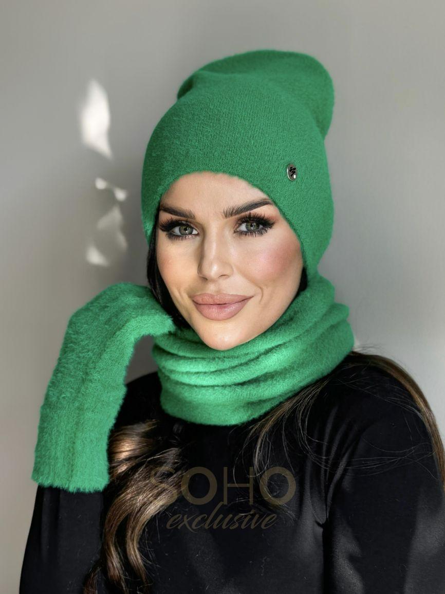 Komplet damski czapka komin golf rękawiczki zestaw ciepły alpaka trawiasty 2911