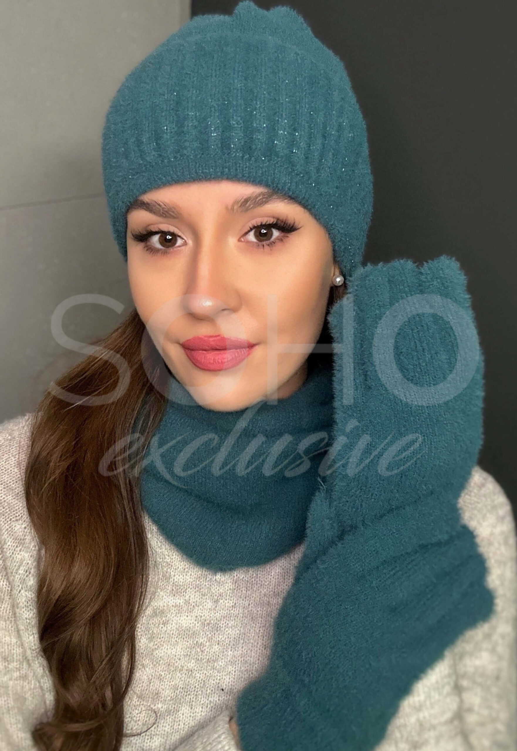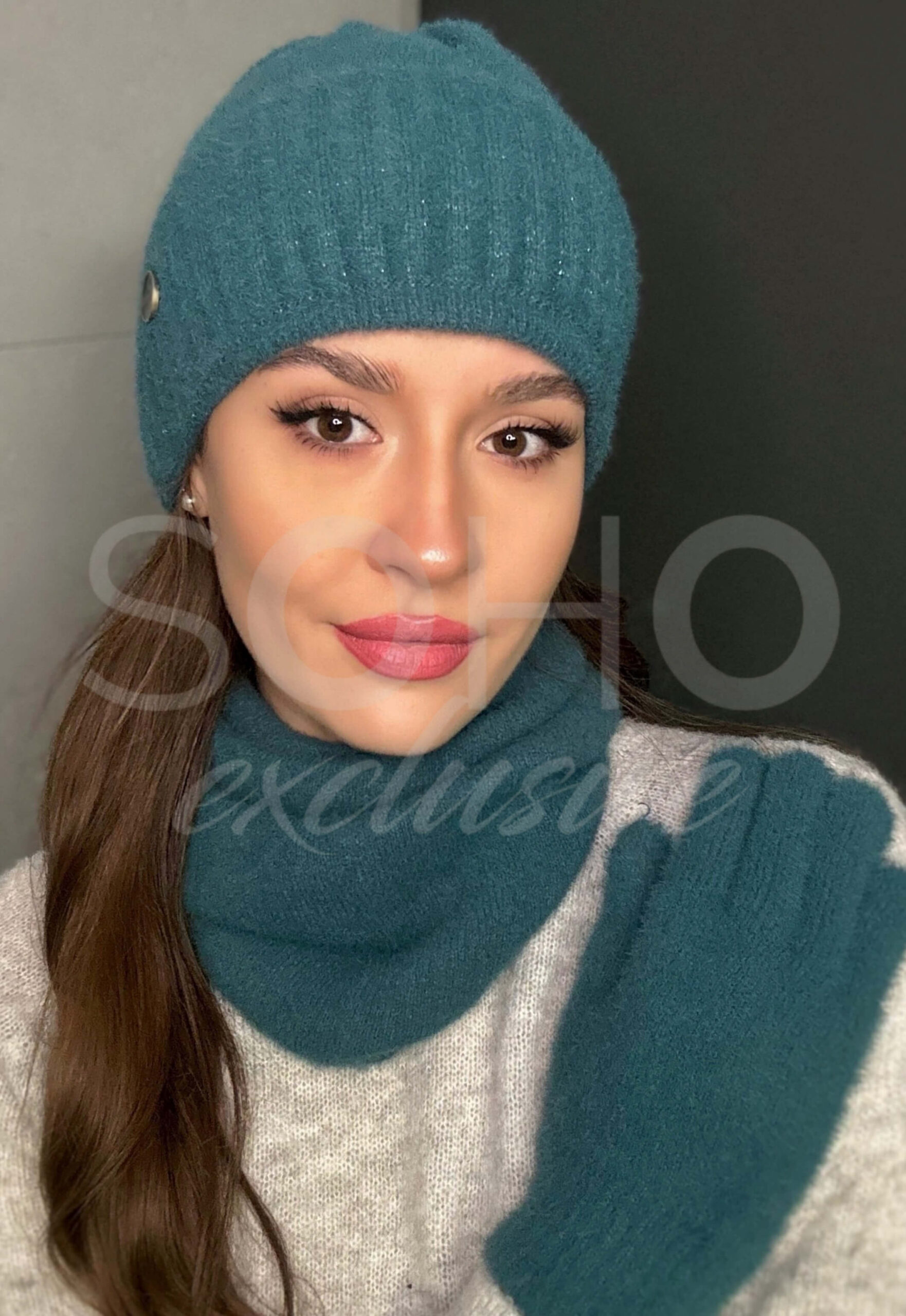 Komplet damski czapka komin golf tuba rękawiczki zestaw ciepły alpaka morski 3069
