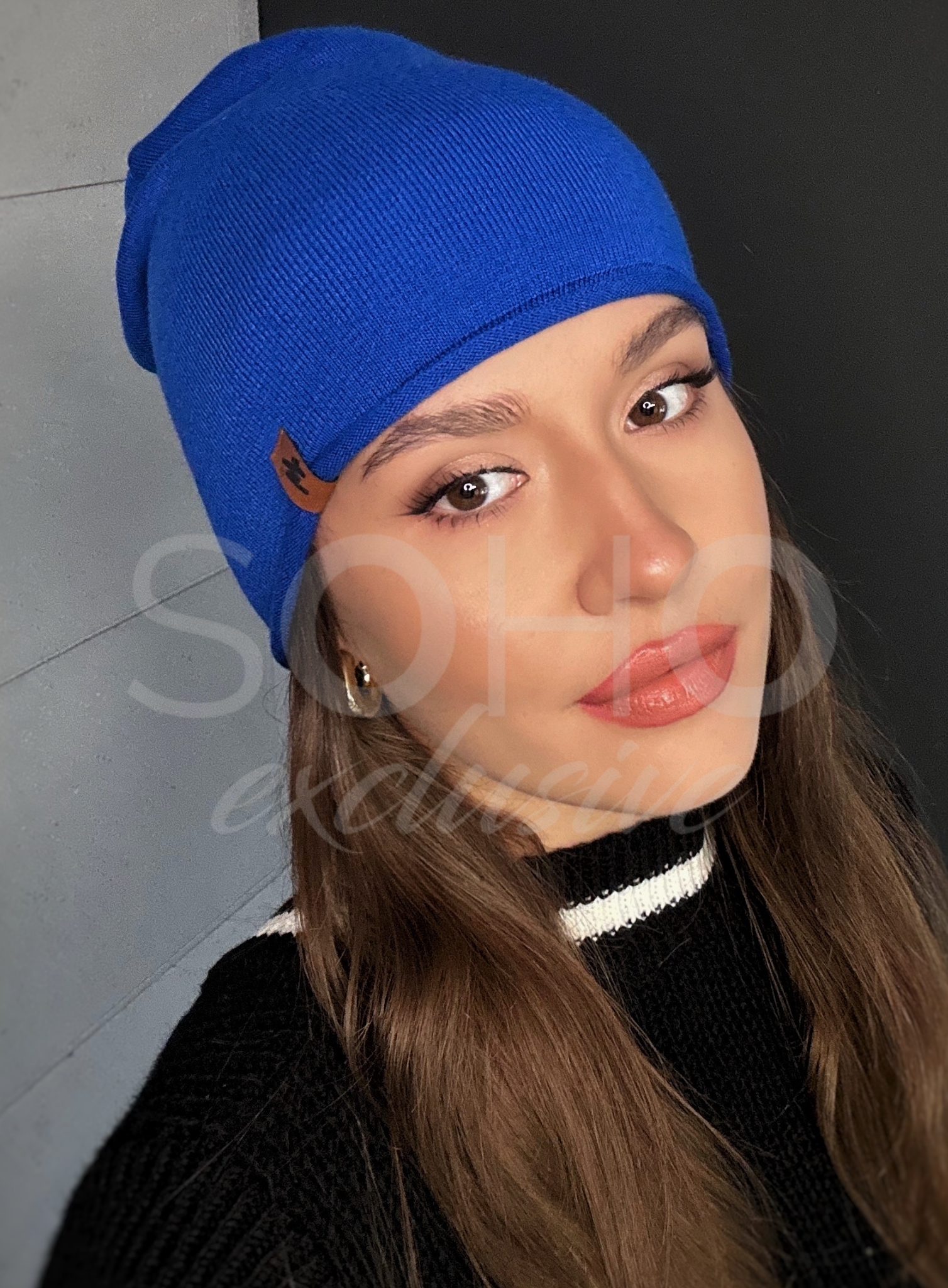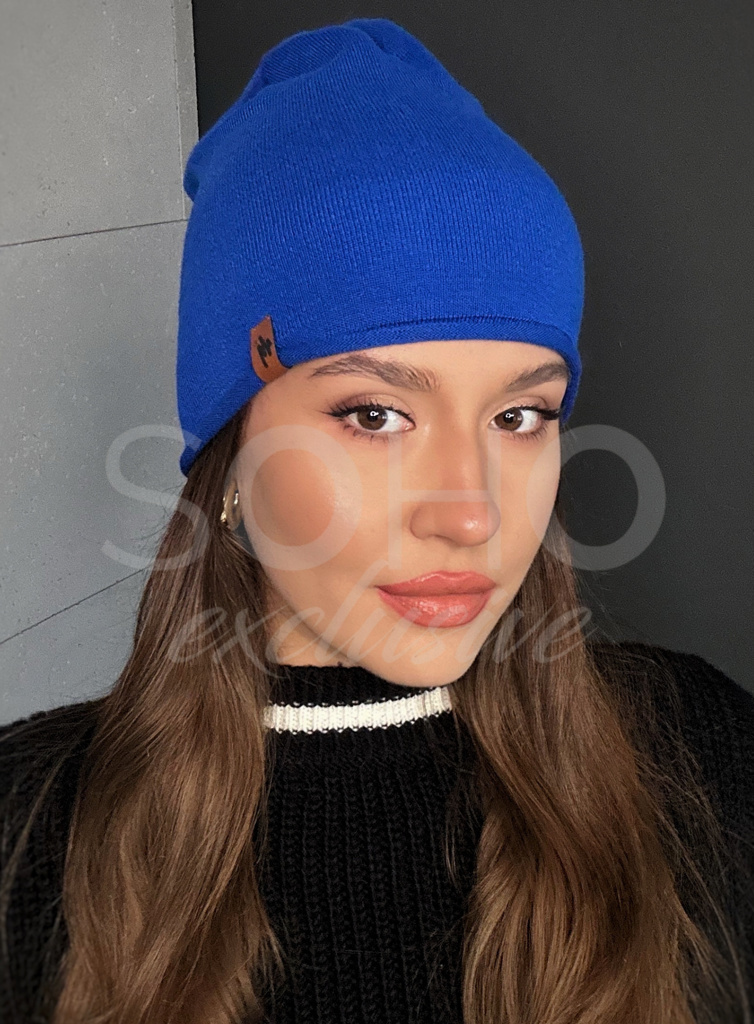 Czapka typu beanie/krasnal, delikatnie opadająca, ozdobiona eleganckim logowaniem.