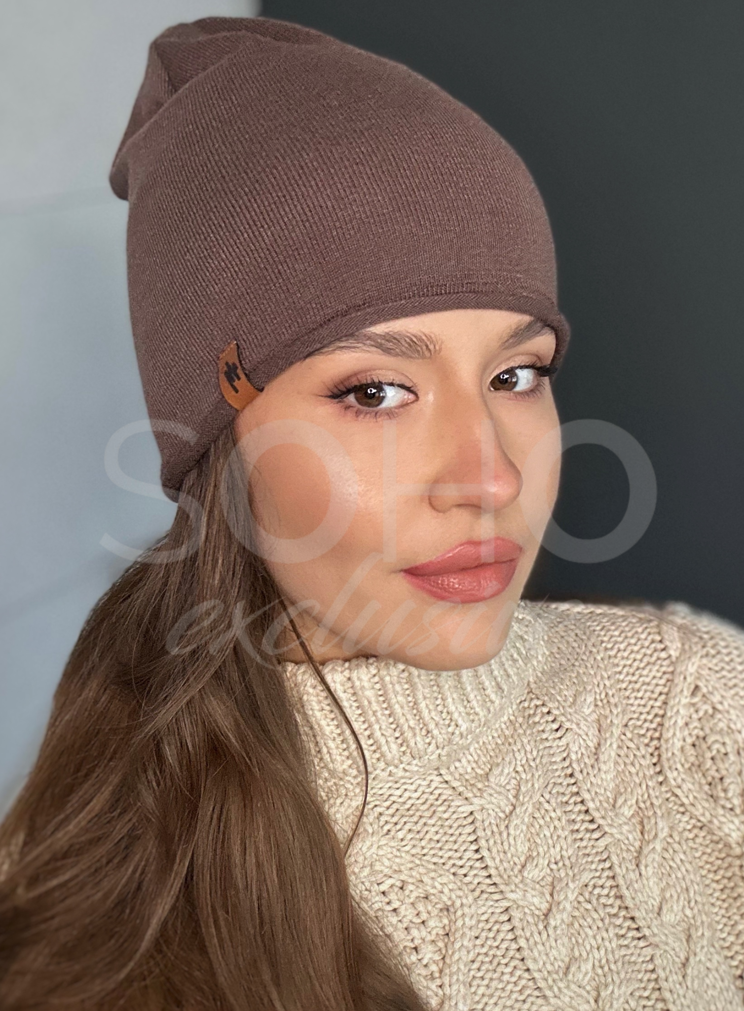 Czapka typu beanie/krasnal, delikatnie opadająca, ozdobiona eleganckim logowaniem.