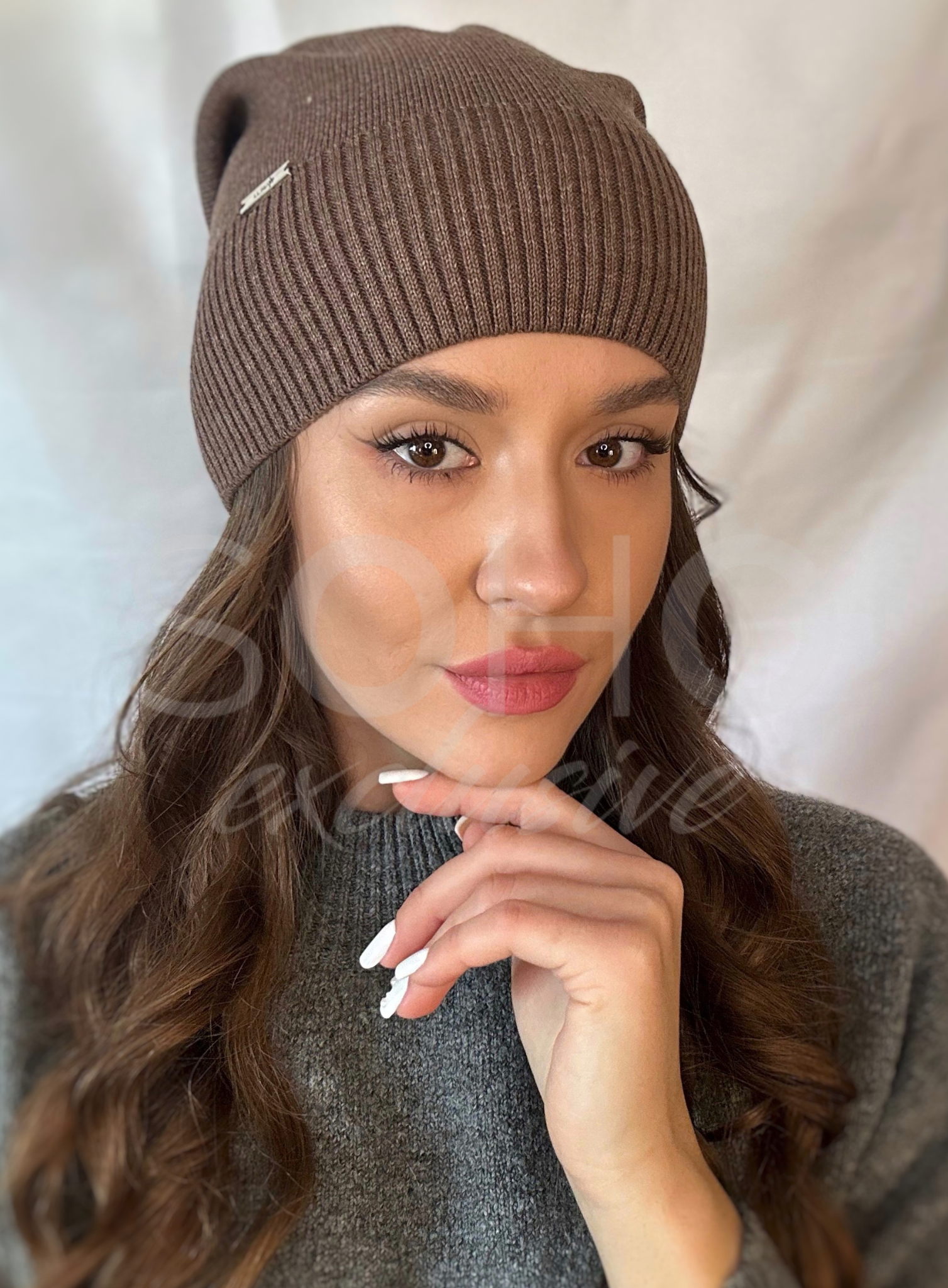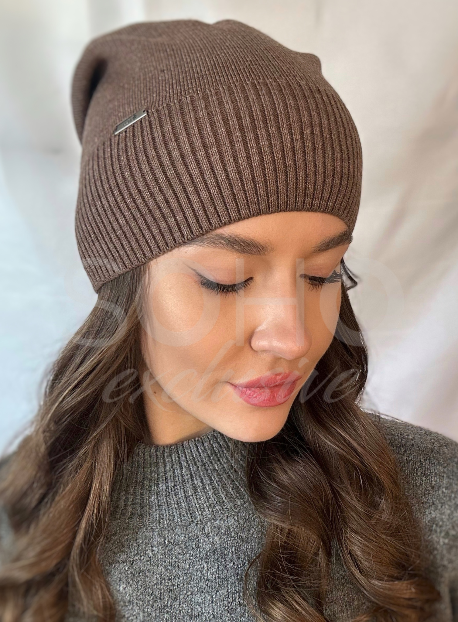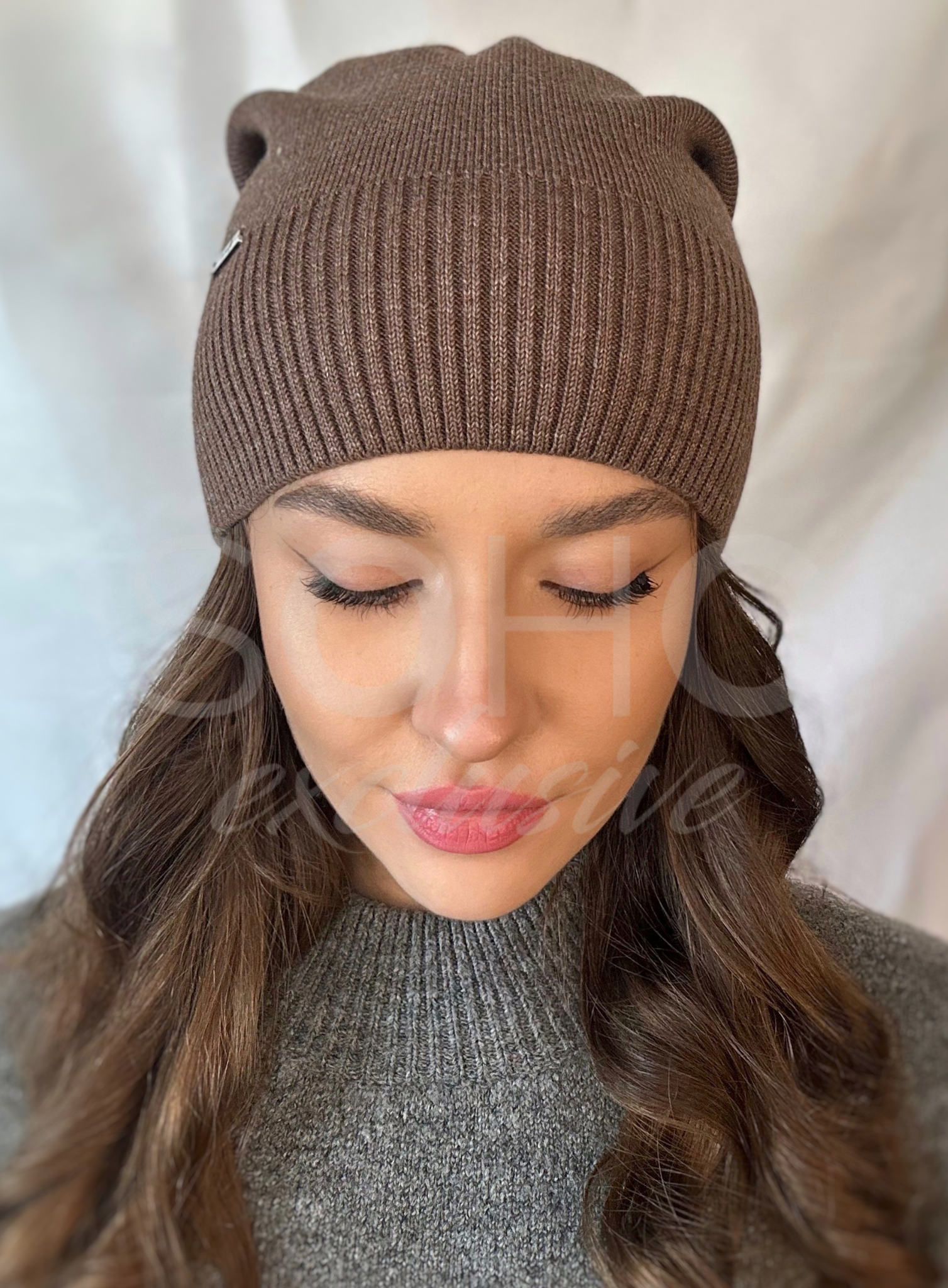 Czapka niewywijana, delikatnie opadająca, z ciekawym szyciem z tyłu, delikatnym ściągaczem i logowaną ozdobą z przodu.