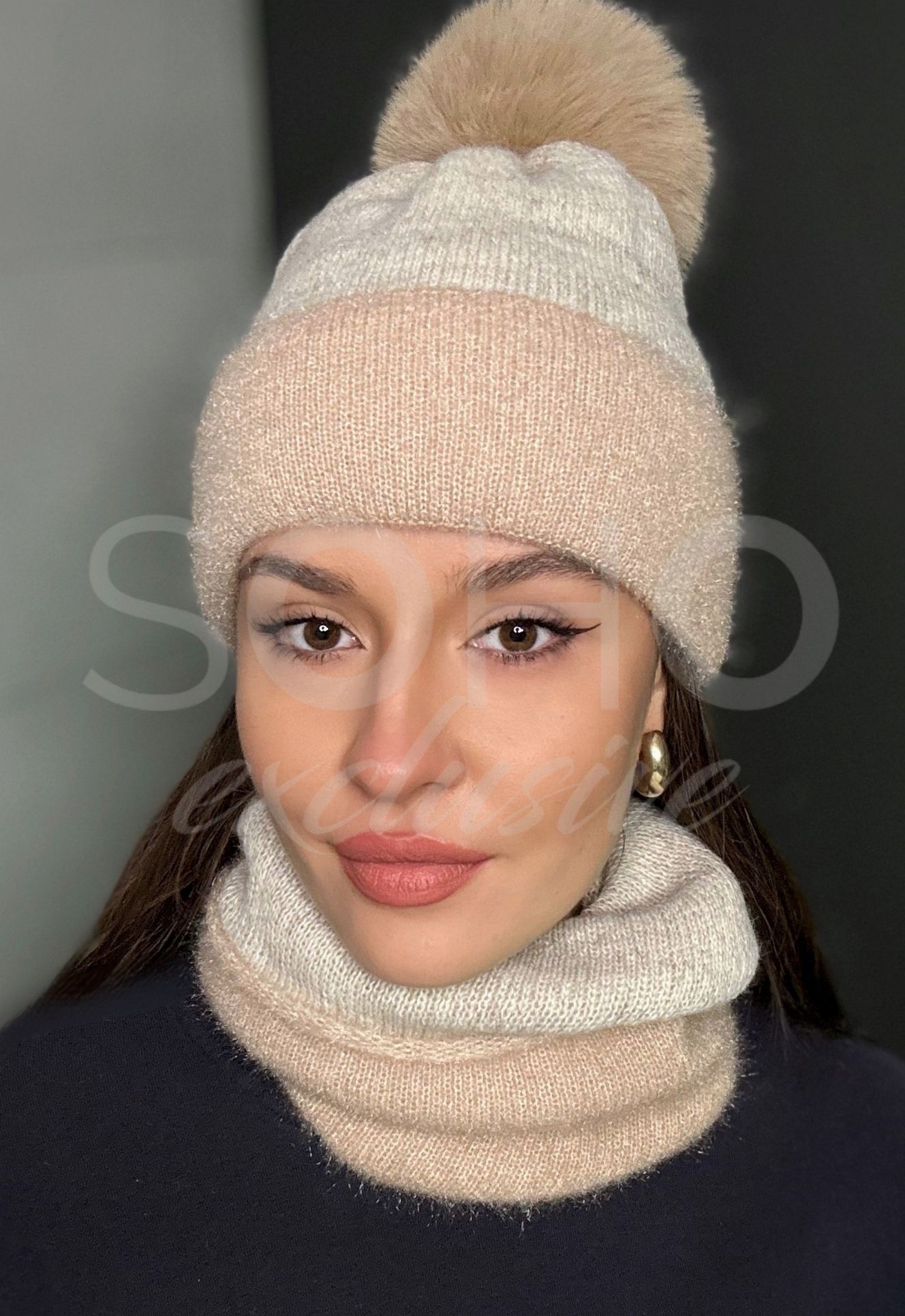 Napisz pierwszą opinię o „Komplet damski czapka pompon komin golf duży ciepły zimowy dwukolorowy beżowy + kremowy 3028”