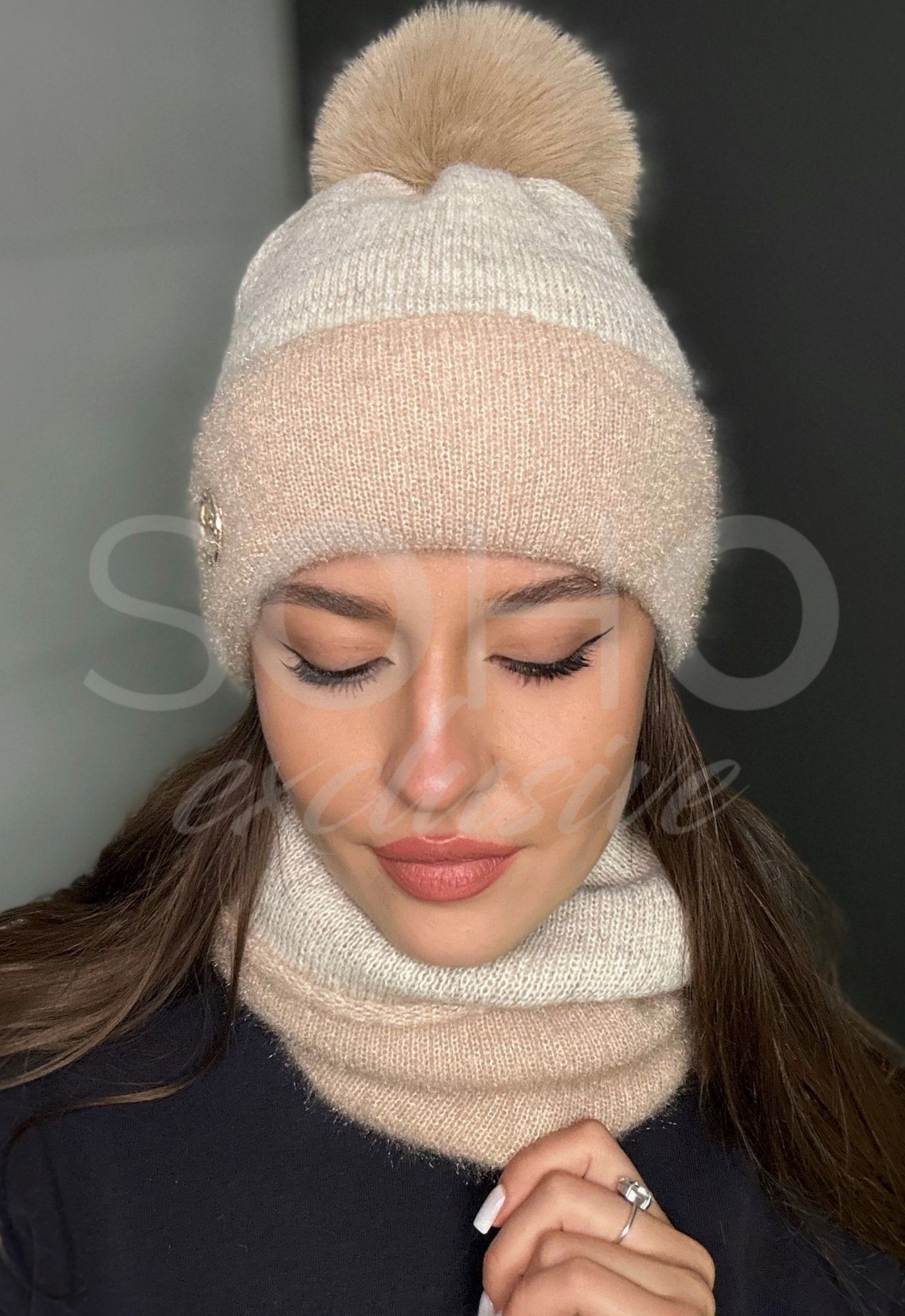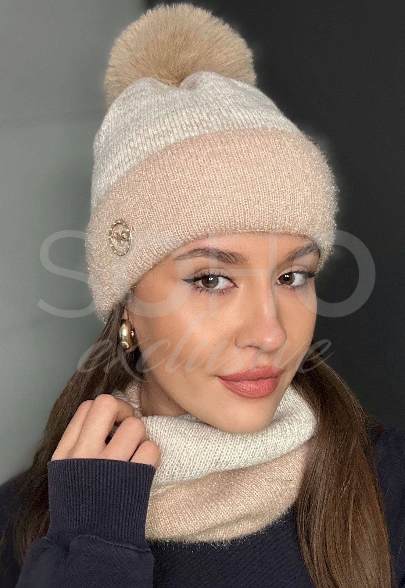 Komplet damski czapka pompon komin golf duży ciepły zimowy dwukolorowy beżowy + kremowy 3028