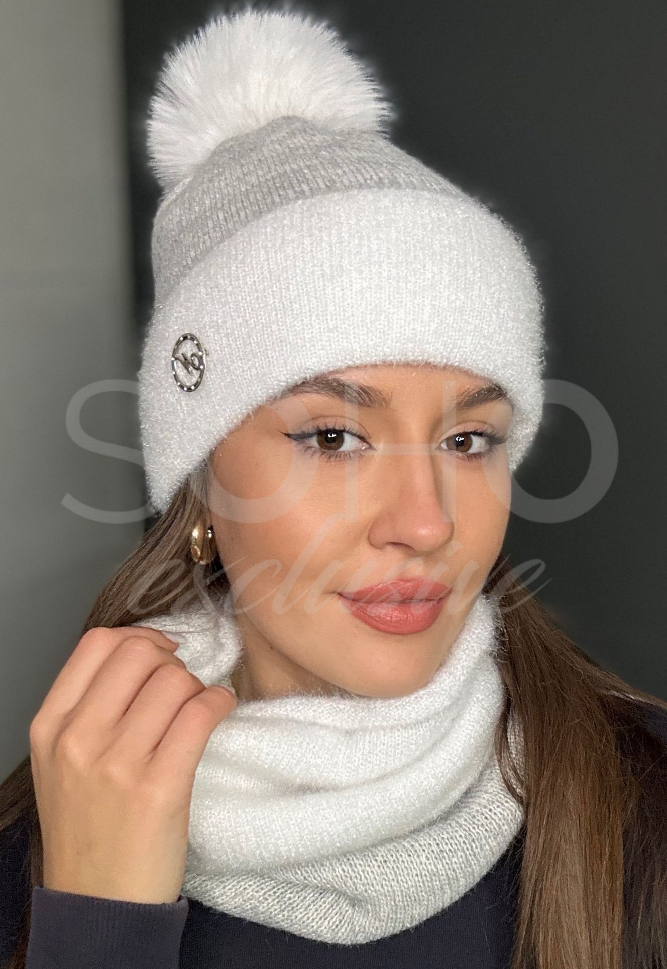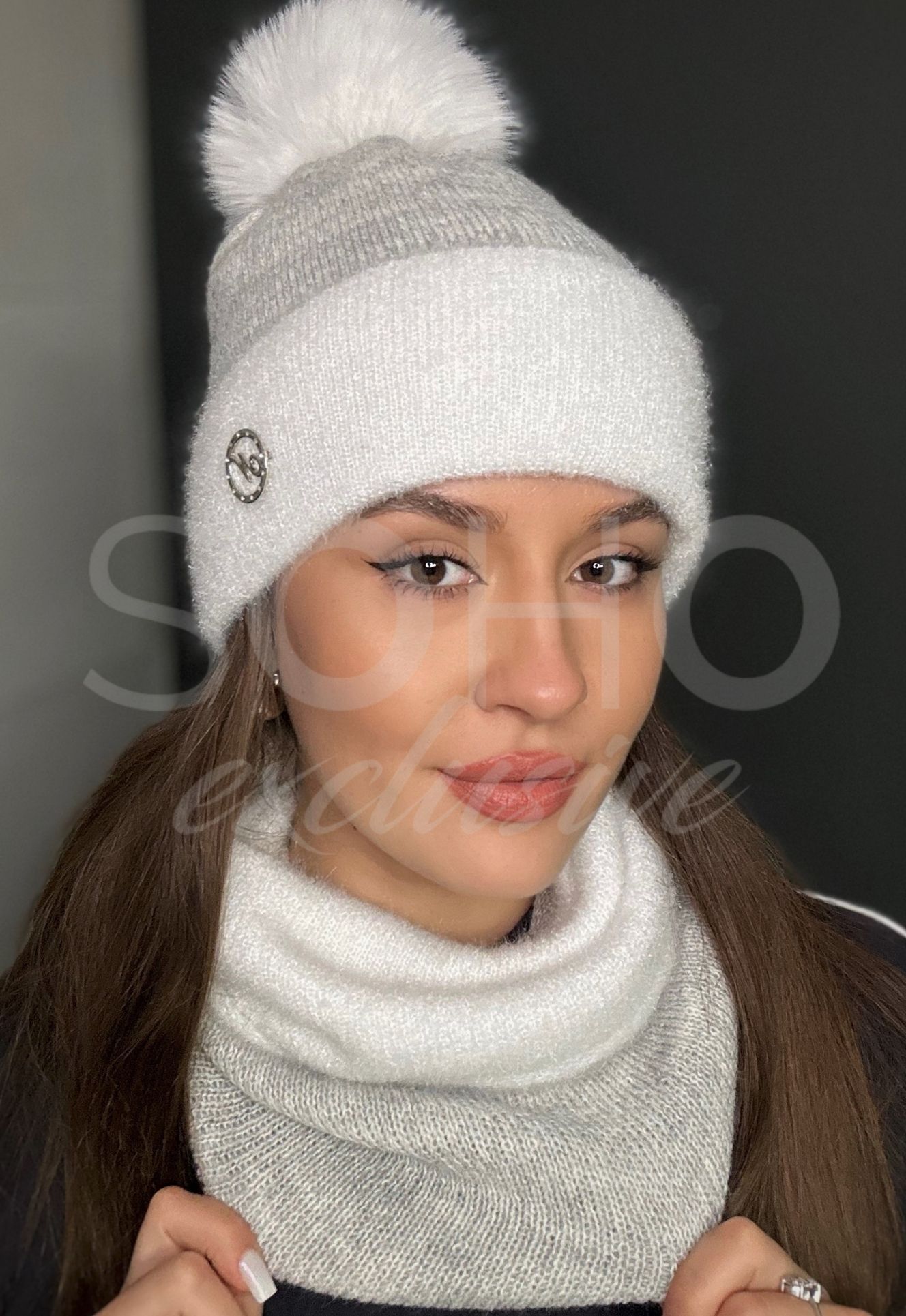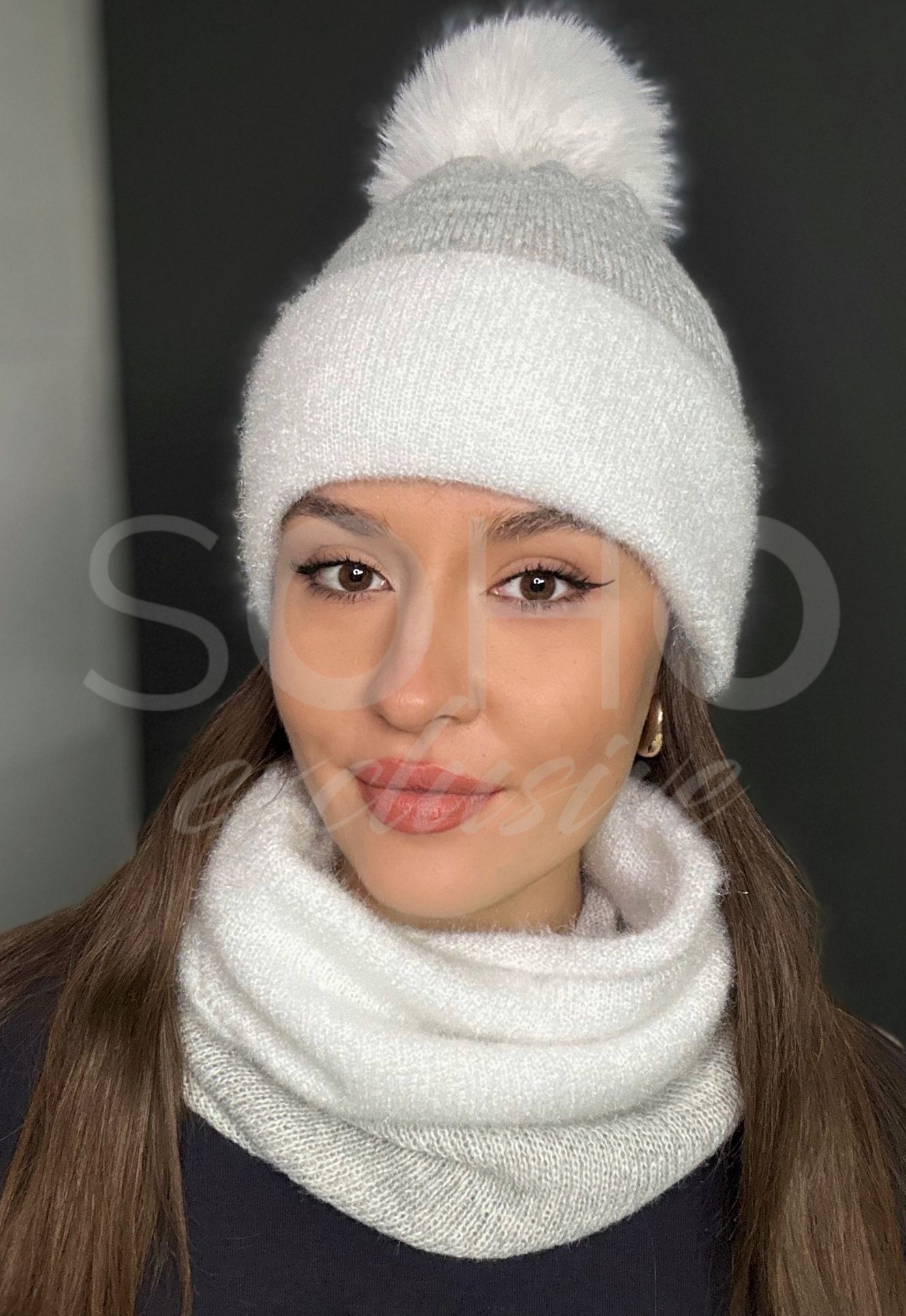 Komplet damski czapka pompon komin golf duży ciepły zimowy dwukolorowy biały + szary 3028