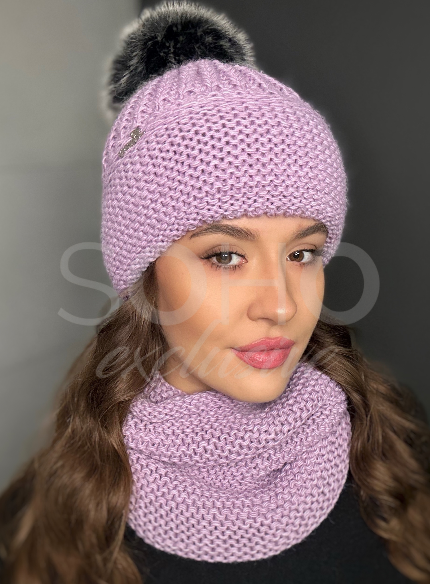 Komplet damski czapka pompon komin golf tuba ciepły wełniany fiołkowy 3048