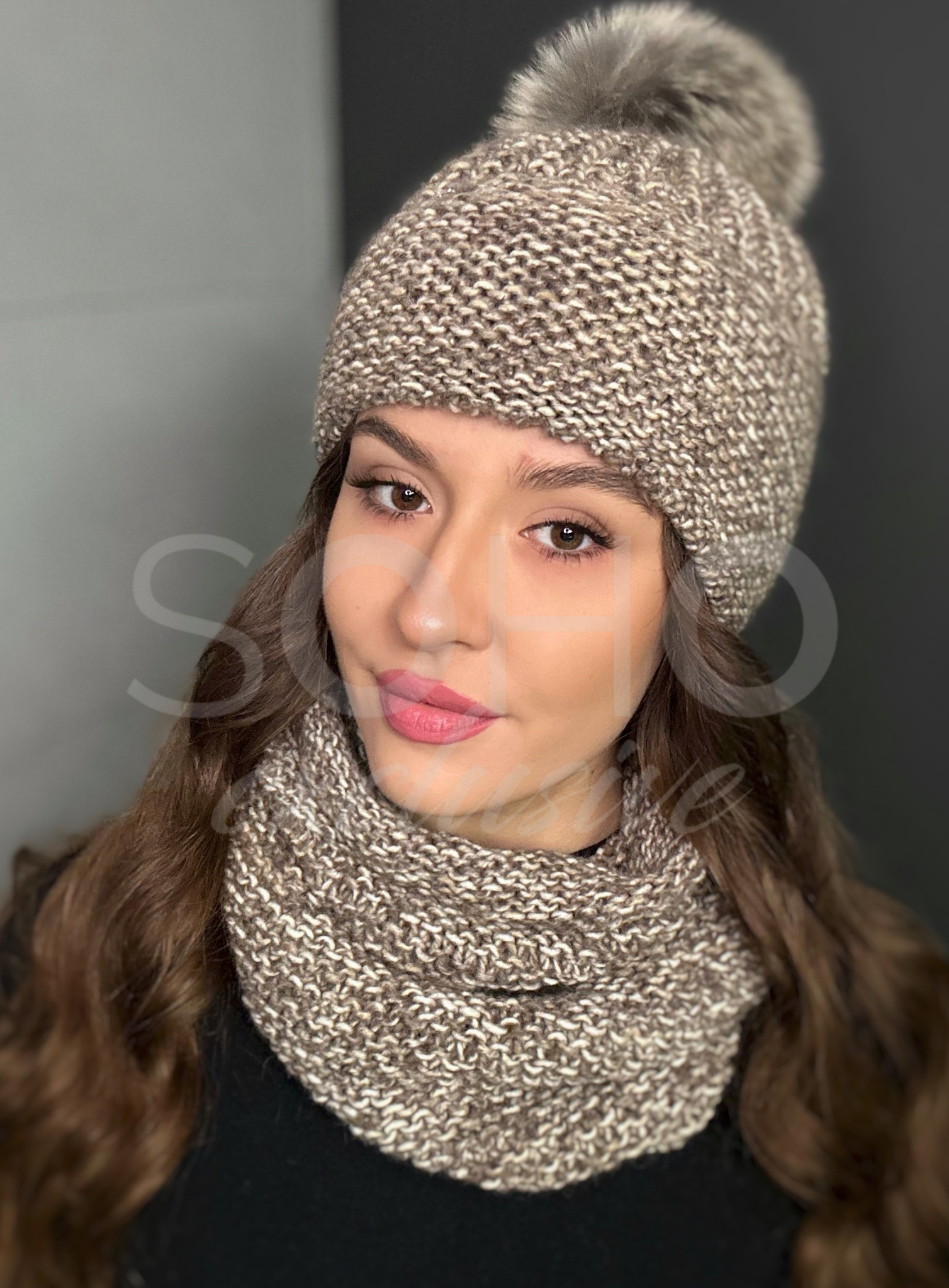 Komplet damski czapka pompon komin golf tuba ciepły wełniany mokka melange 3048