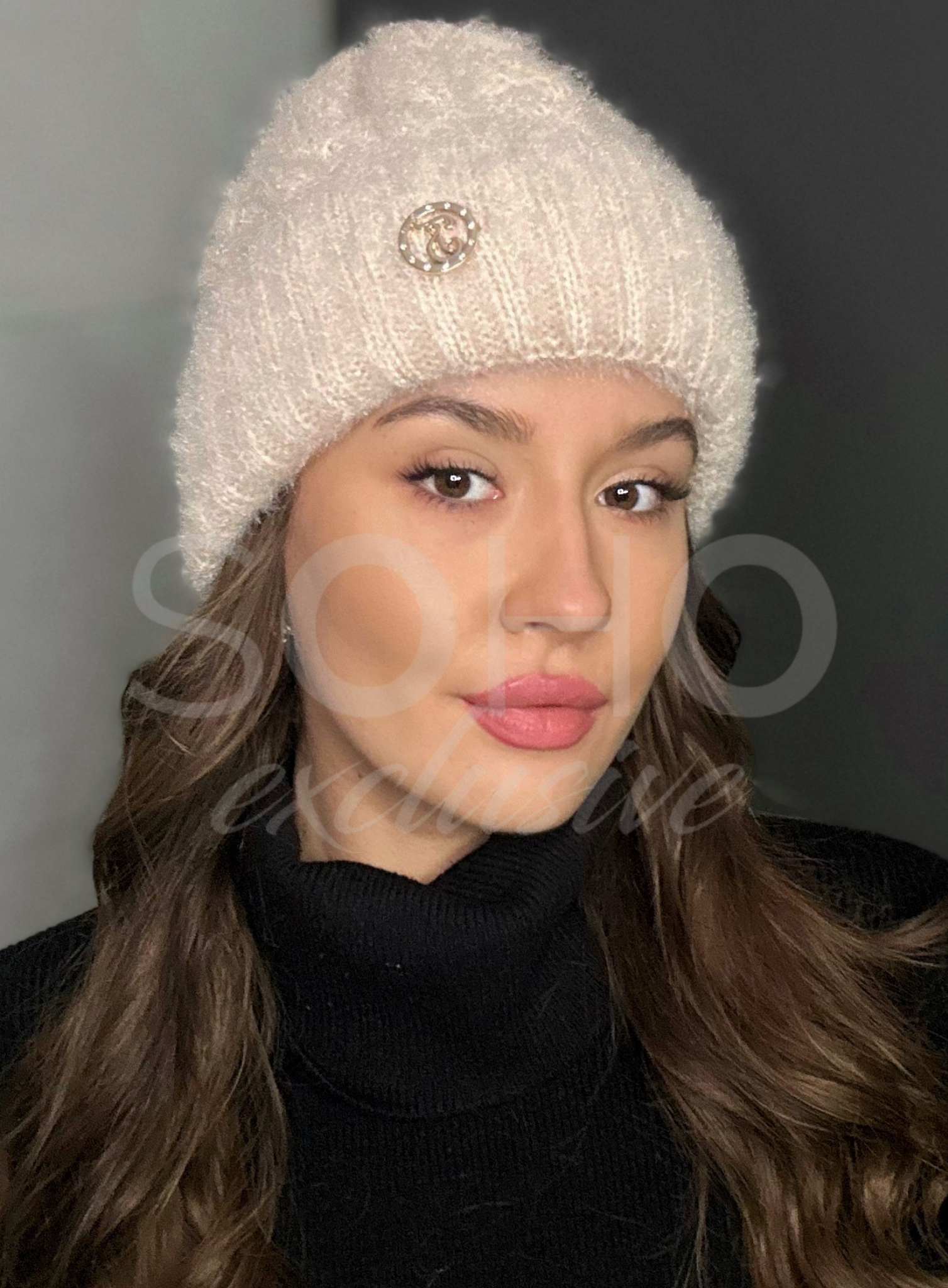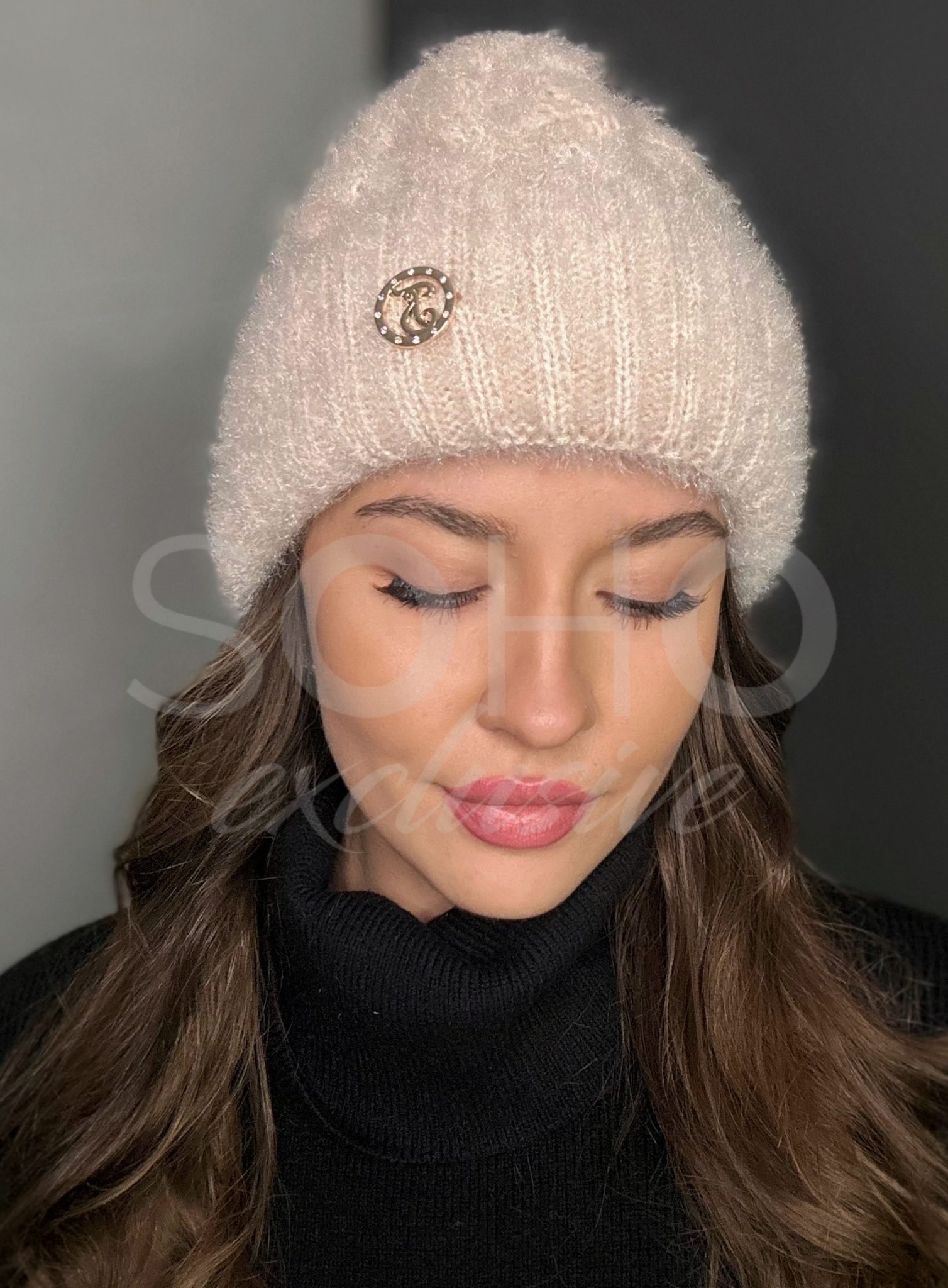 Czapka typu beanie/krasnal, delikatnie opadająca, wywijana, z subtelnym logowaniem.
