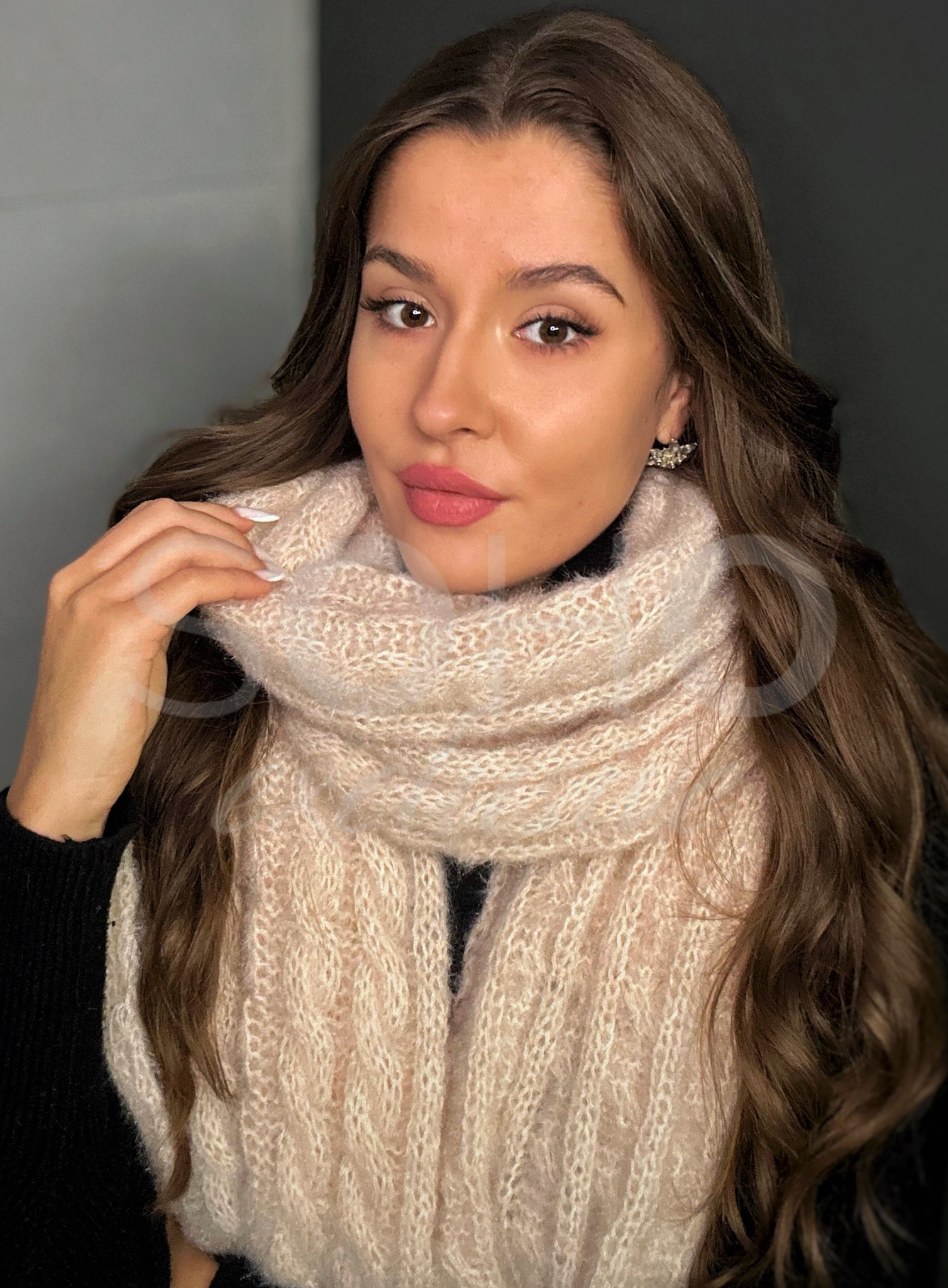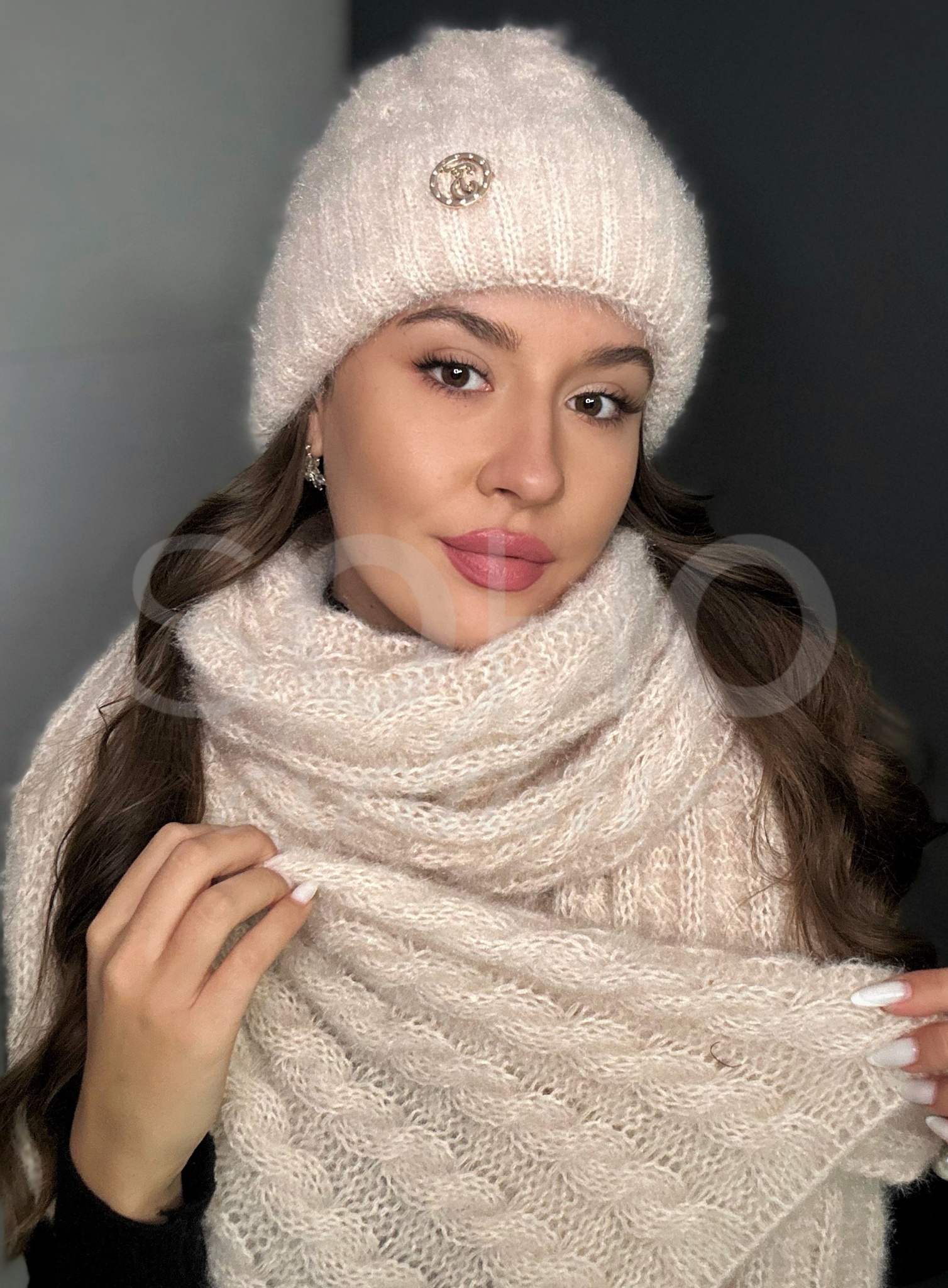 Komplet damski czapka szalik szal długi ciepły gruby zimowy beżowy 3049