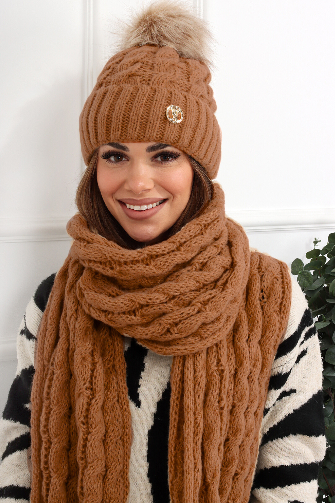 Komplet damski czapka szalik zestaw ciepły gruby zimowy brązowy 2722