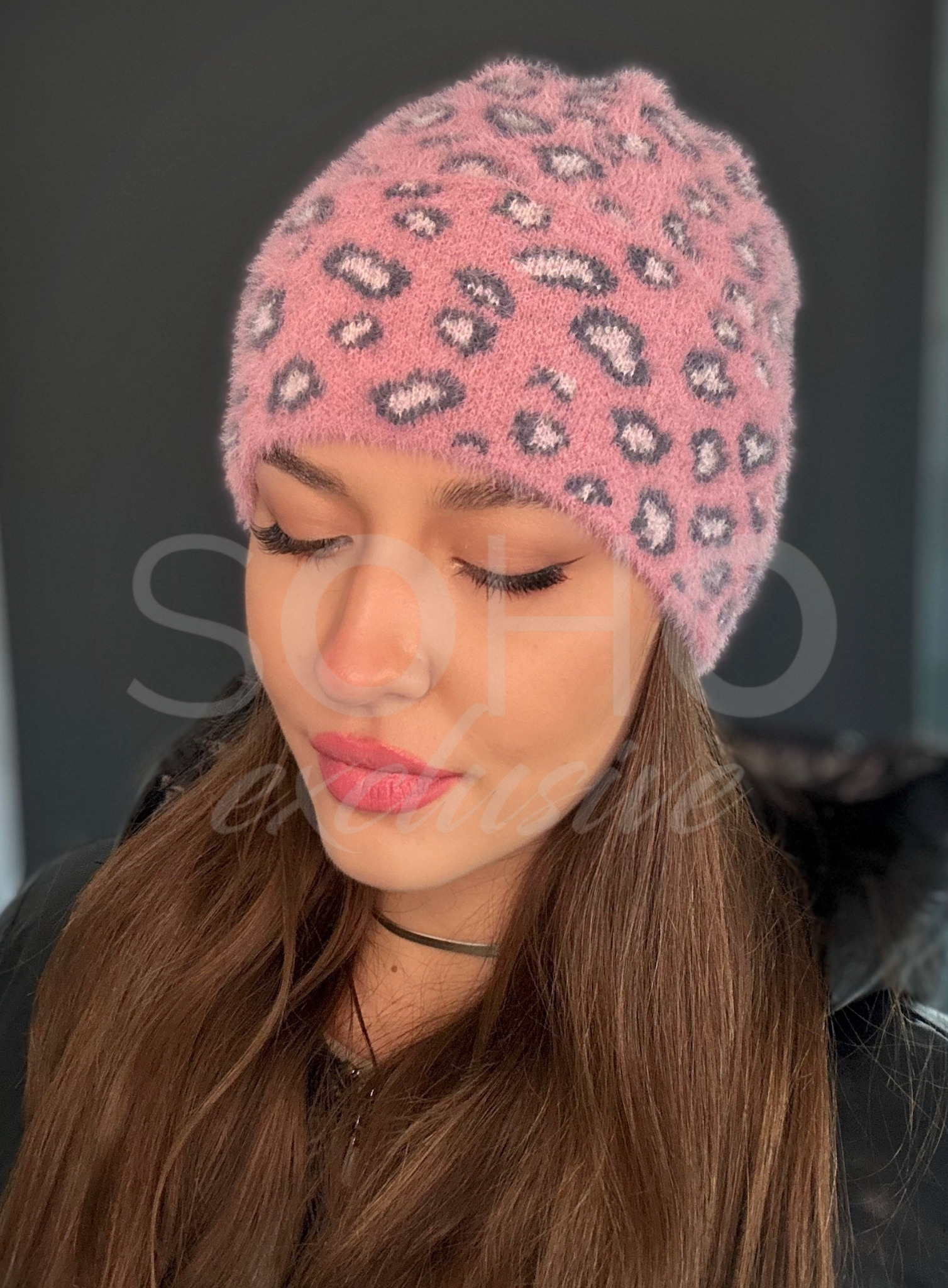 Komplet damski czapka wywijana komin golf tuba ciepły alpaka panterka brudny różowy 2996