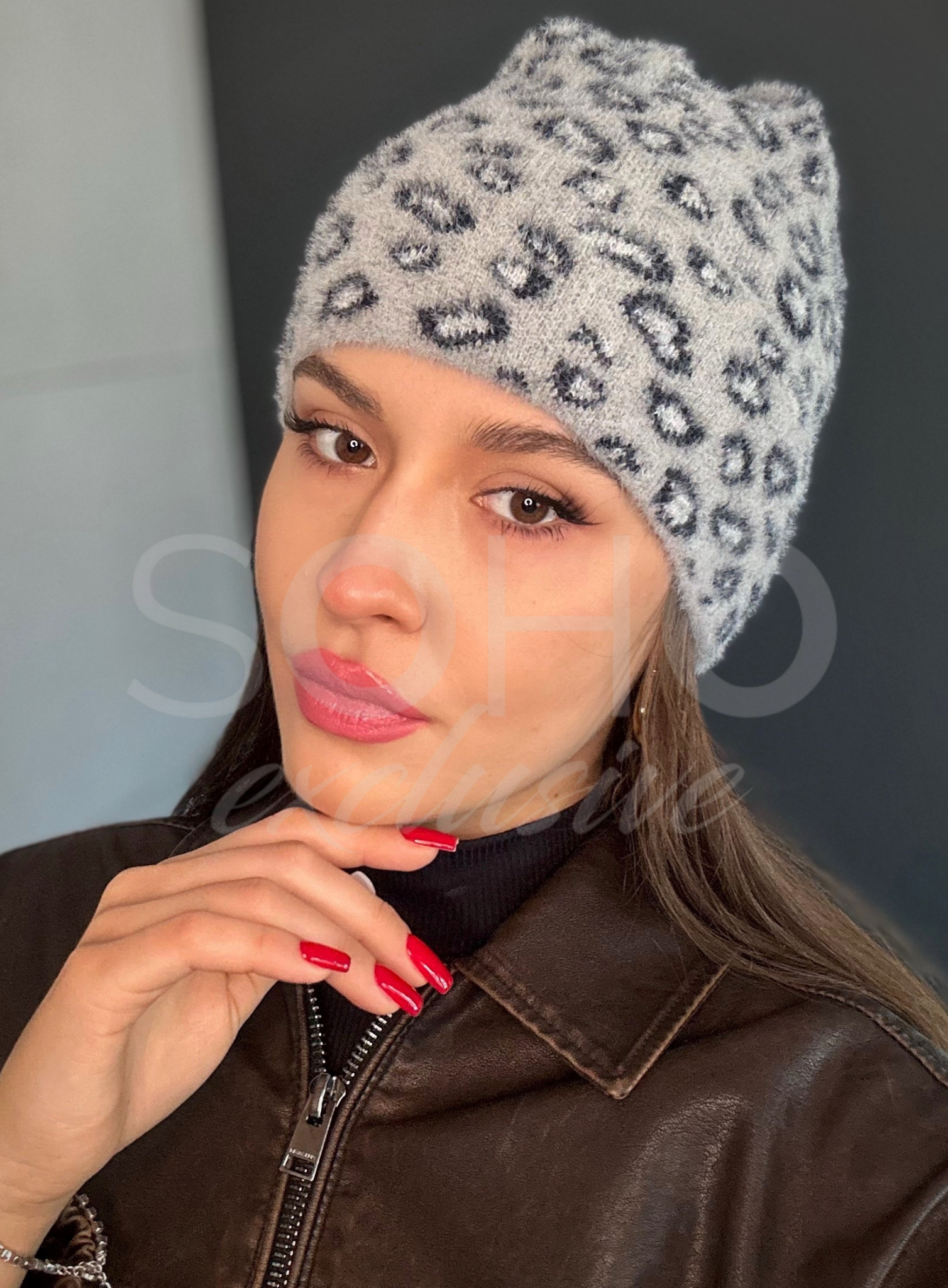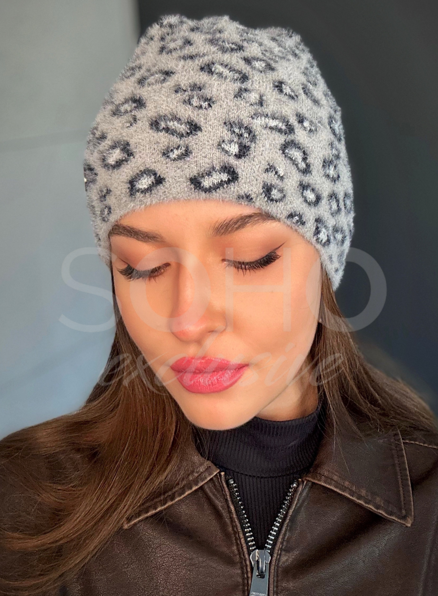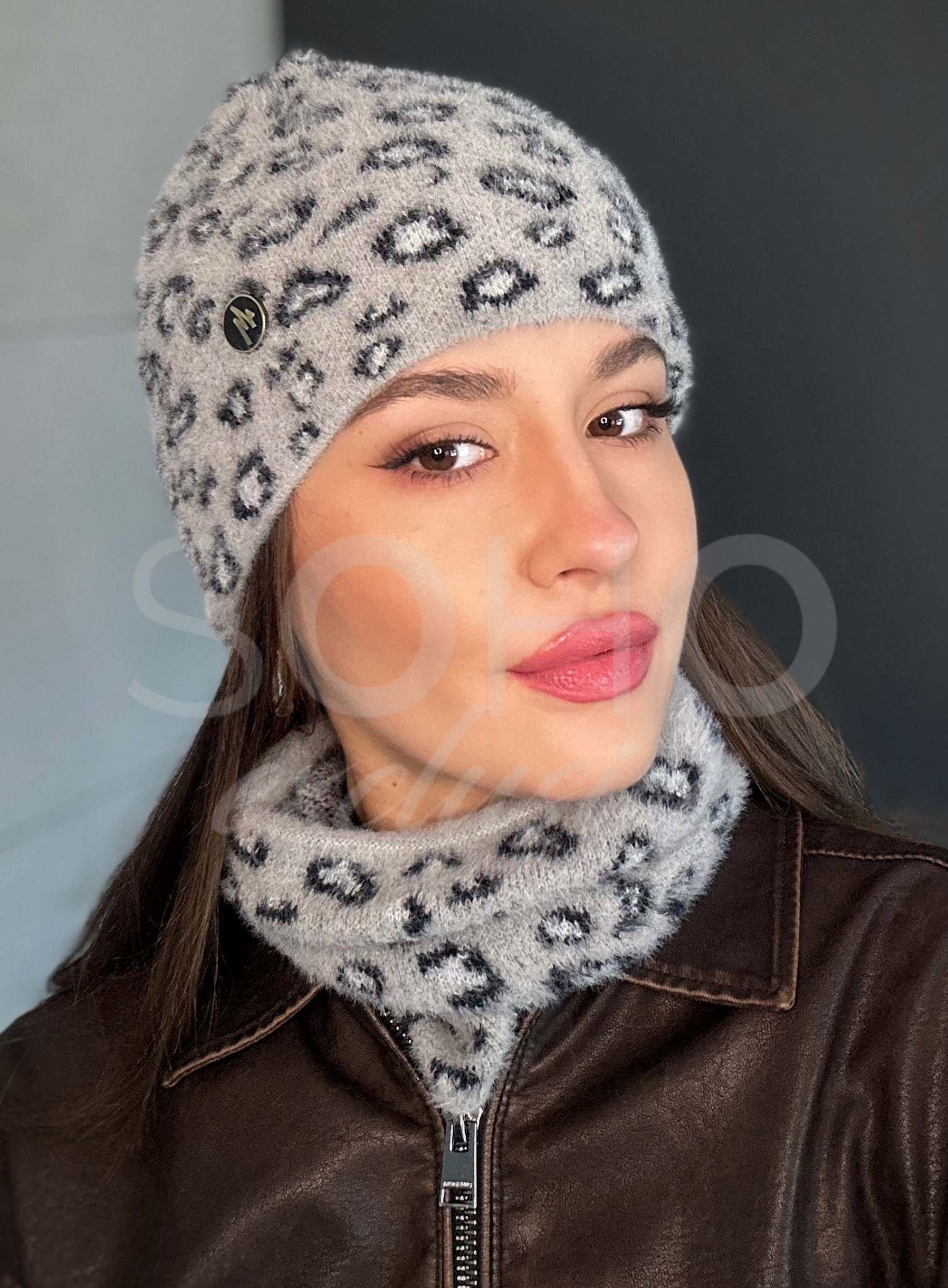 Komplet damski czapka wywijana komin golf tuba ciepły alpaka panterka szary 2996