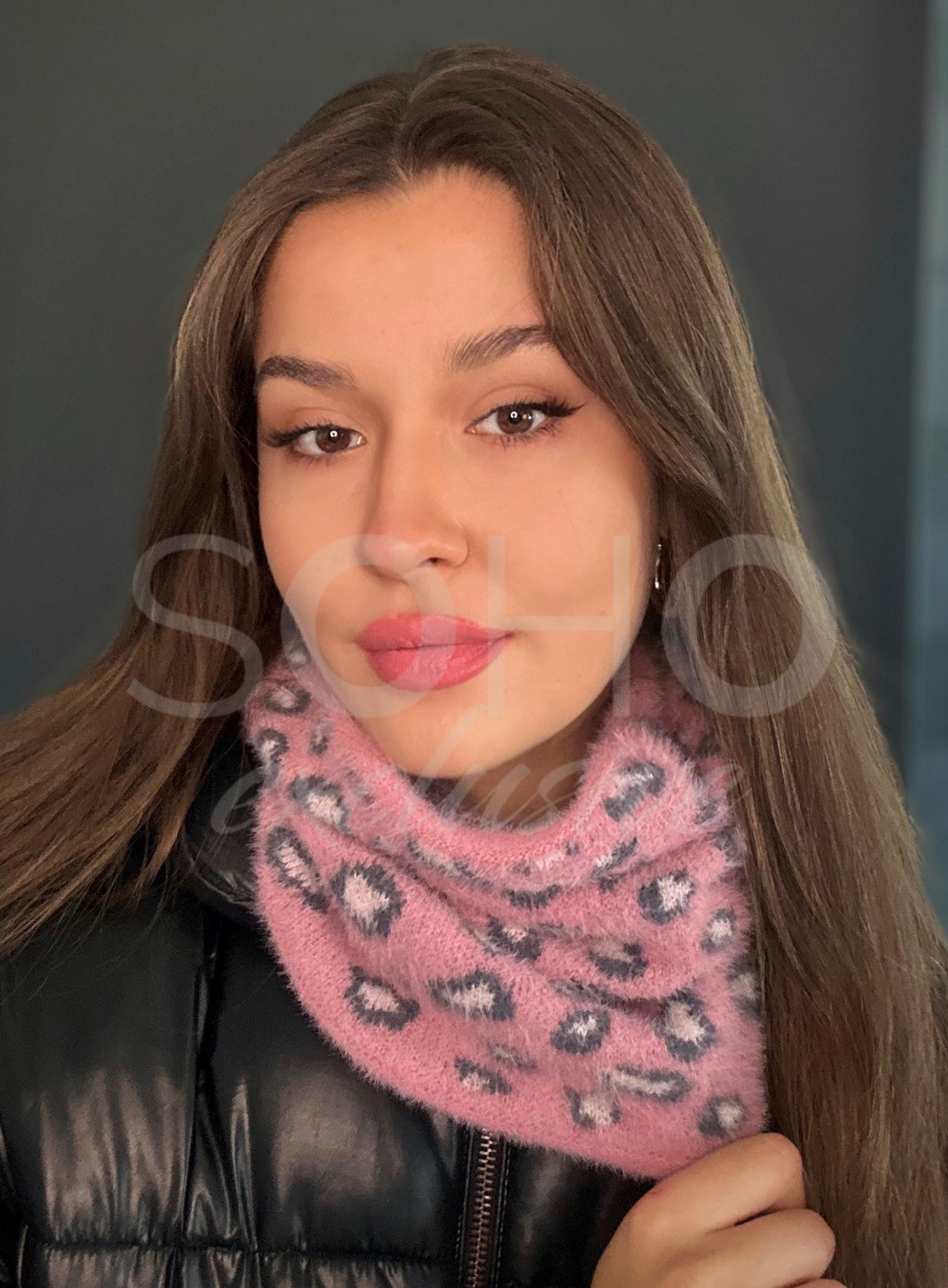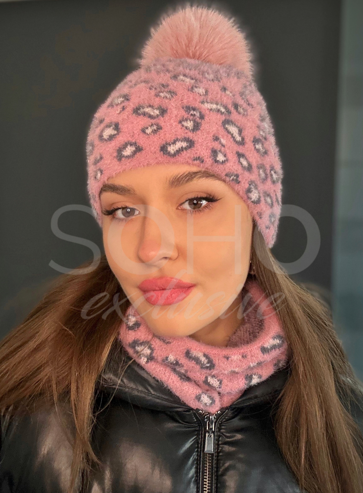 Komplet damski czapka wywijana pompon komin golf tuba ciepły alpaka panterka brudny różowy 2995
