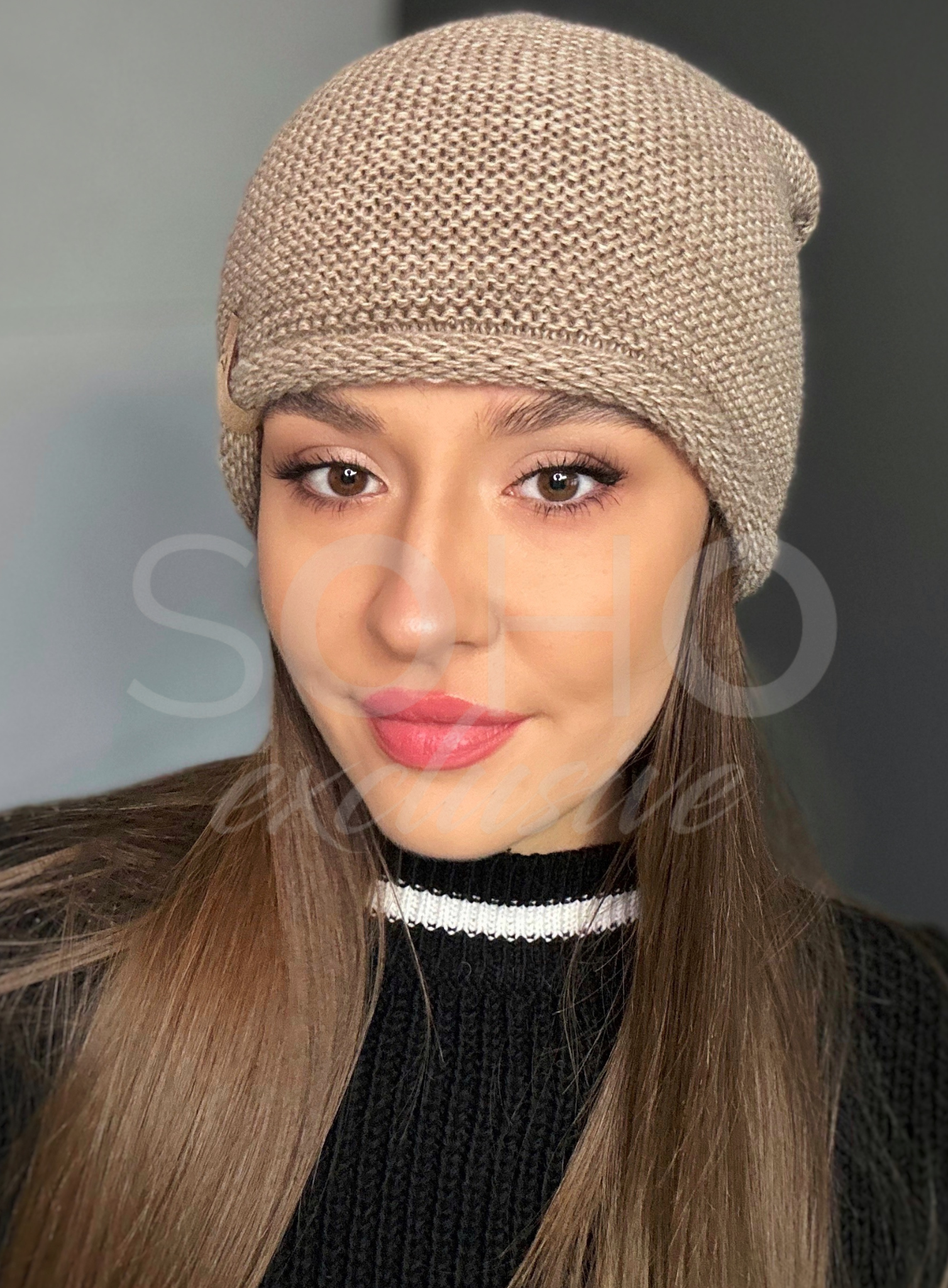 Czapka typu beanie/krasnal, delikatnie opadająca, z podwójnego materiału, z subtelnym logowaniem.