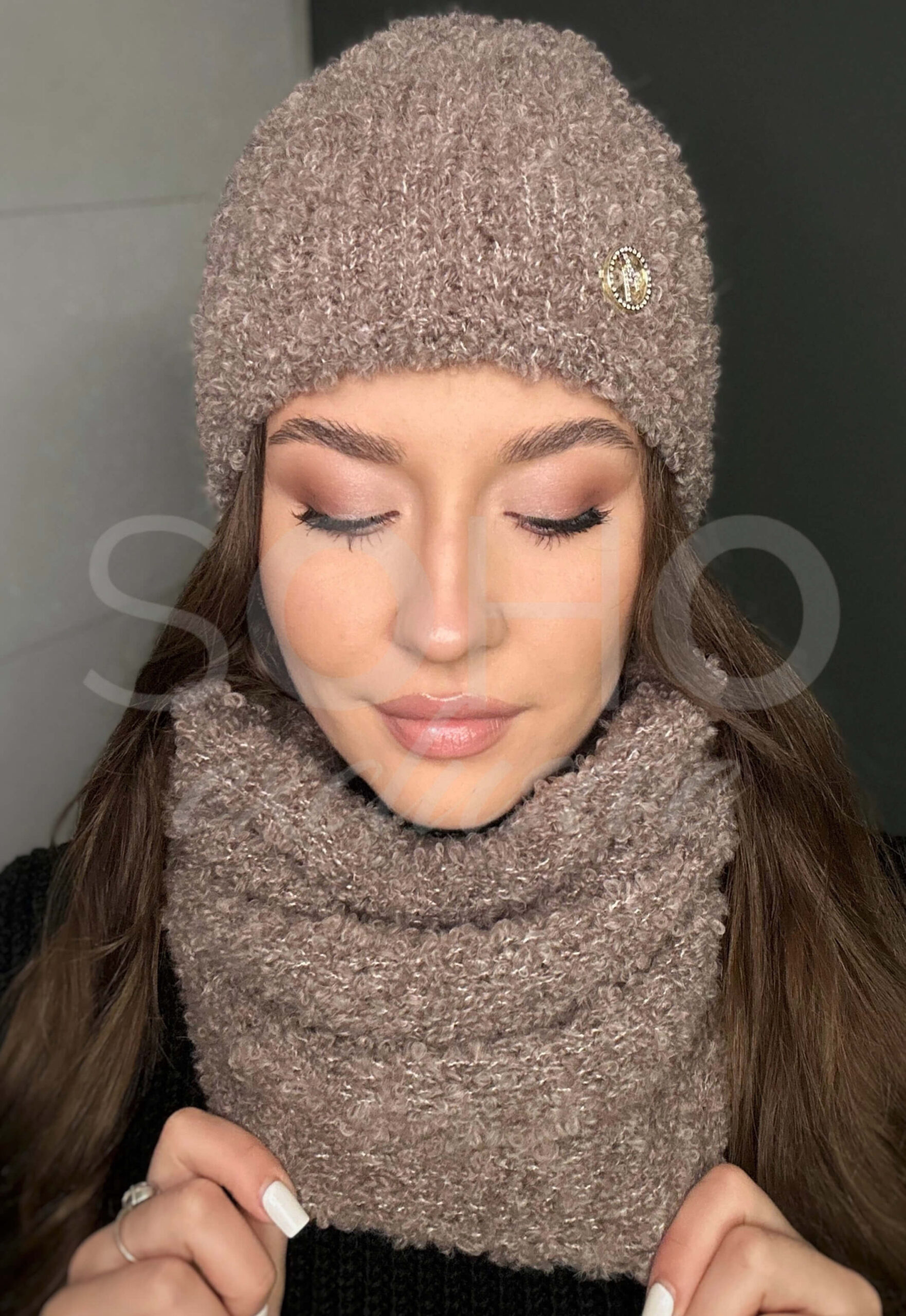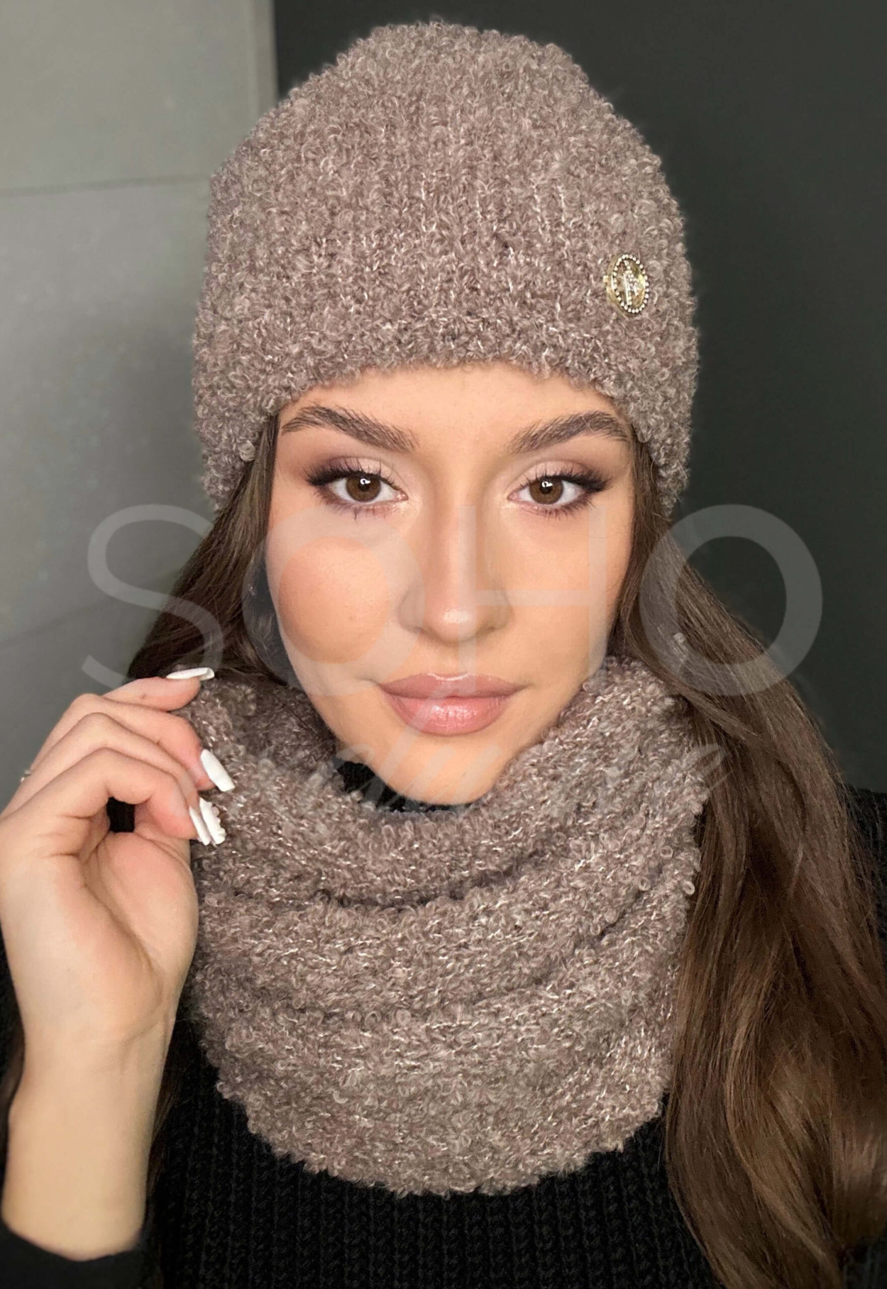 Komplet damski młodzież czapka beanie komin golf na zimę bukla boucle mokka 3071