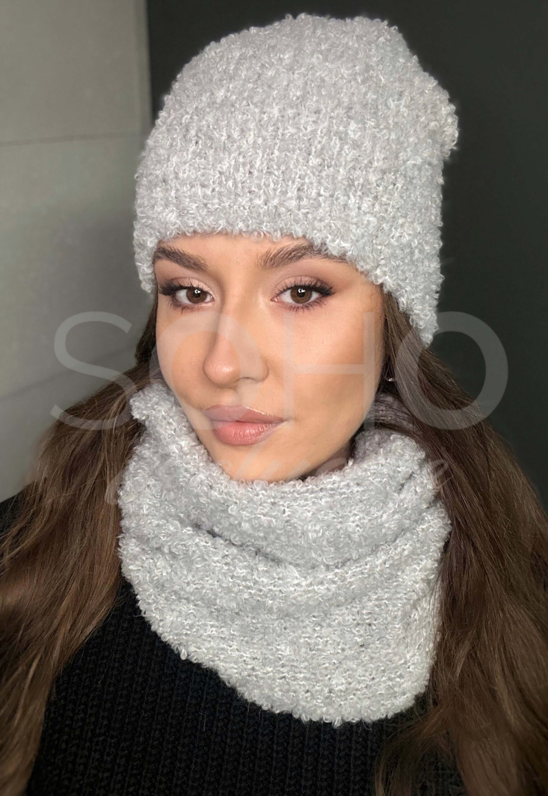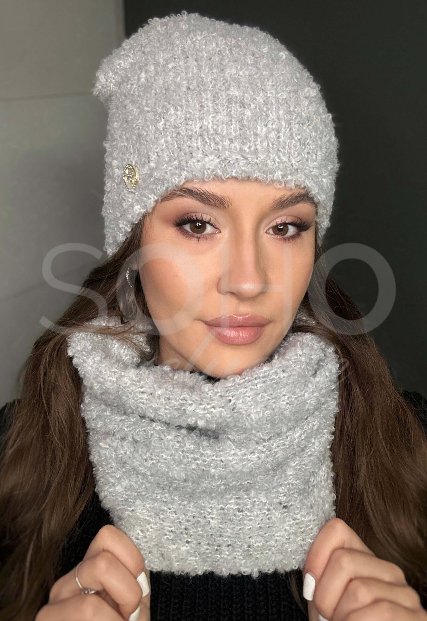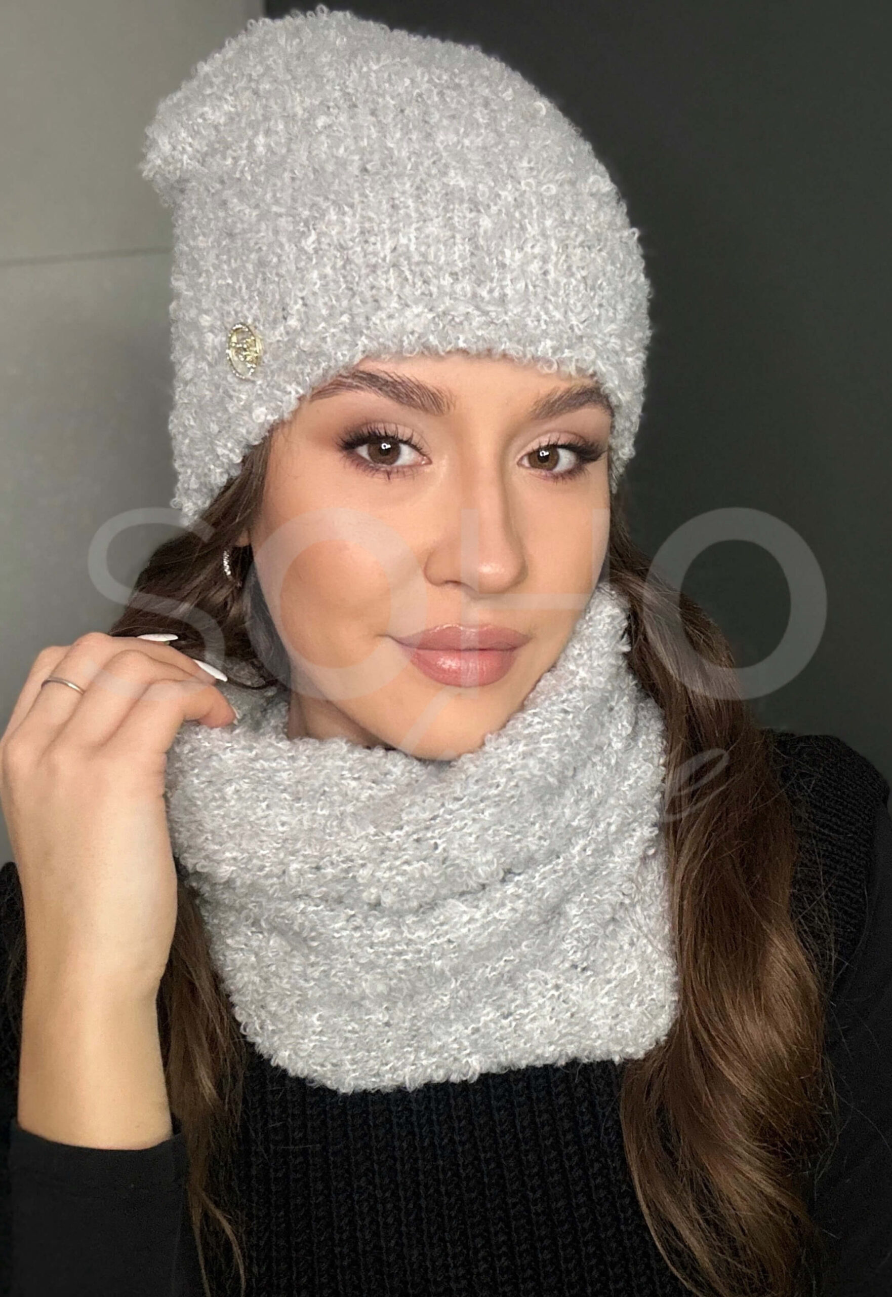 Komplet damski młodzież czapka beanie komin golf na zimę bukla boucle szary 3071