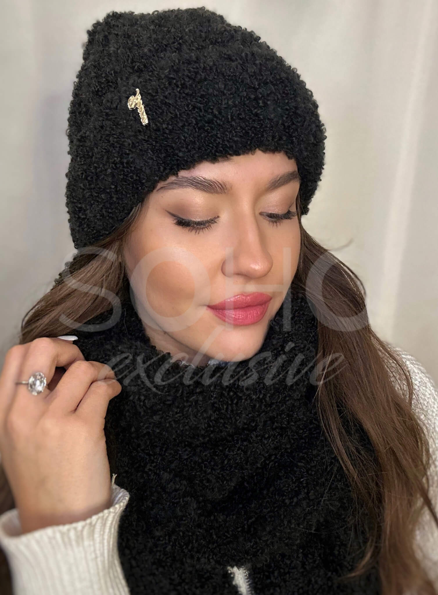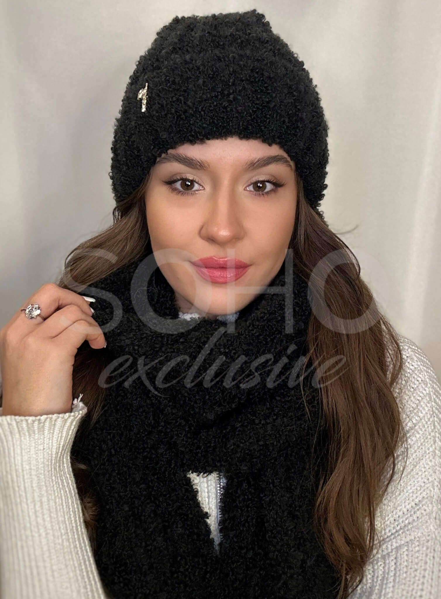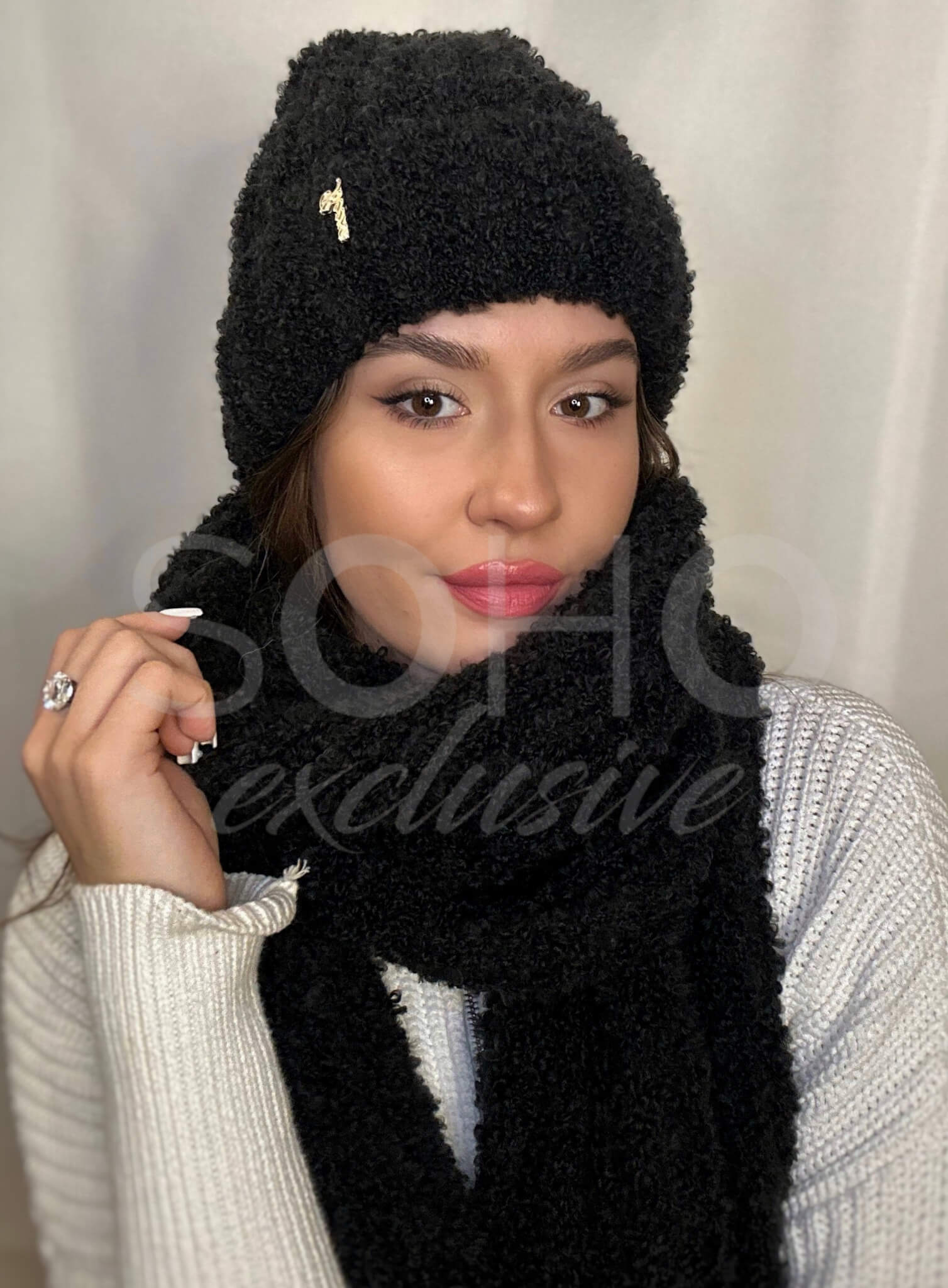 Komplet damski młodzież czapka beanie szal długi zima boucle wełna czarny 3067
