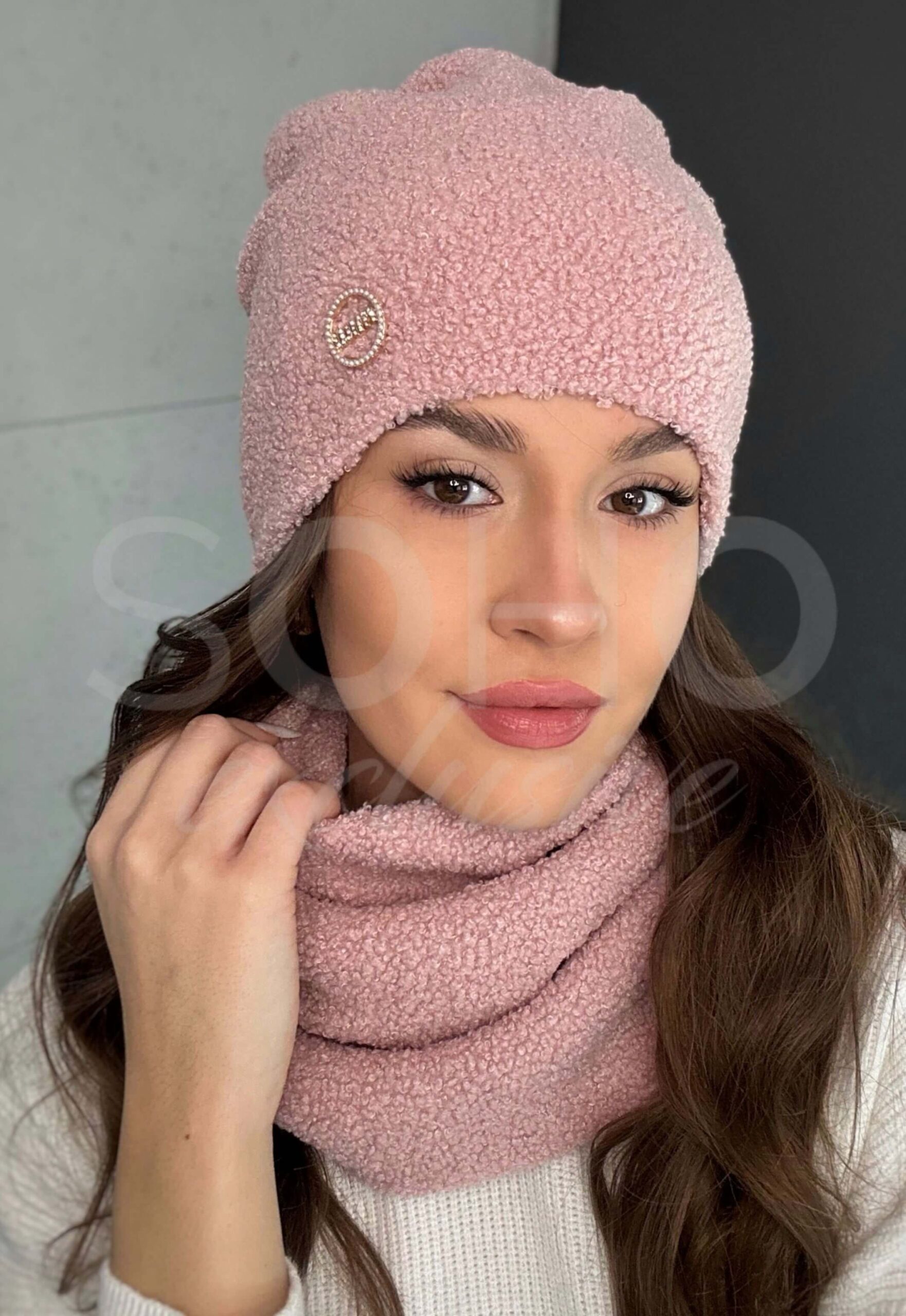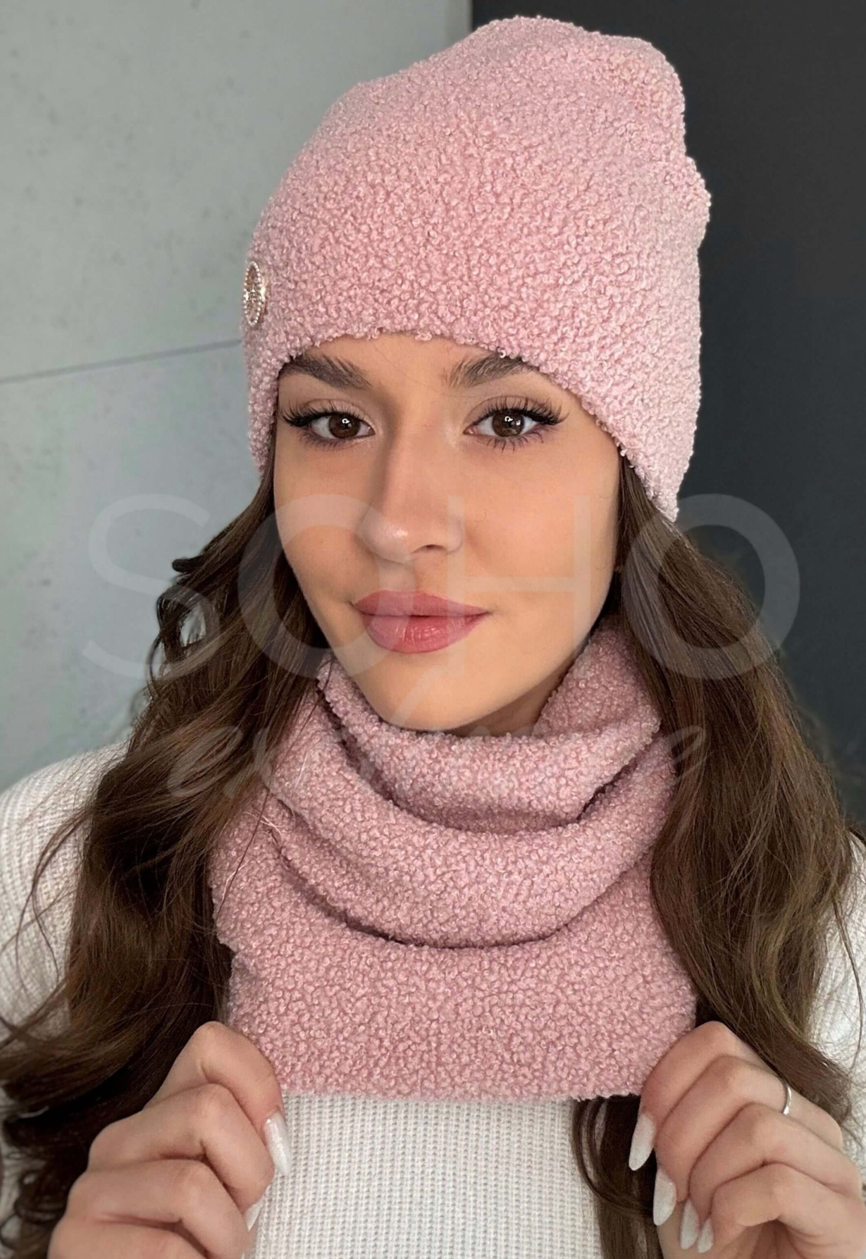 Komplet damski młodzież czapka komin golf zimowy baranek viral polski pudrowy różowy 3077
