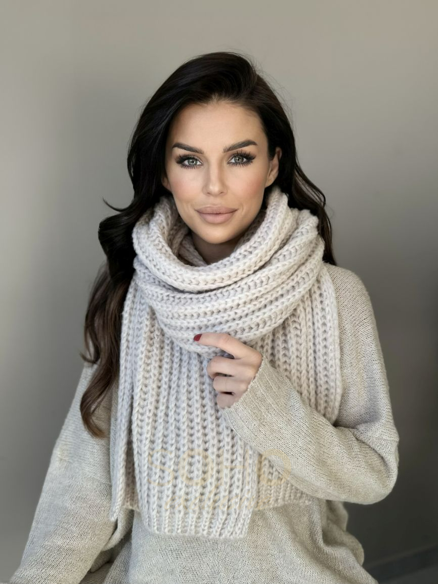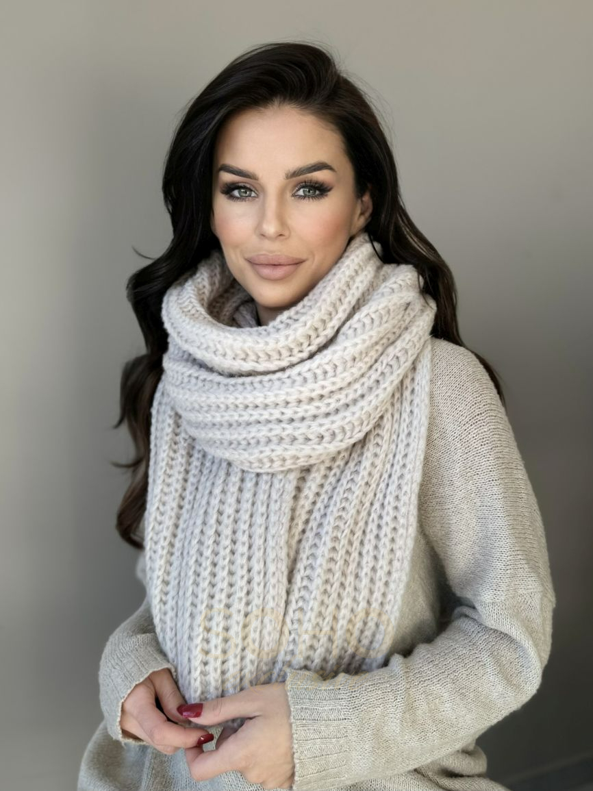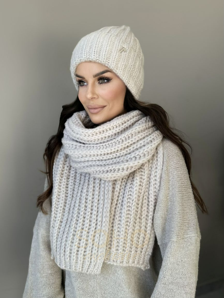 Komplet damski młodzieżowy czapka beanie szal długi wełna zimowy na zimę beżowy 2994