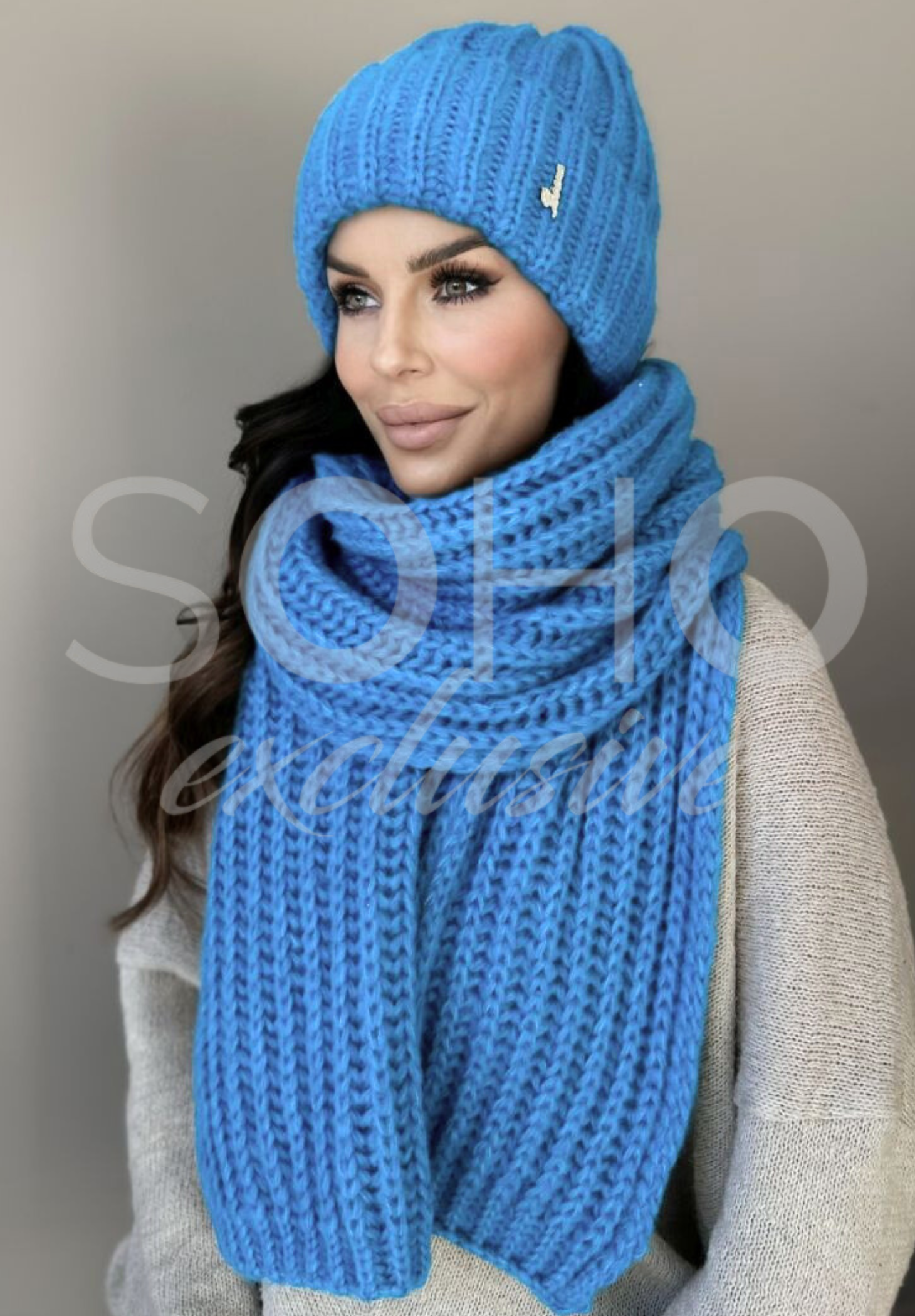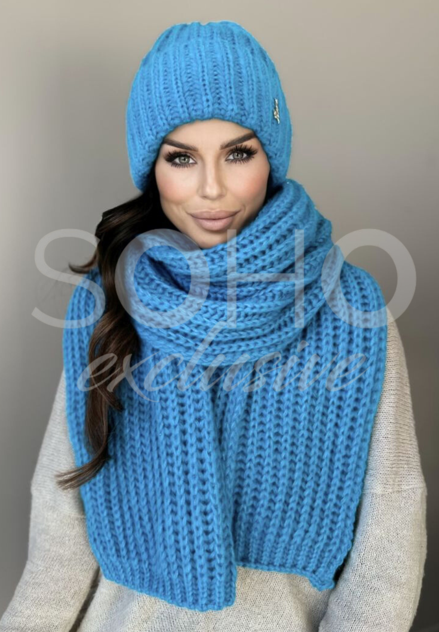 Komplet damski młodzieżowy czapka beanie szal długi wełna zimowy na zimę błękitny 2994