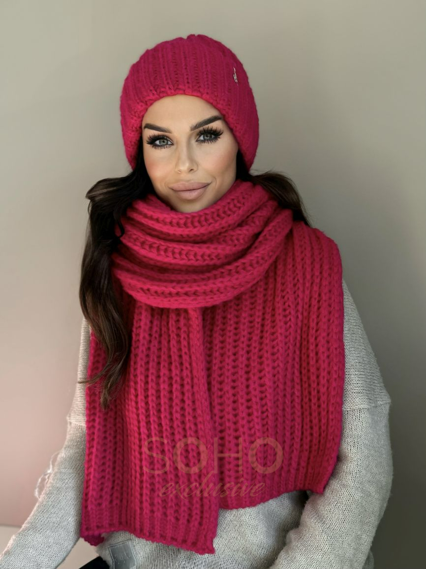 Komplet damski młodzieżowy czapka beanie szal długi wełna zimowy na zimę malinowy 2994