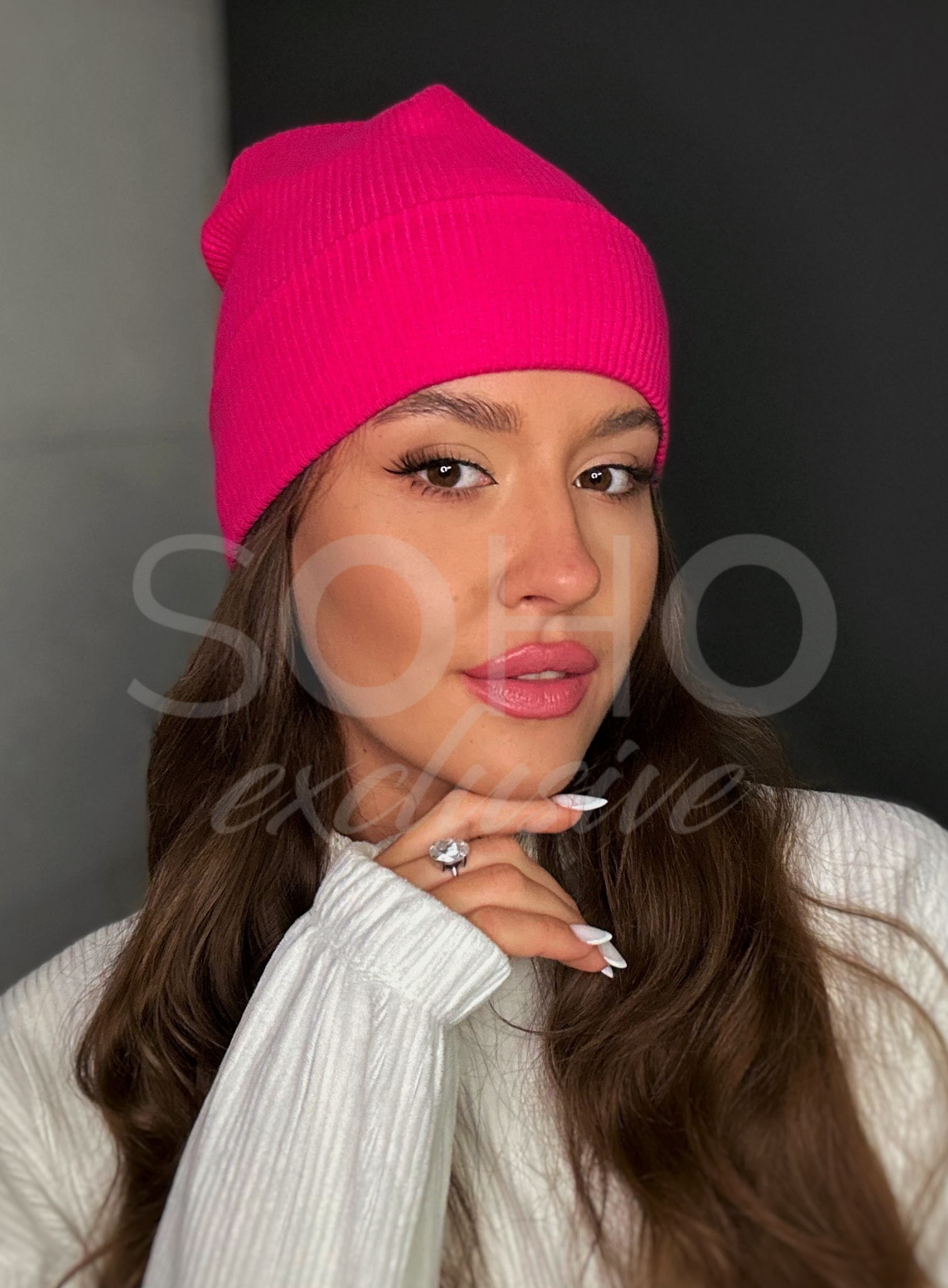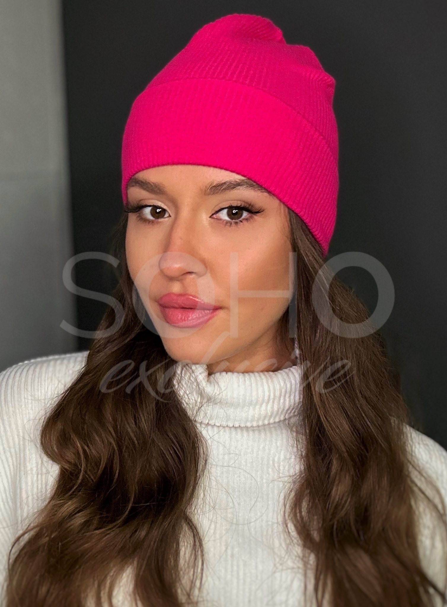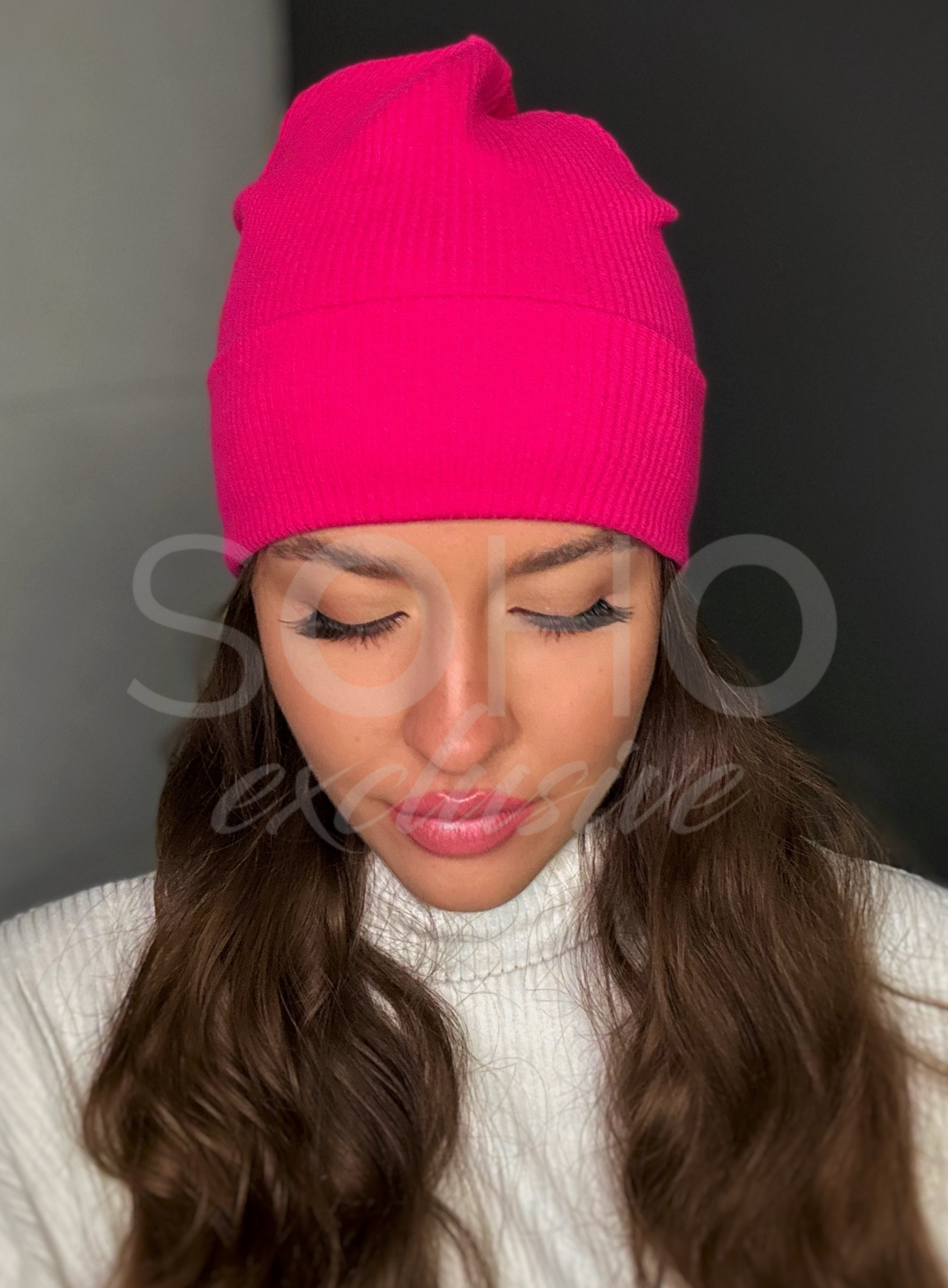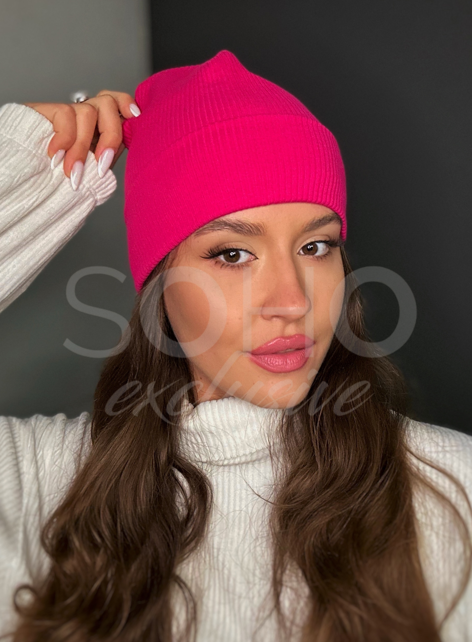 Czapka typu beanie/krasnal, delikatnie opadająca, wywijana.